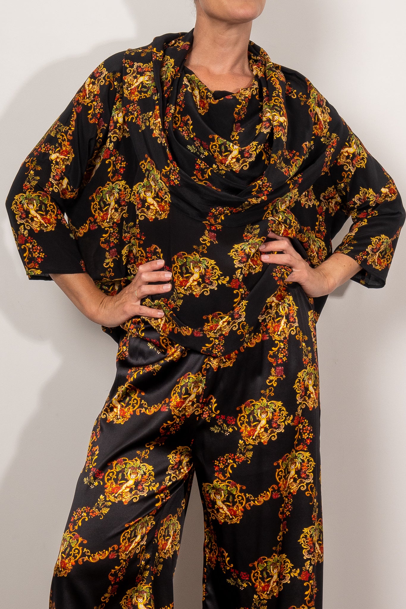 Get ready for a date night in the M.A. Dainty Datenight Top! This silk top features batwing sleeves and a versatile scarf attachment that can be worn in the front or back. The vintage style 'heavenly' print adds a bold touch. Pair it with the matching Gracie pant for a complete and stylish look.