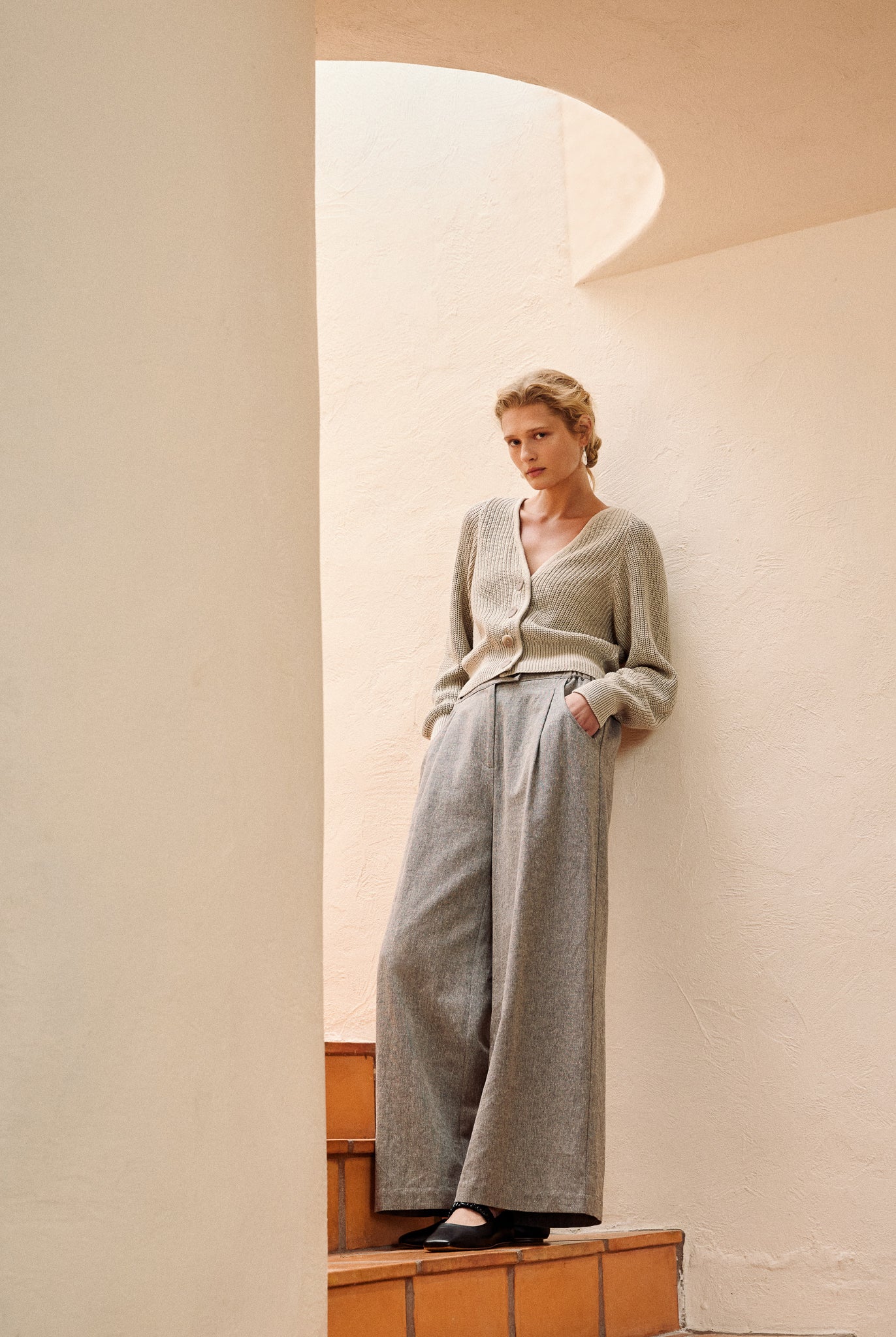 Let’s start with the building blocks: a great knit and a pair of trousers. This combination is timeless and always appropriate. Choose a refined knit in a neutral tone, like grey, camel or cream, and pair it with structured, high-rise trousers for a silhouette that feels both relaxed and elevated.