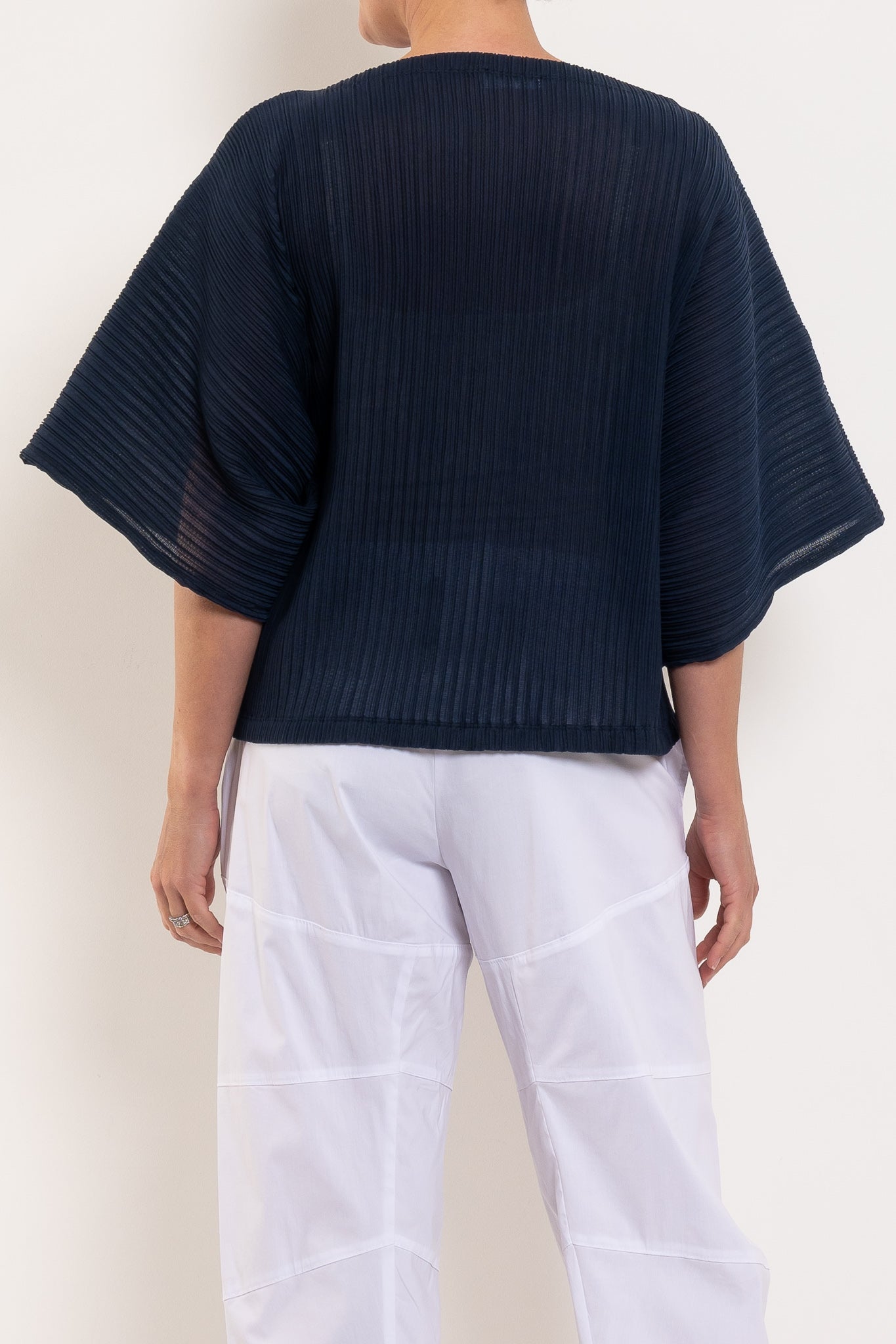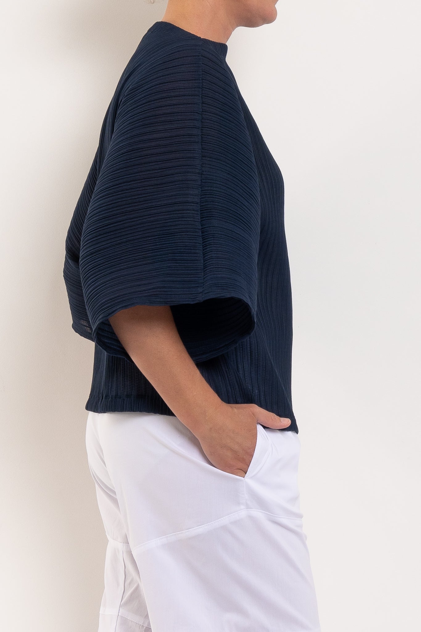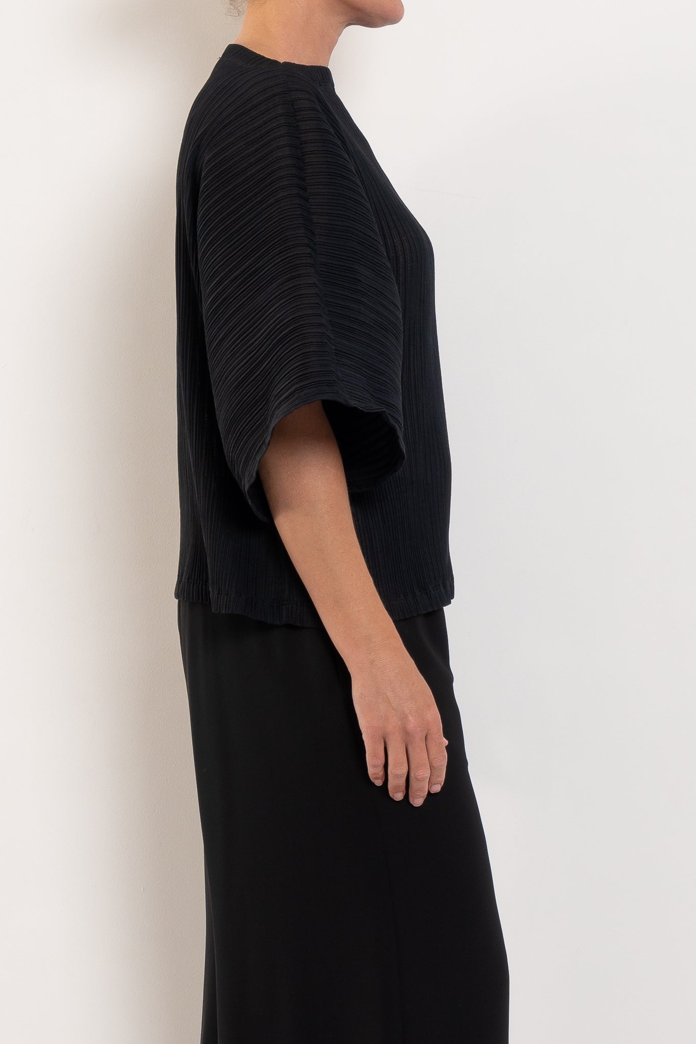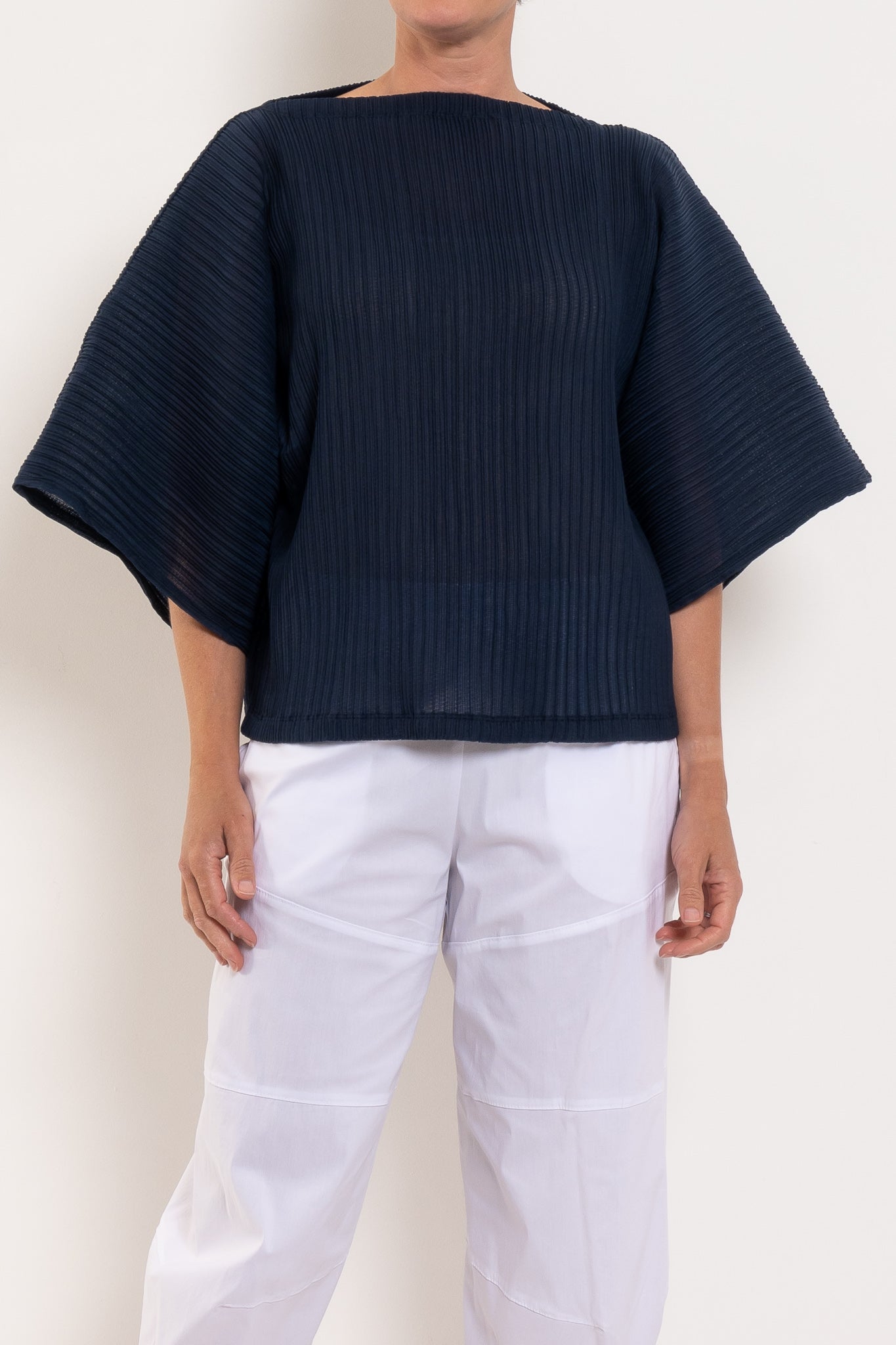 Light, airy, and beautifully sculptural, this shell is crafted in Miso Pleat Chiffon — a Japanese-made tricot knit with a soft pleated texture. The relaxed silhouette and exaggerated sleeve create movement and drape, while the boat neckline flatters the shoulders and collarbone. Style it with wide-leg pants or a soft skirt for relaxed polish that suits any occasion.