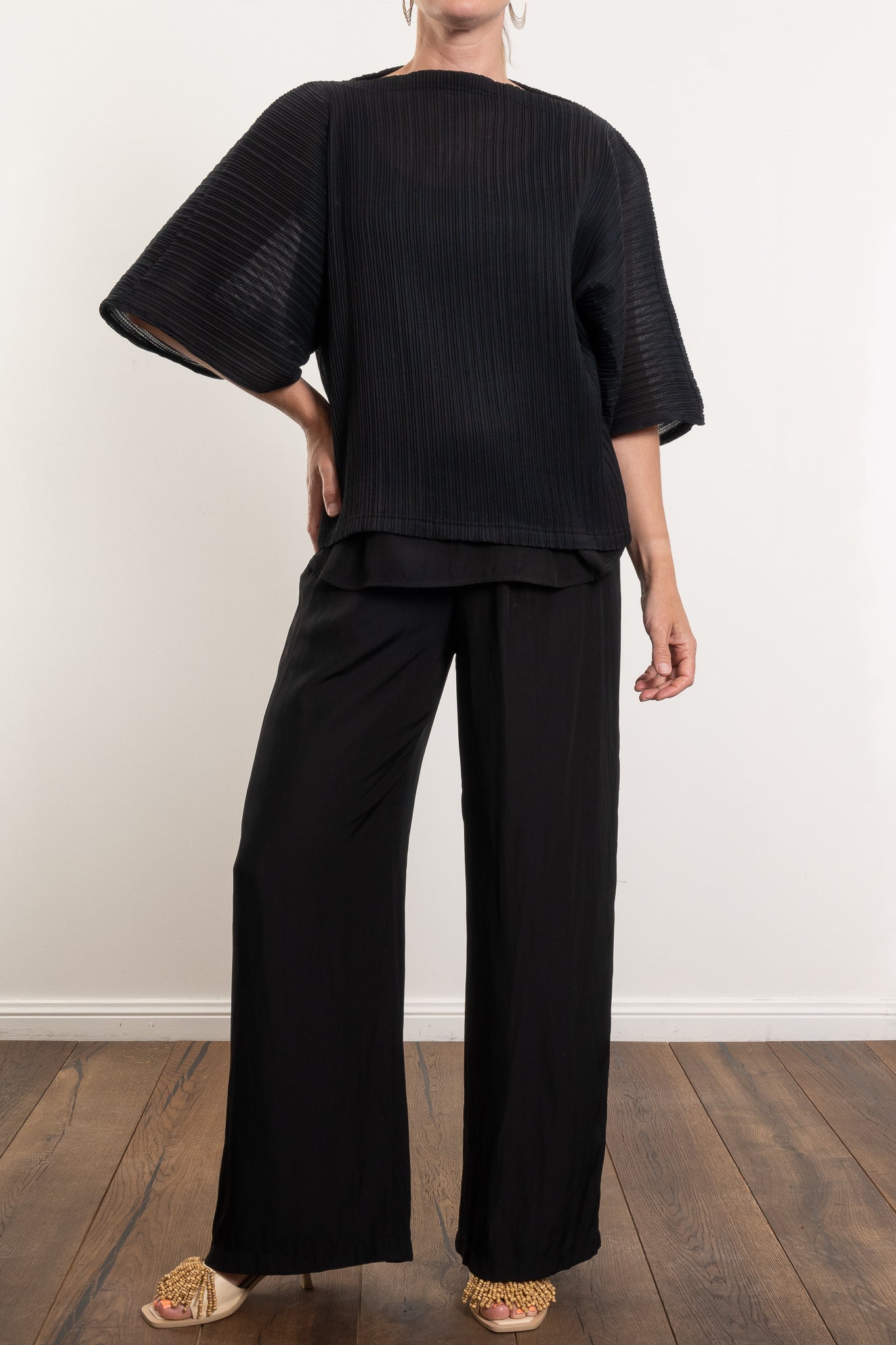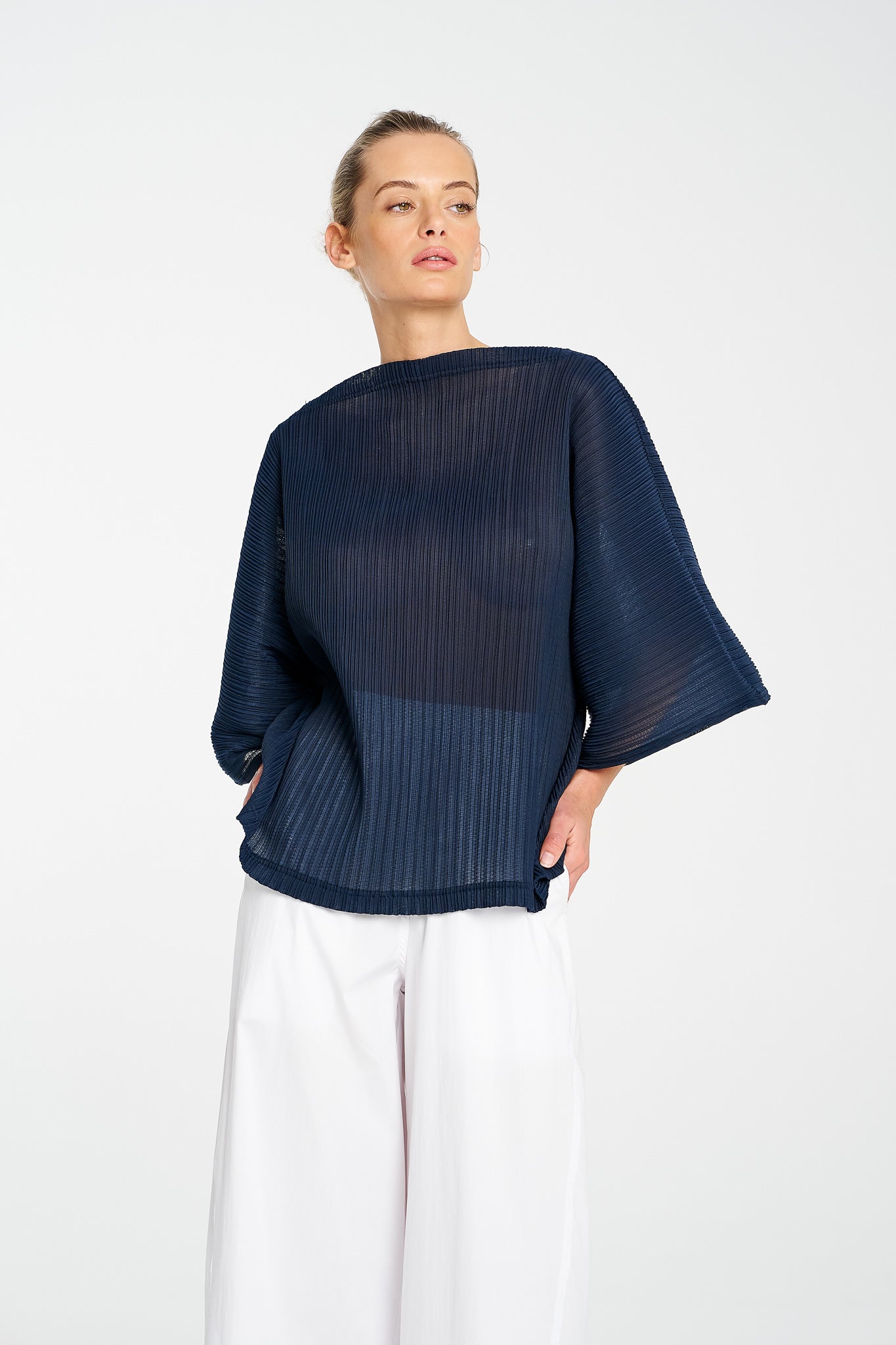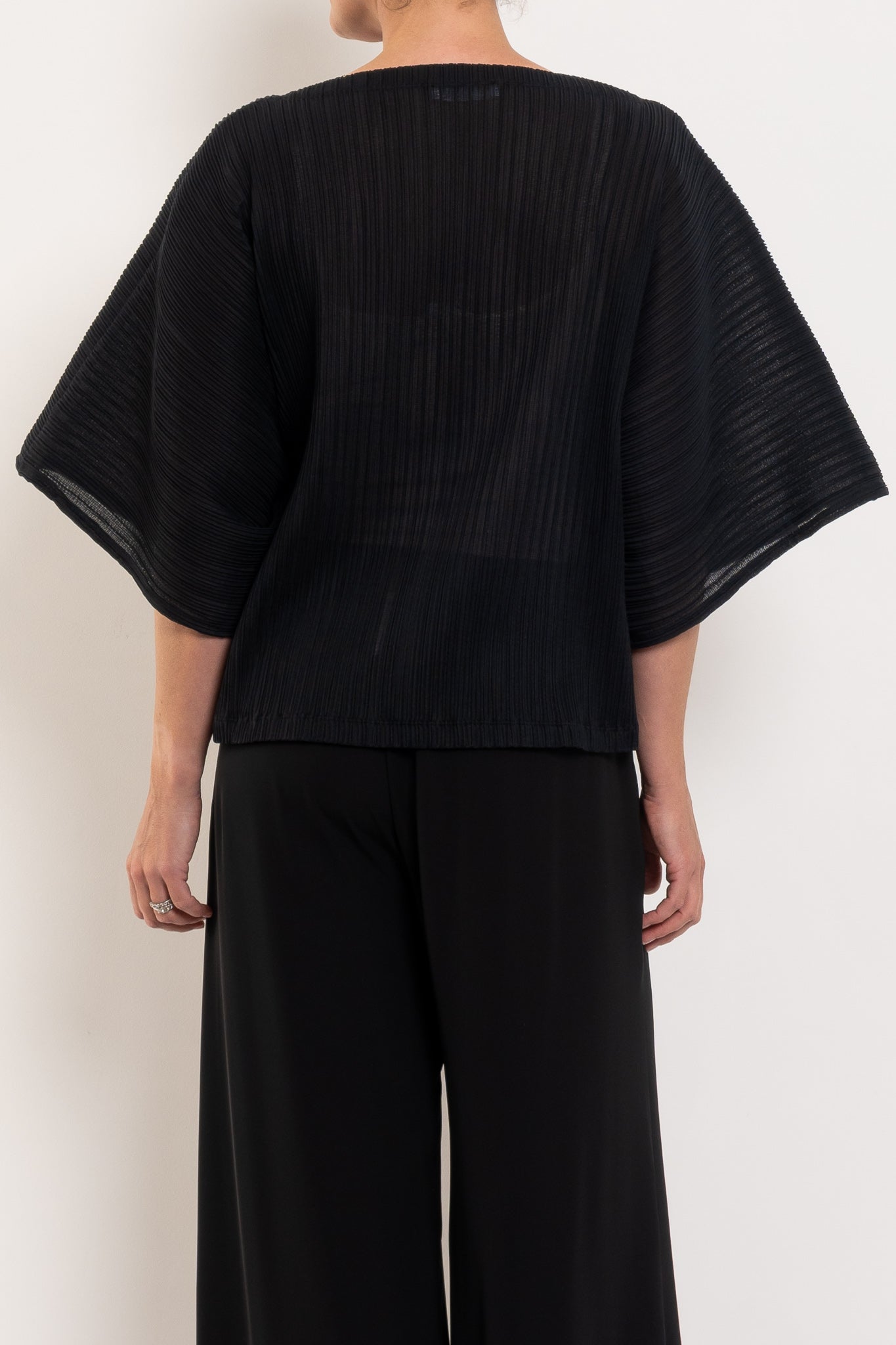 Light, airy, and beautifully sculptural, this shell is crafted in Miso Pleat Chiffon — a Japanese-made tricot knit with a soft pleated texture. The relaxed silhouette and exaggerated sleeve create movement and drape, while the boat neckline flatters the shoulders and collarbone. Style it with wide-leg pants or a soft skirt for relaxed polish that suits any occasion.