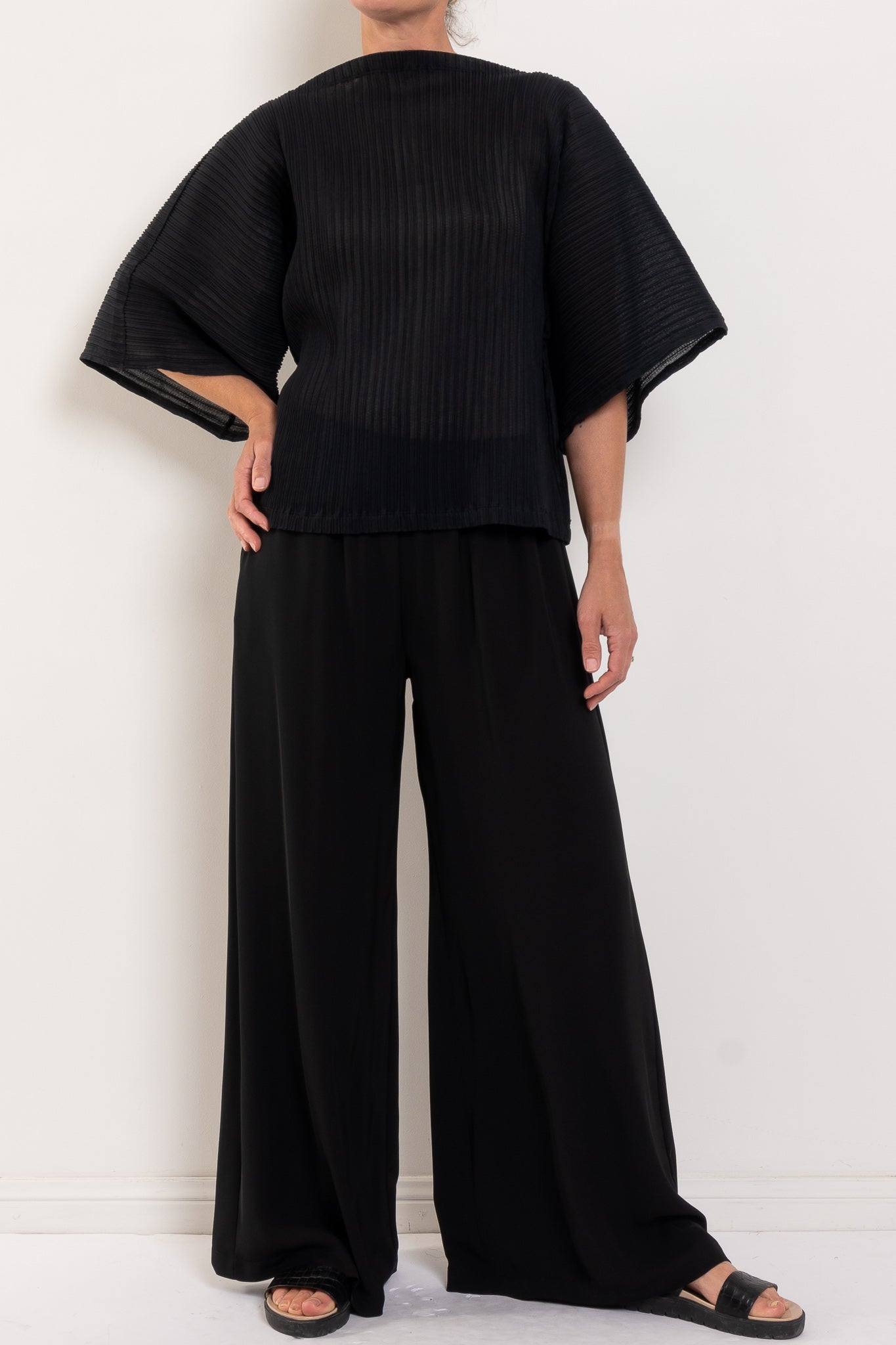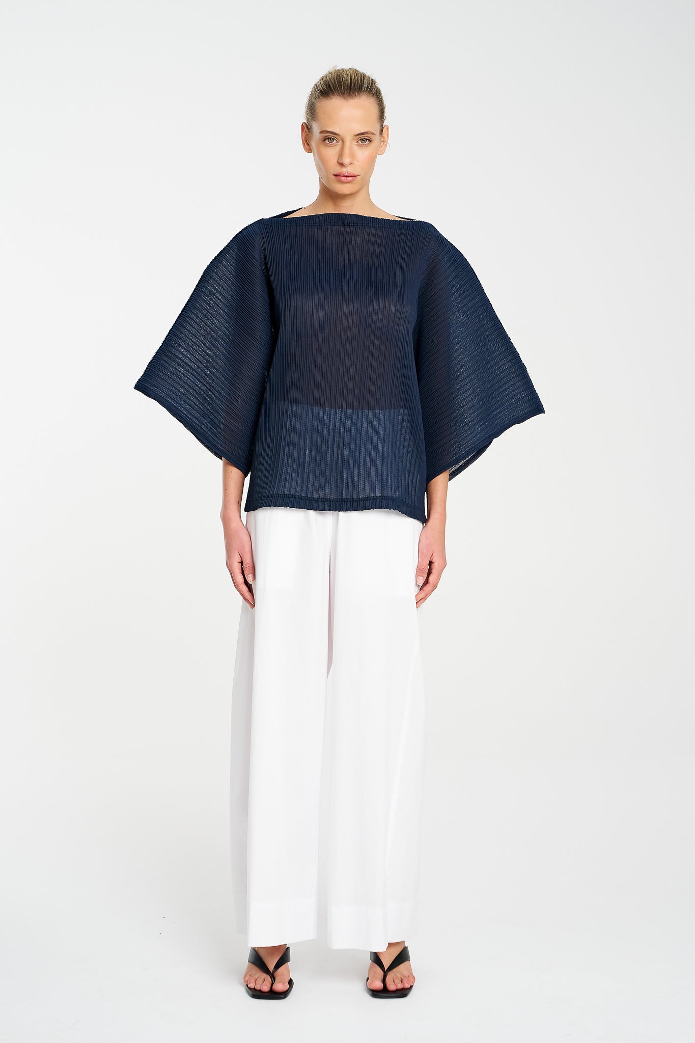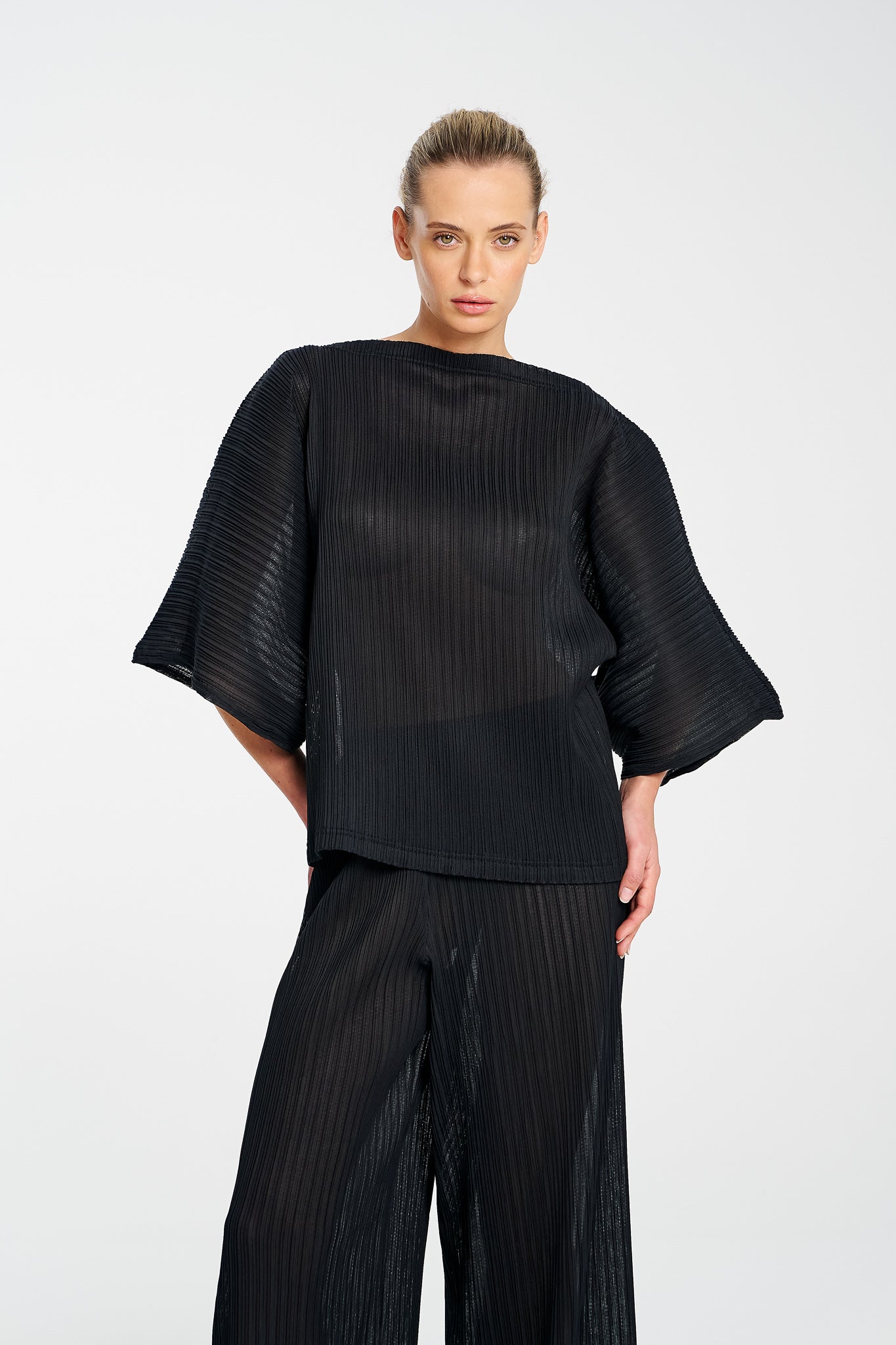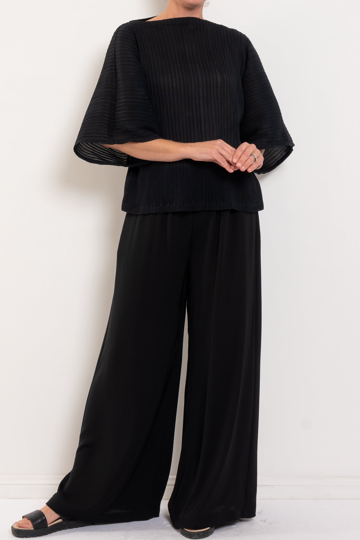 Light, airy, and beautifully sculptural, this shell is crafted in Miso Pleat Chiffon — a Japanese-made tricot knit with a soft pleated texture. The relaxed silhouette and exaggerated sleeve create movement and drape, while the boat neckline flatters the shoulders and collarbone. Style it with wide-leg pants or a soft skirt for relaxed polish that suits any occasion.