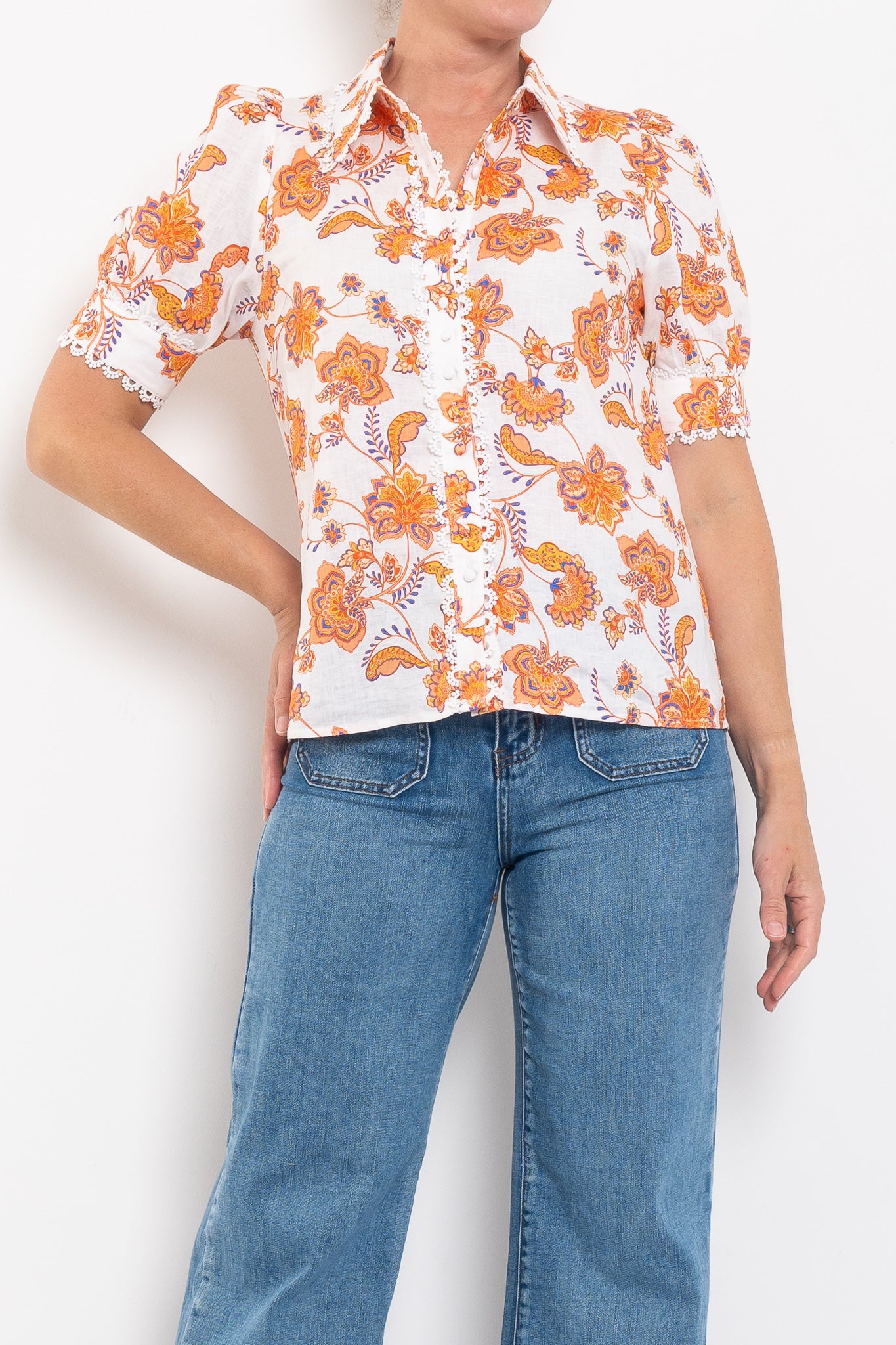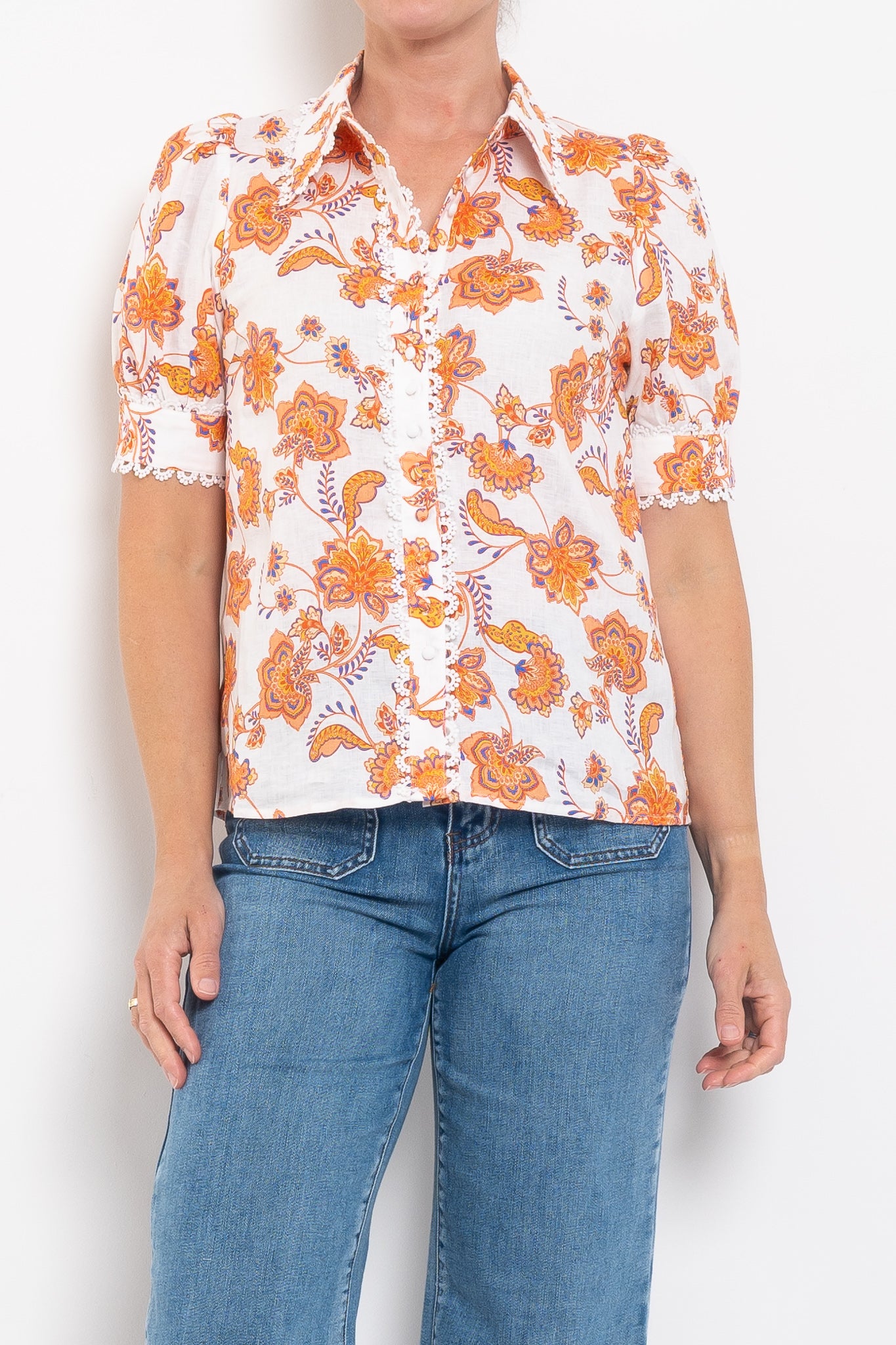 - Scallop lace trim along placket, collar and cuffs