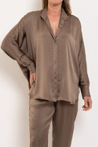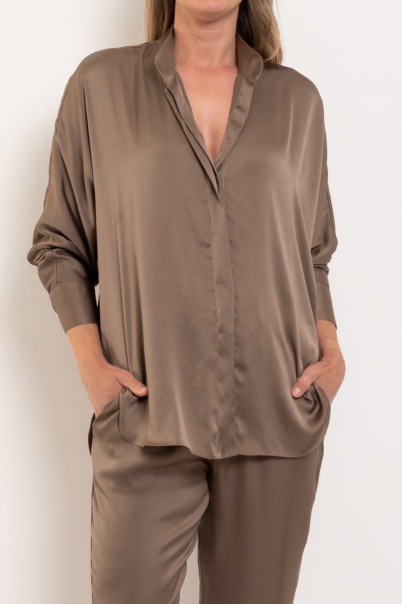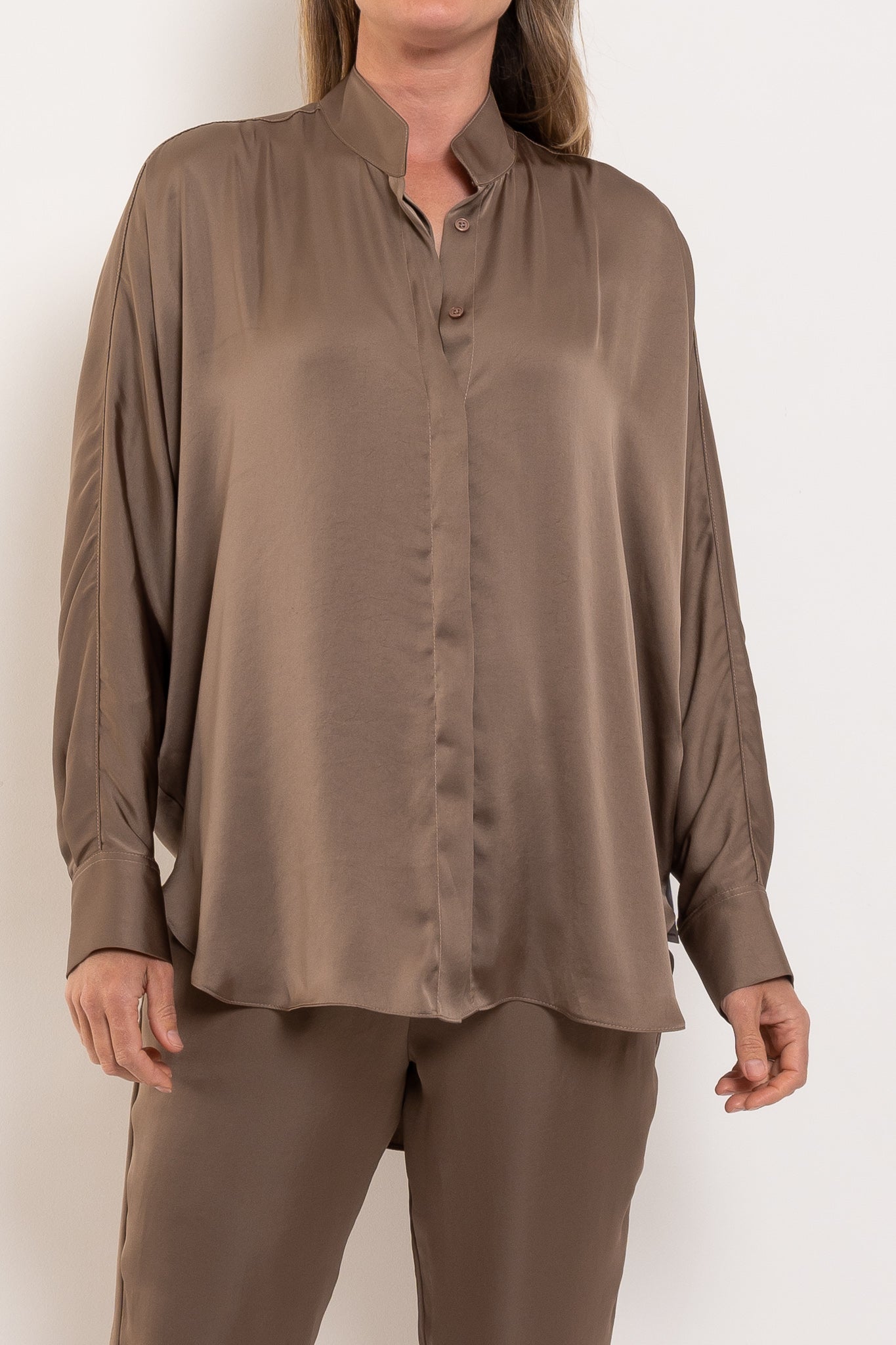 The oversized silhouette and relaxed dolman sleeve create effortless movement, while refined details like the stand collar and concealed placket keep the look polished. Whether styled loose over tailored pants, half-tucked, or layered under knits and coats, this is a quietly luxurious piece designed to work year after year.