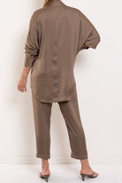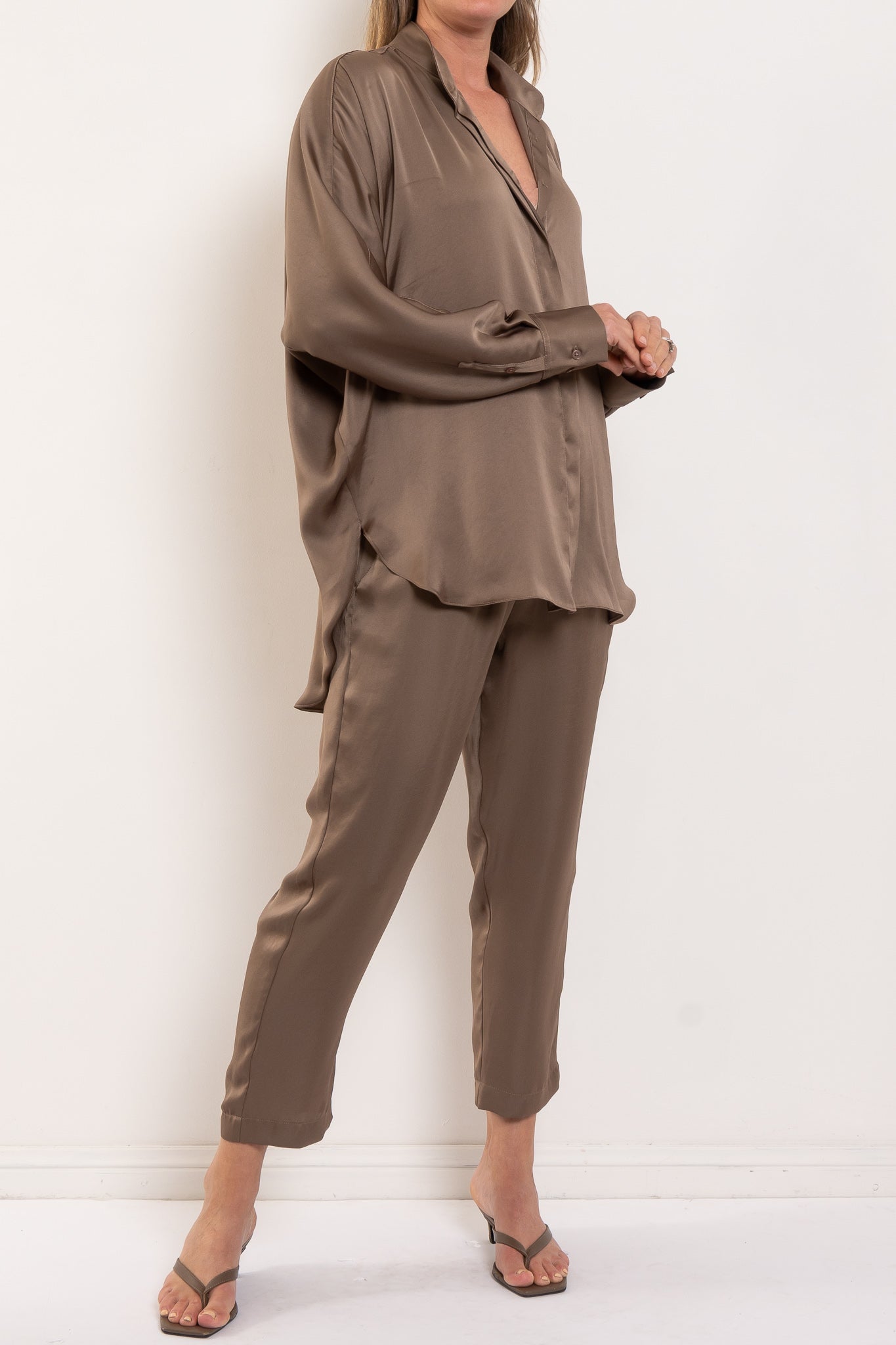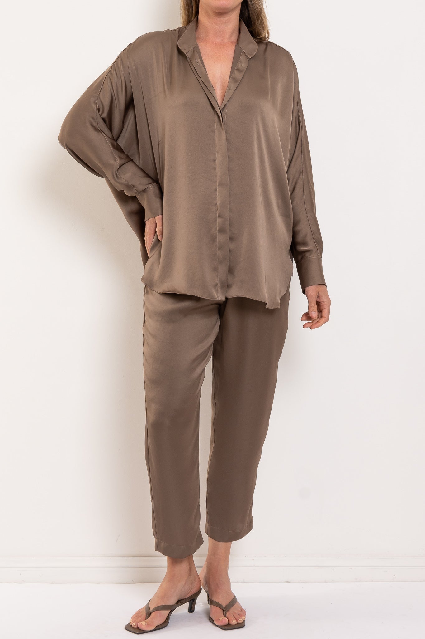 Crafted from Mela Purdie’s Mirror Satin, this fine gauge, featherlight satin has an elegant sheen that catches the light subtly rather than shouting. The airflow finish allows the fabric to float away from the body, making it breathable, crease-resistant and incredibly comfortable — perfect for travel, layering and long days that turn into evenings.