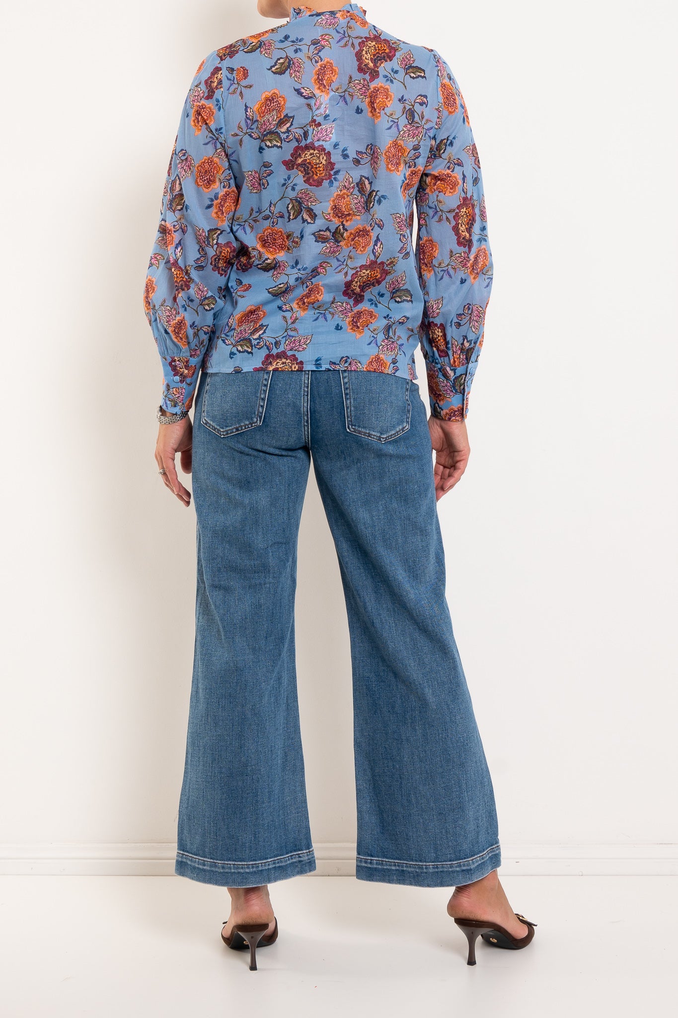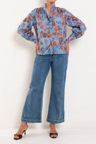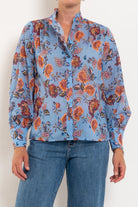 Elevate your everyday wardrobe with this sophisticated long-sleeve blouse, featuring a charming ruffle neckline and gathered blouson sleeves that add movement and dimension. Fabric-covered buttons and finished cuffs deliver refined detailing throughout. The Twilight Bloom print strikes the perfect balance—a cool blue base warmed by delicate florals creates a versatile piece that transitions seamlessly from office to weekend. Feminine yet effortless, this blouse pairs beautifully with tailored trousers or your favourite denim.