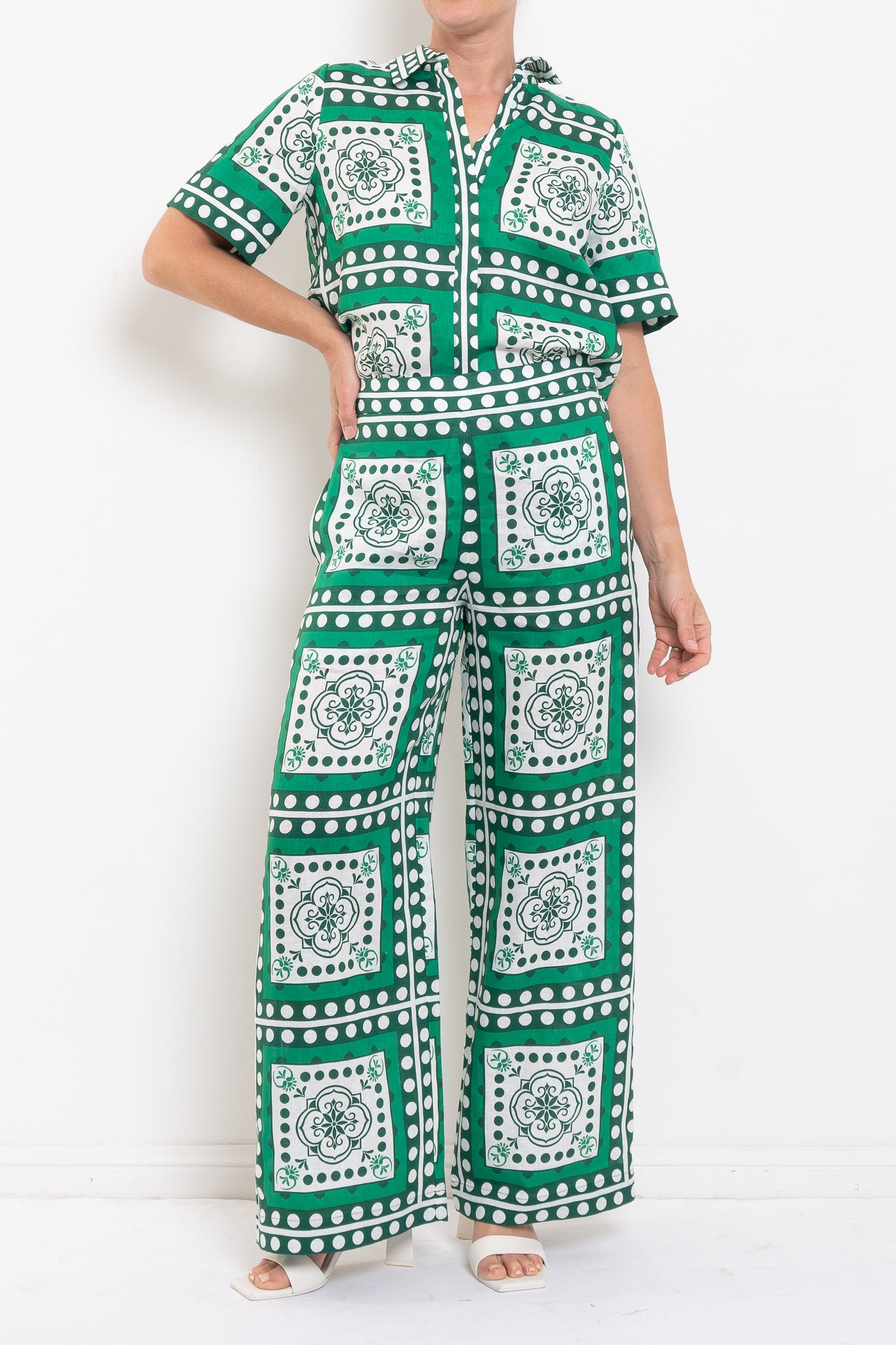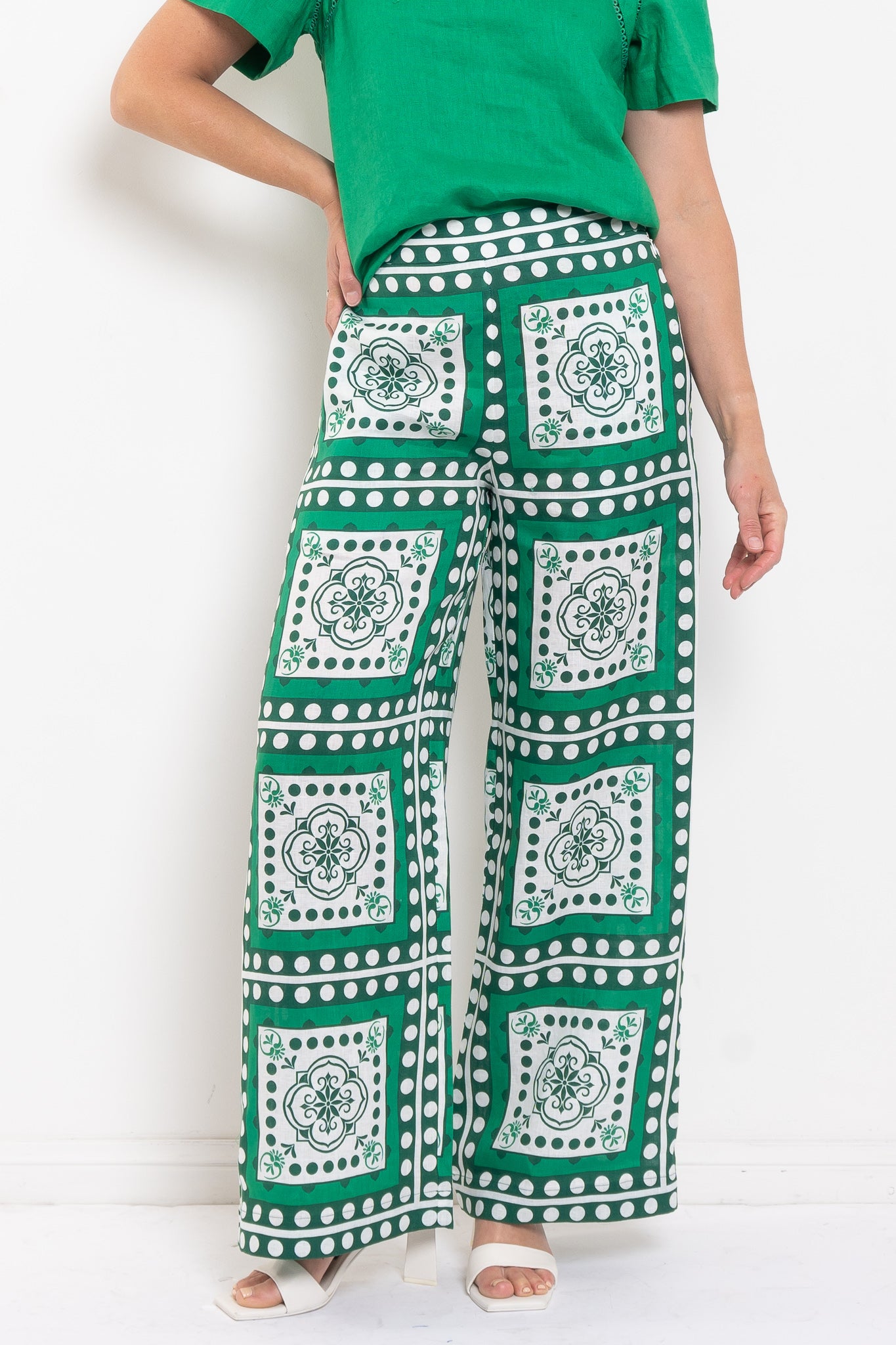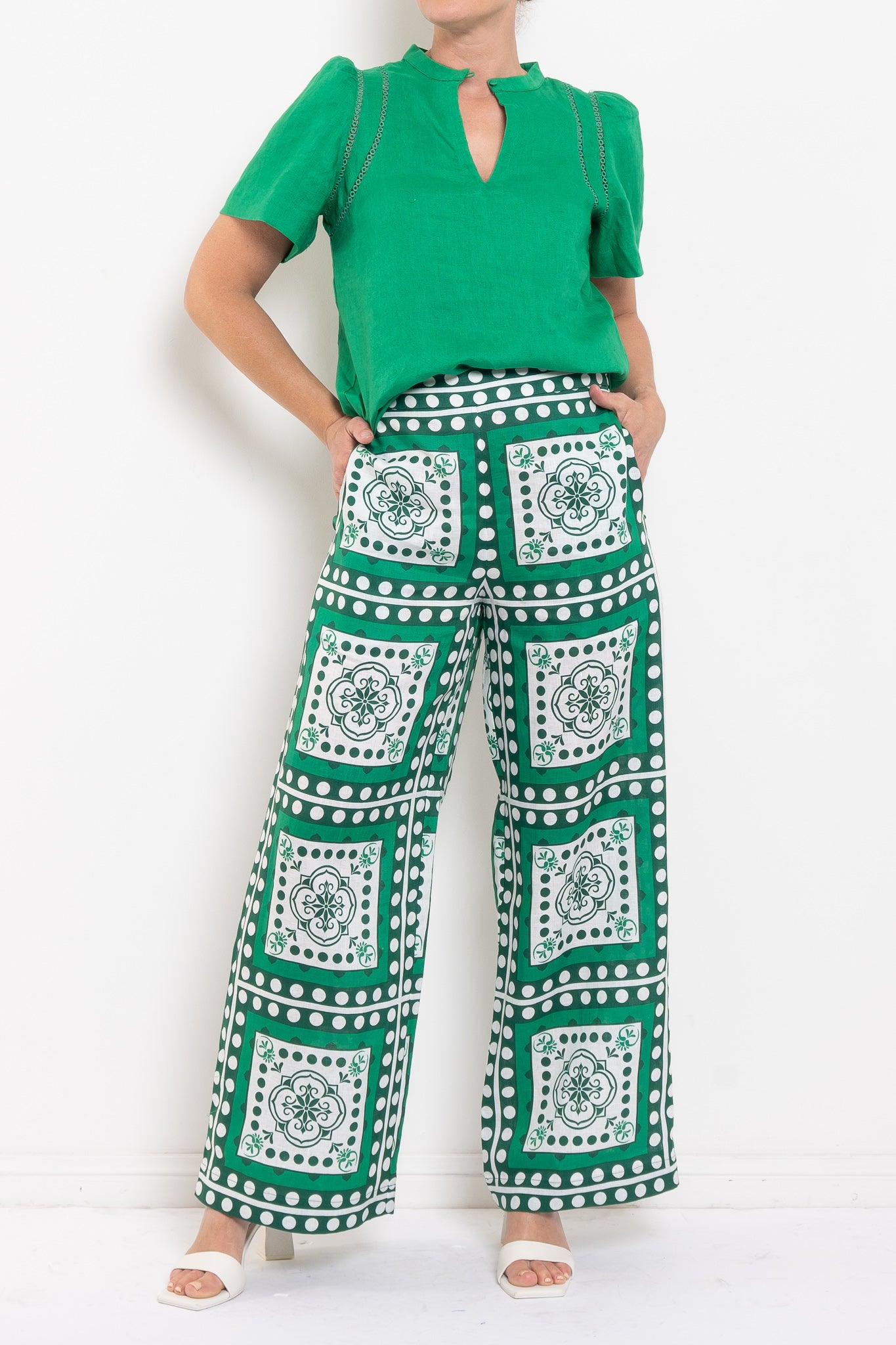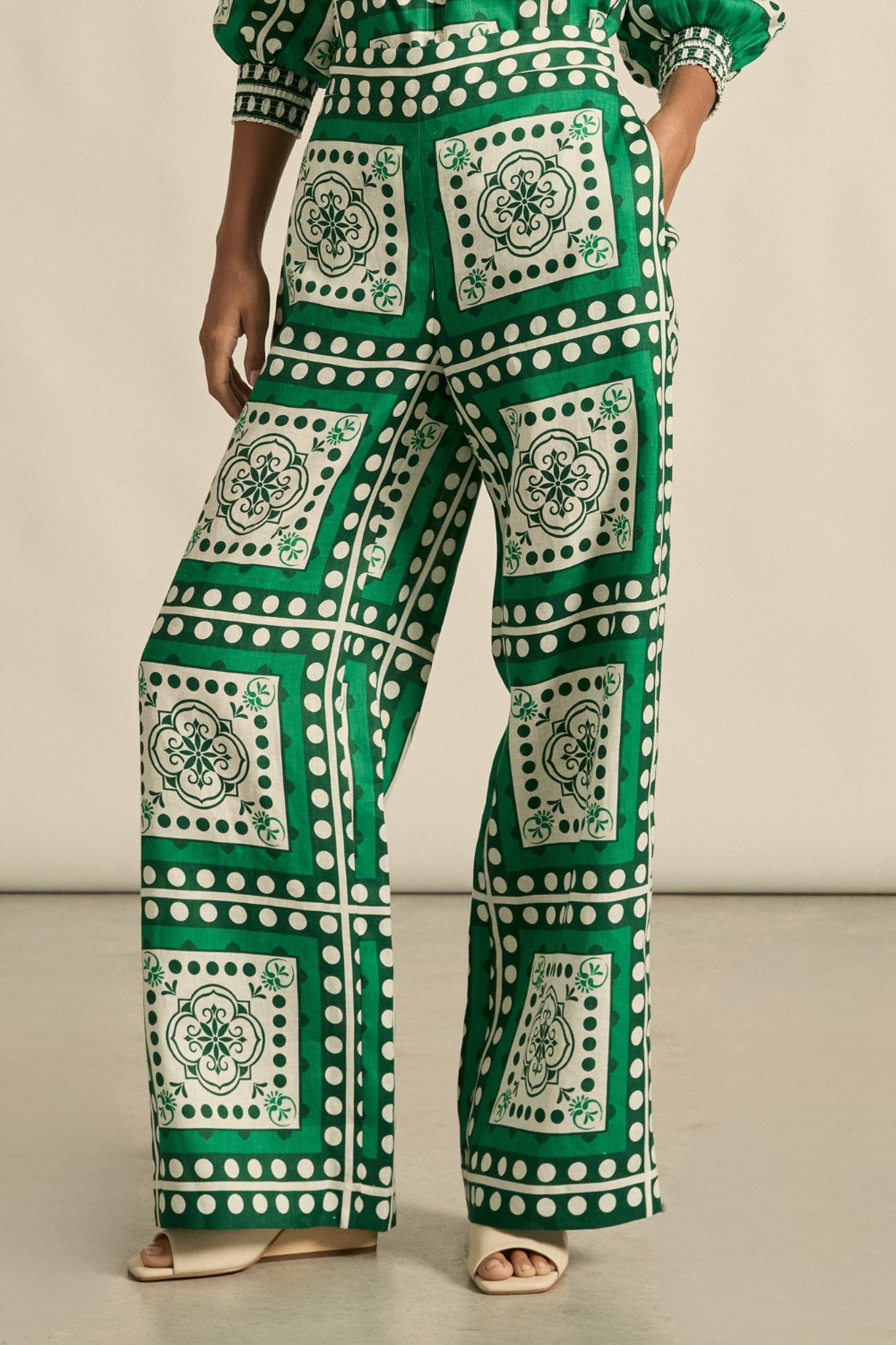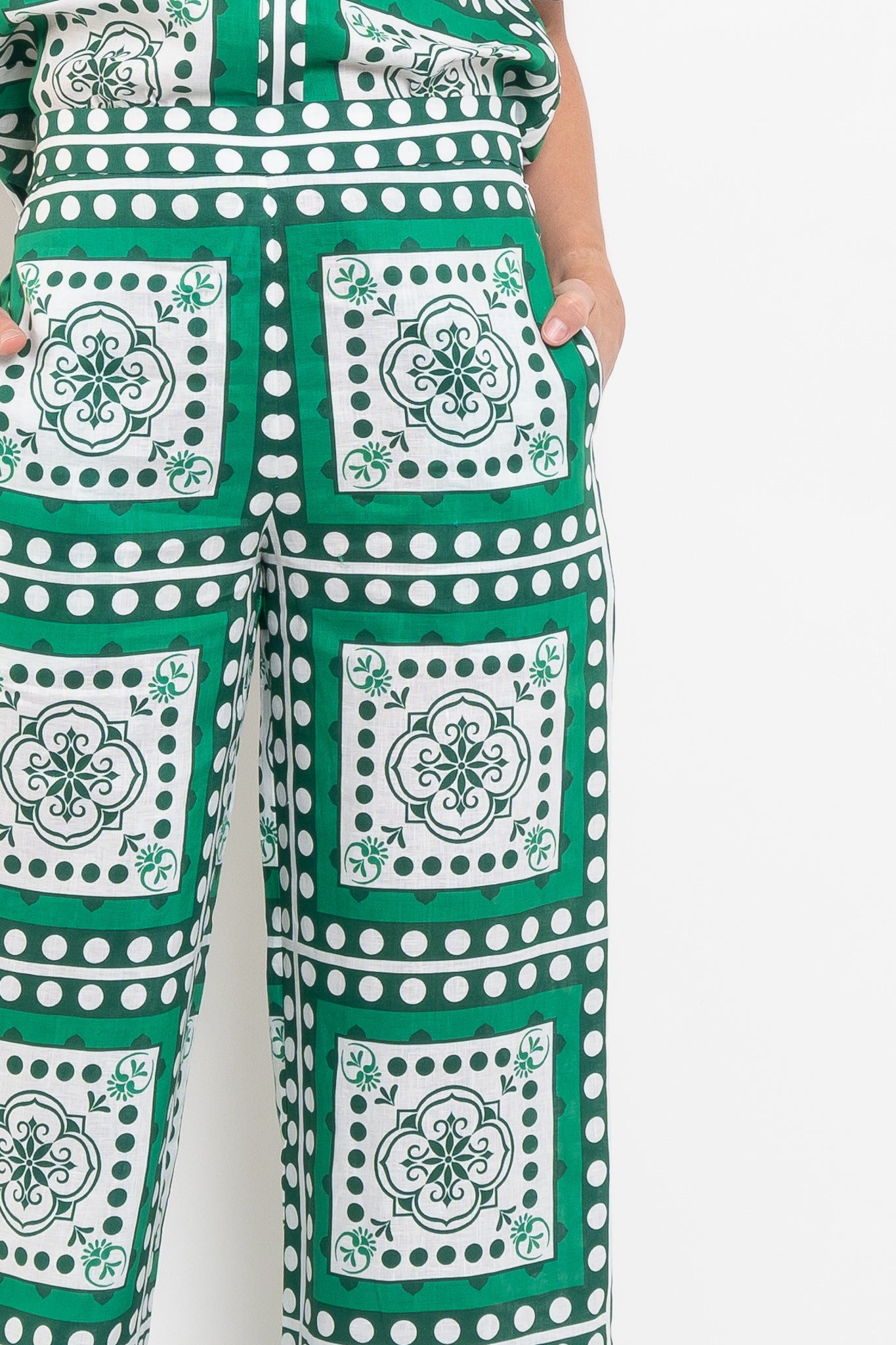 Sustainably printed in the exclusive Parrot Scarf motif, the Gesture Pant captures European-inspired graphics in a playful green and white palette. Cut from 100% linen, this wide-leg silhouette drapes with soft movement, while the seamless front and side zip keep the look polished. An elasticated back waistband ensures comfort, and side pockets add functionality. Perfect styled with the matching Pixel Top for coordinated impact, or with the Recollect Top in Parrot Green for a tonal twist.