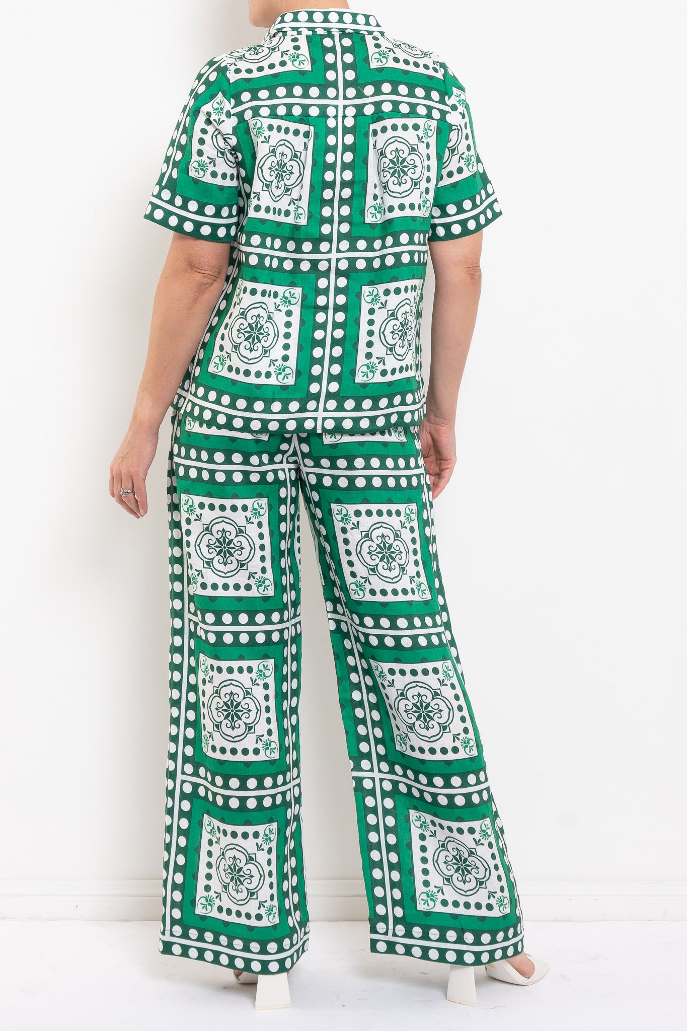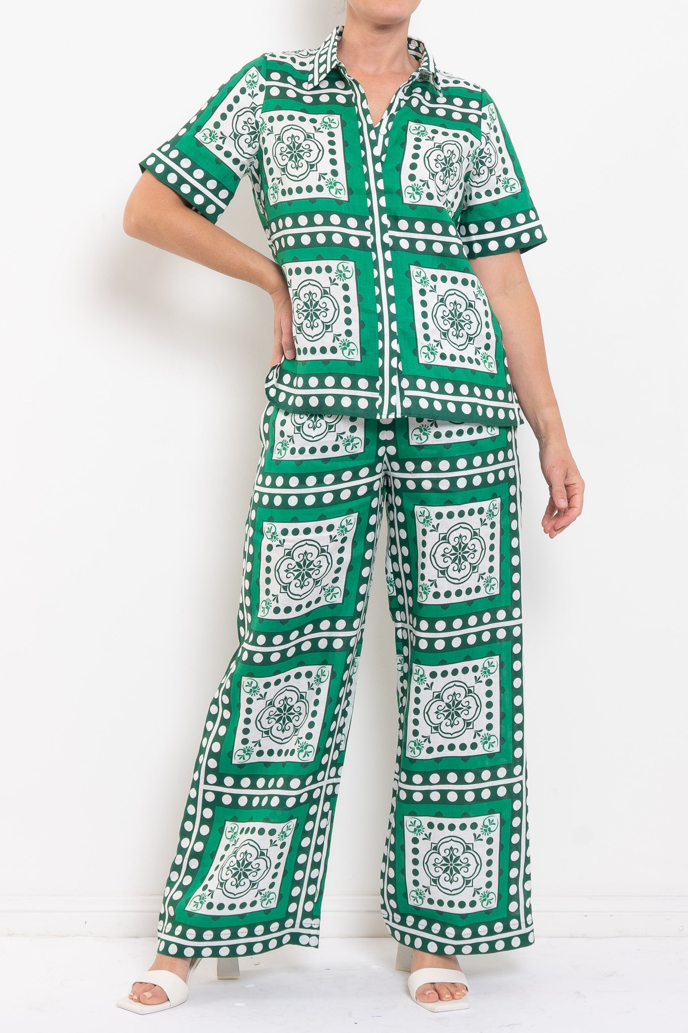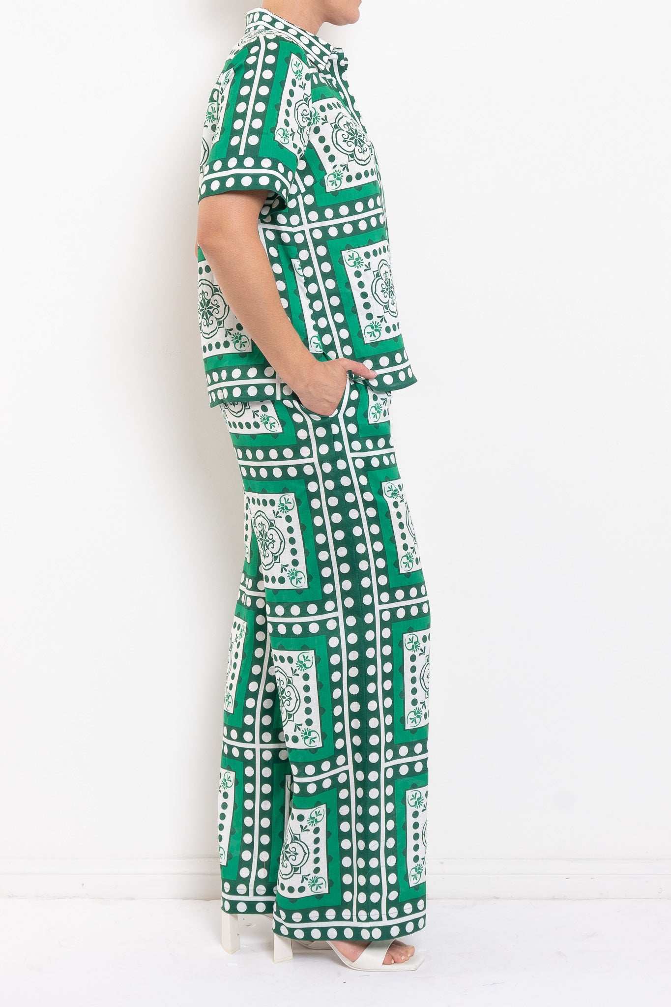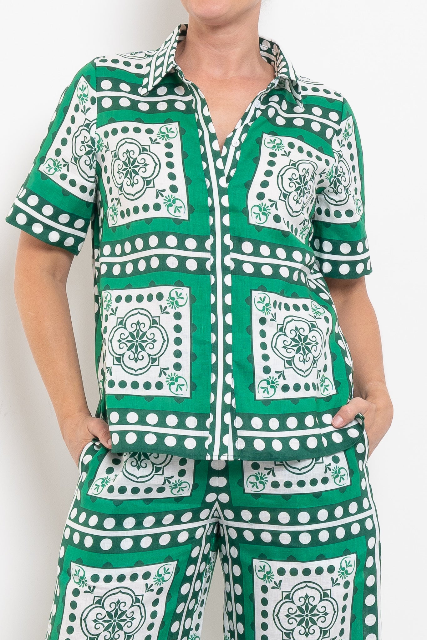 Featuring Zoe Kratzmann’s exclusive Parrot Scarf print, the Pixel Top is a spirited nod to European-inspired motifs in fresh green and white. A crisp collar and concealed placket give it modern structure, while the relaxed fit keeps it easy and wearable. Whether styled with the matching Gesture Pant for statement co-ord dressing or paired back with denim, this top moves effortlessly between vacation-ready and everyday polish.