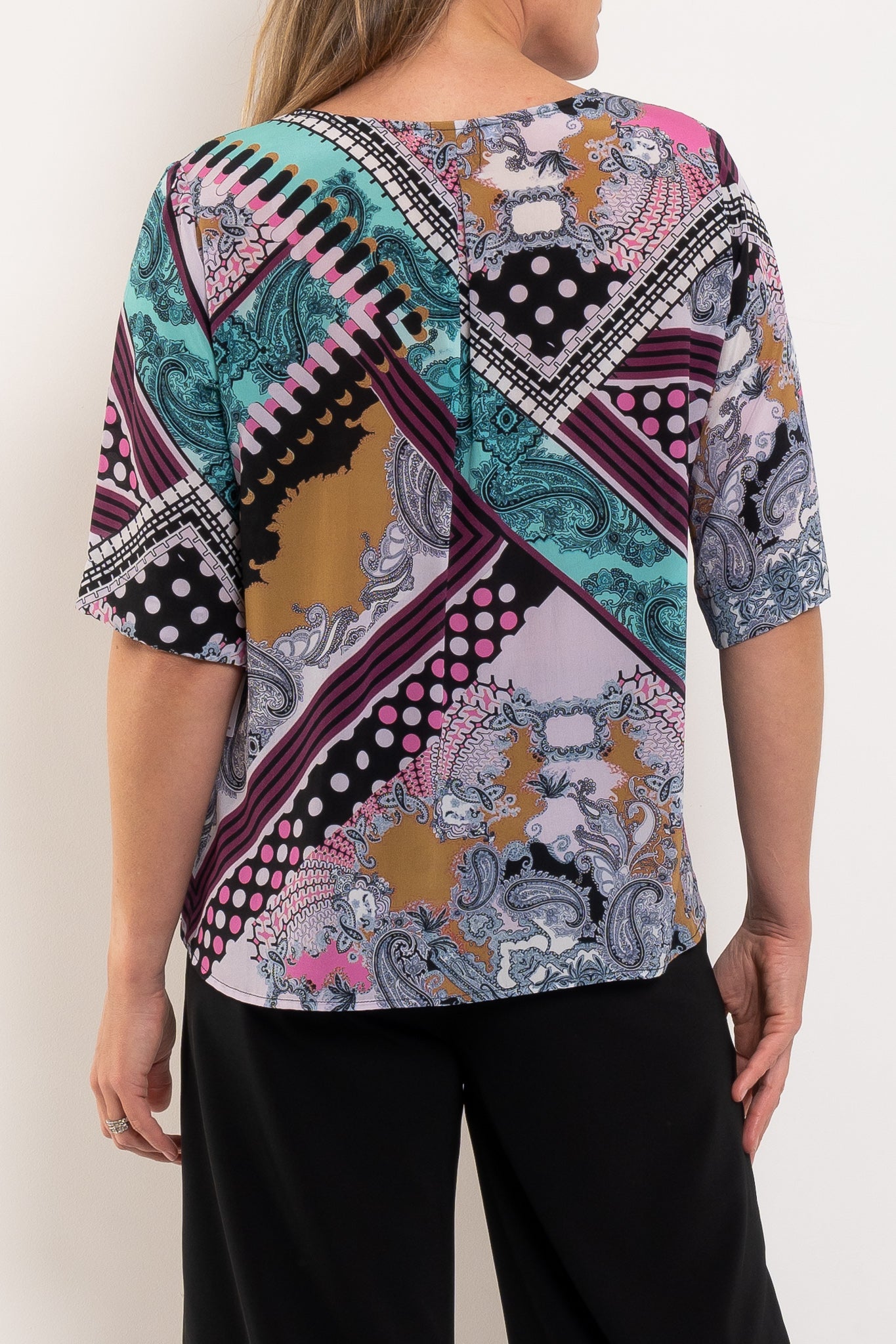 • Elbow-length sleeves for flattering coverage