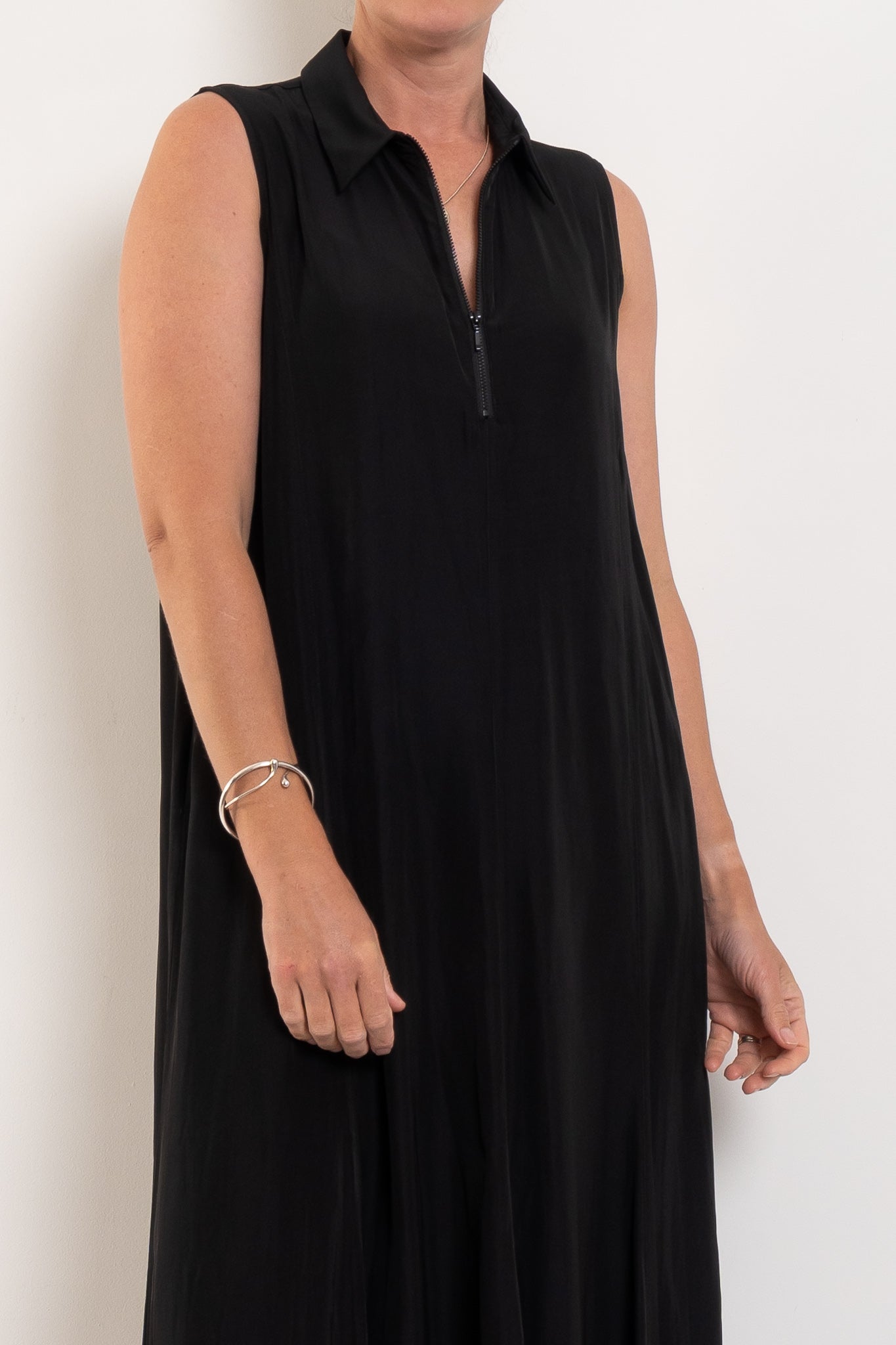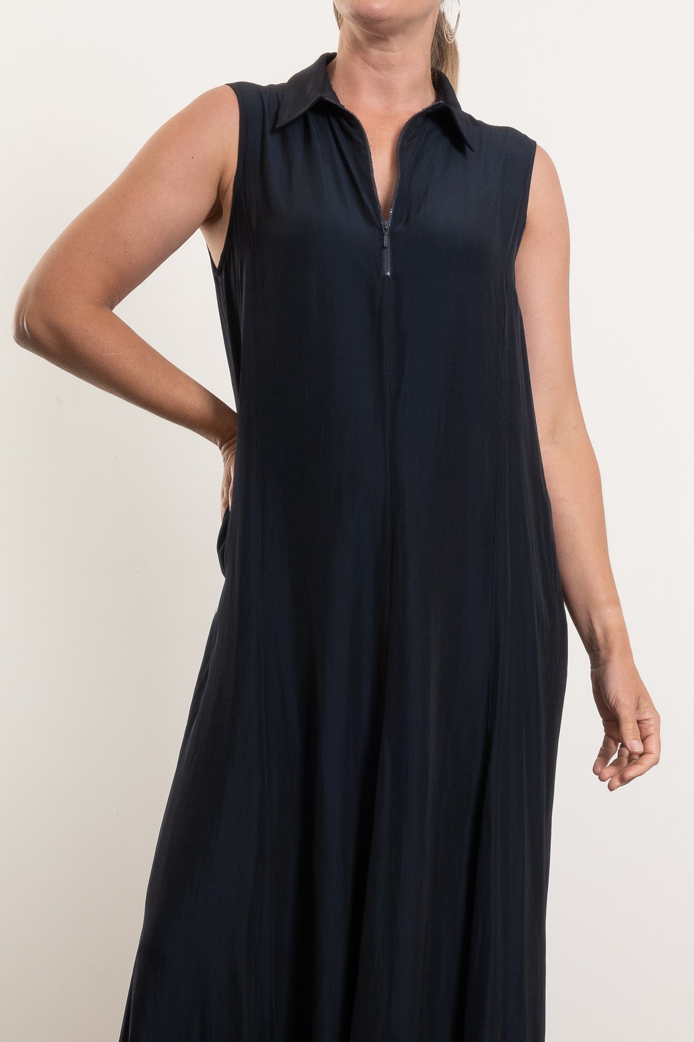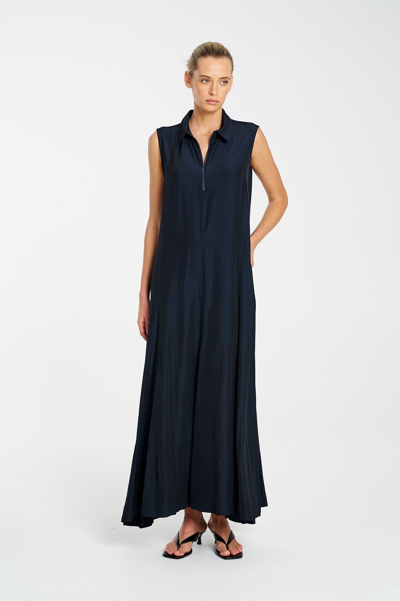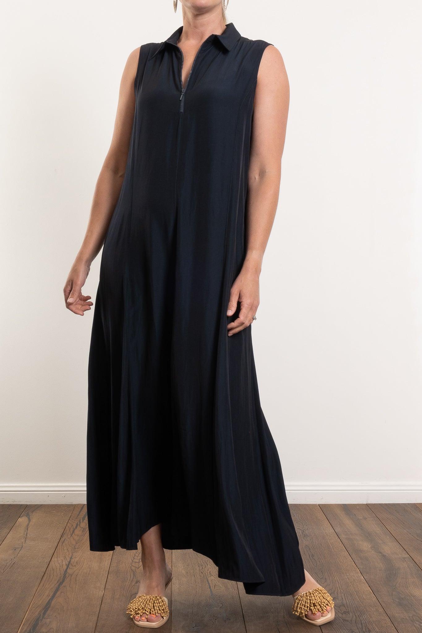 Crafted from Mela Purdie’s signature Mache, a fine denier Japanese technical weave with a smooth, air-flow finish, the Flip Maxi Dress offers comfort, drape, and timeless style. The sleeveless silhouette features a soft collar with a zip front closure and a full skirt with subtle panel detailing for graceful movement. Whether you’re dressing for travel, long lunches, or weekends away, this maxi dress delivers understated elegance with ease.