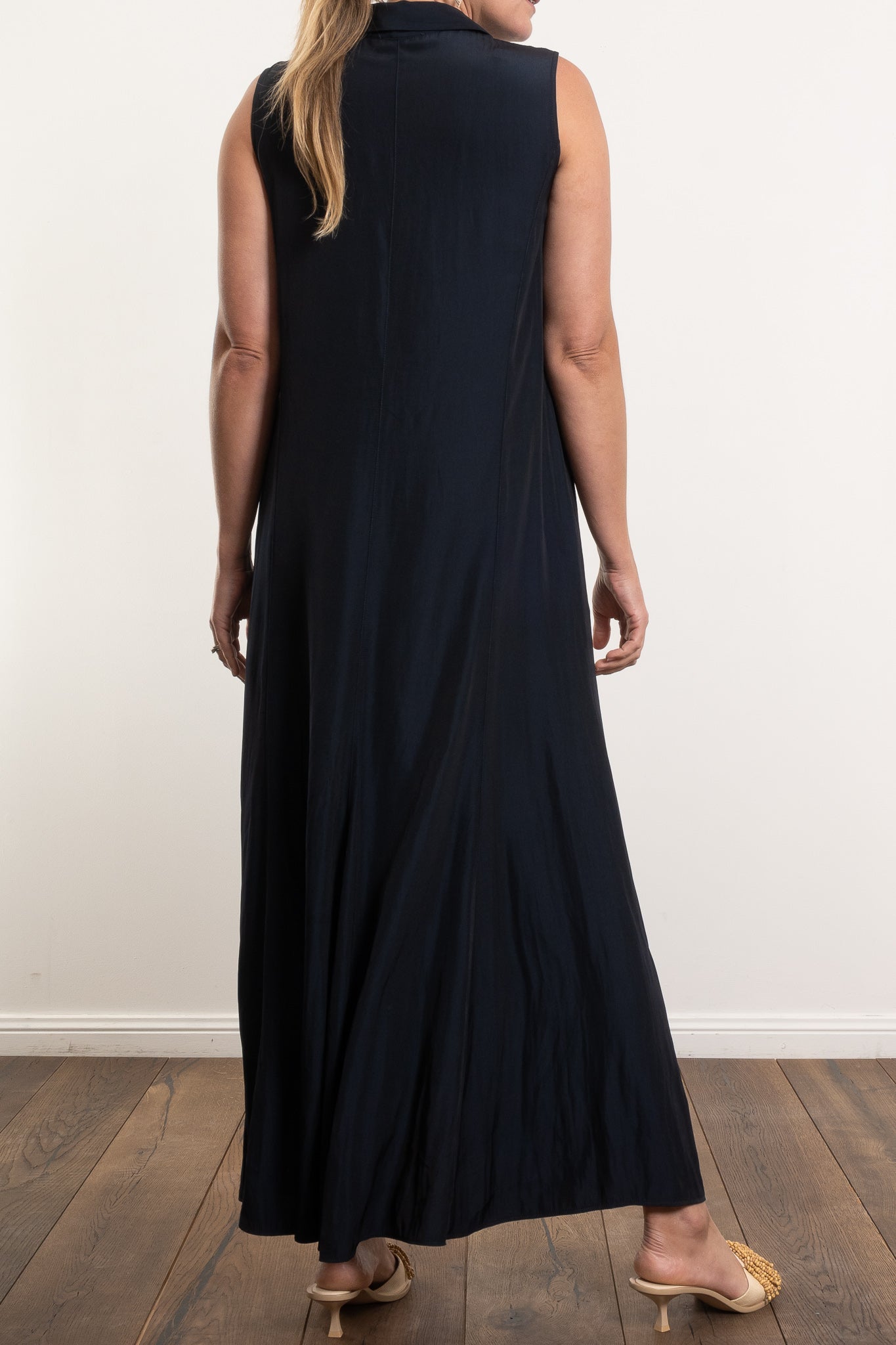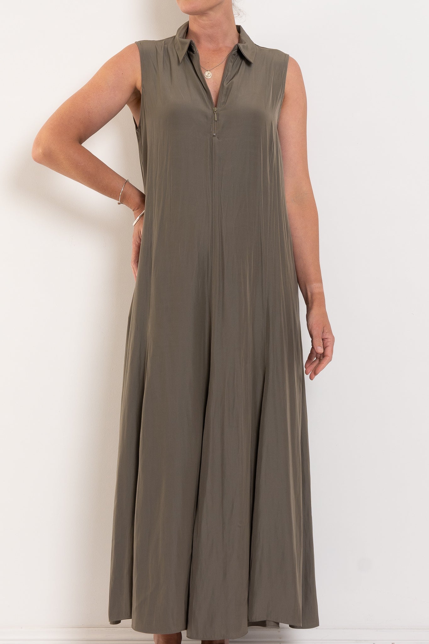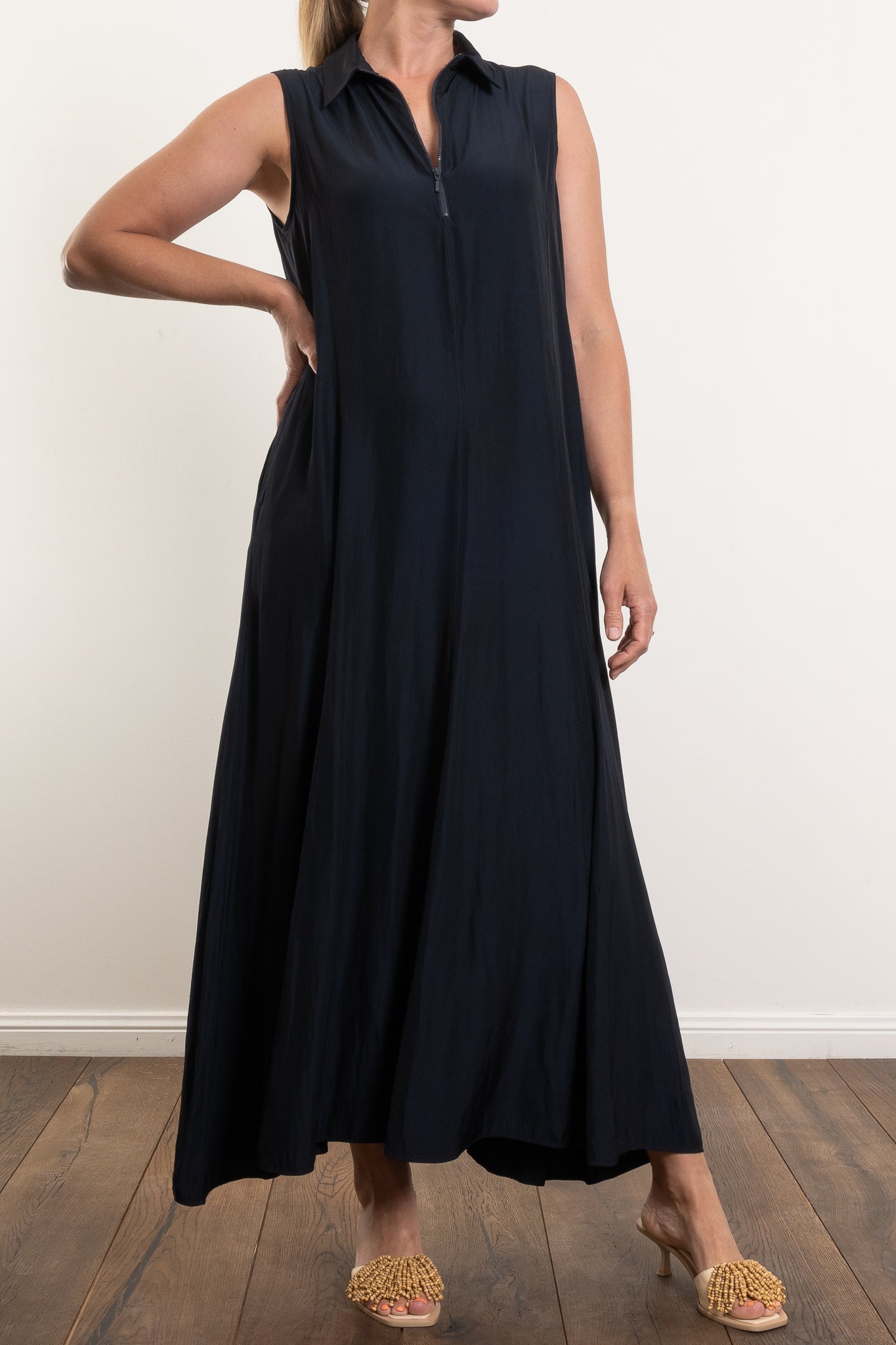 Crafted from Mela Purdie’s signature Mache, a fine denier Japanese technical weave with a smooth, air-flow finish, the Flip Maxi Dress offers comfort, drape, and timeless style. The sleeveless silhouette features a soft collar with a zip front closure and a full skirt with subtle panel detailing for graceful movement. Whether you’re dressing for travel, long lunches, or weekends away, this maxi dress delivers understated elegance with ease.