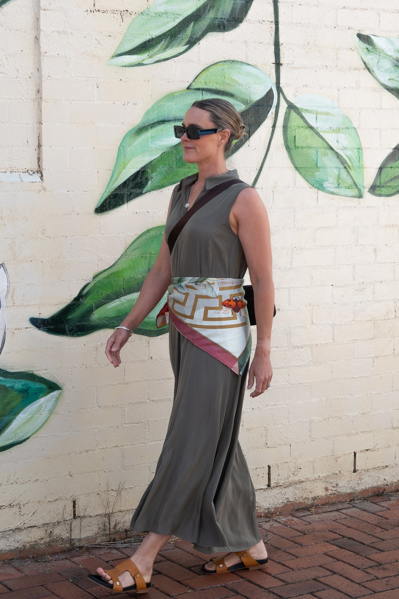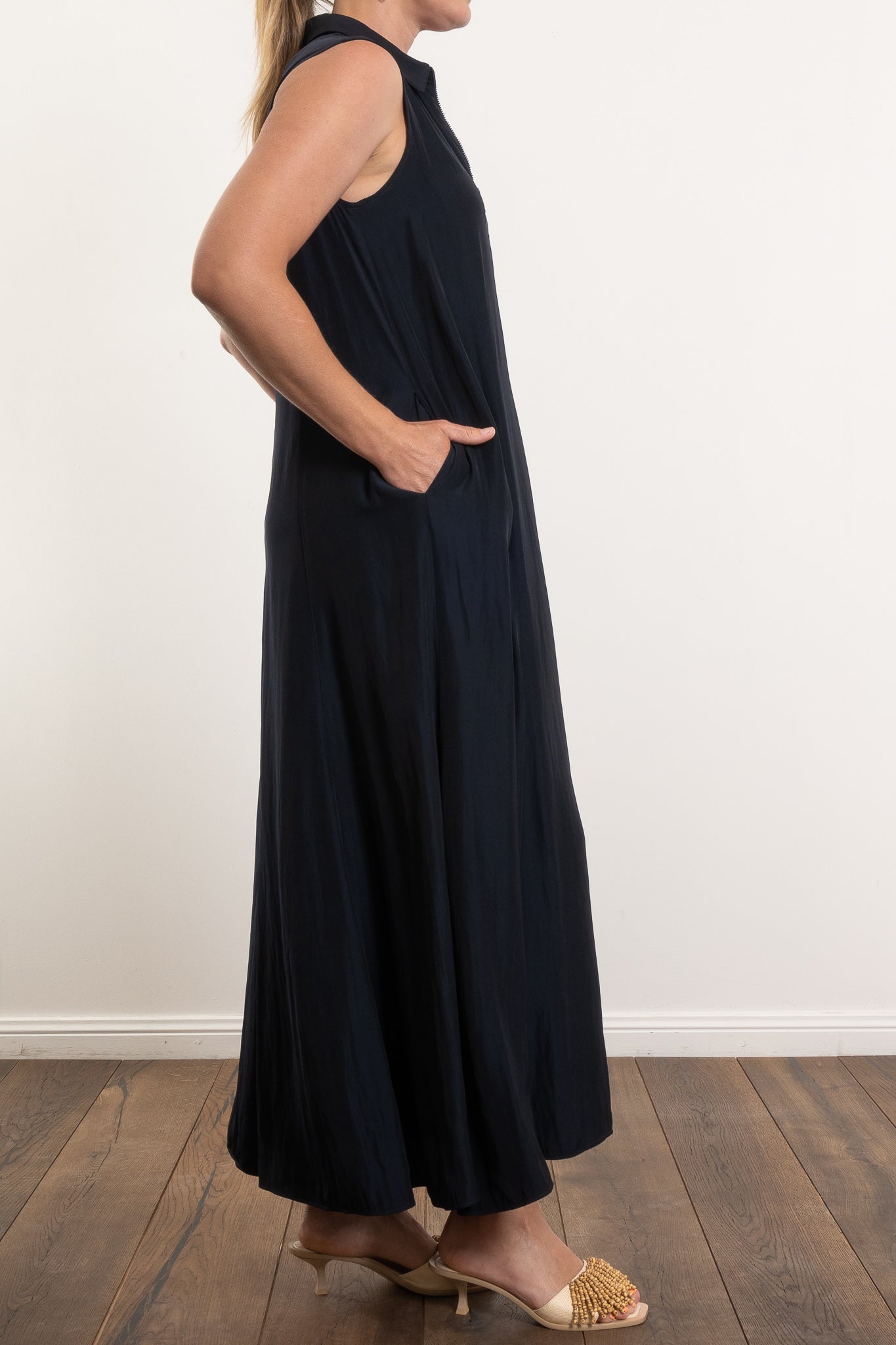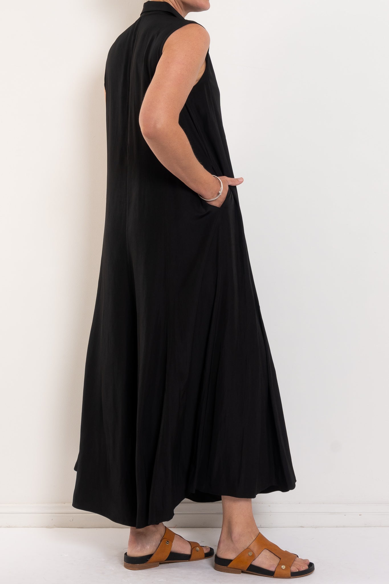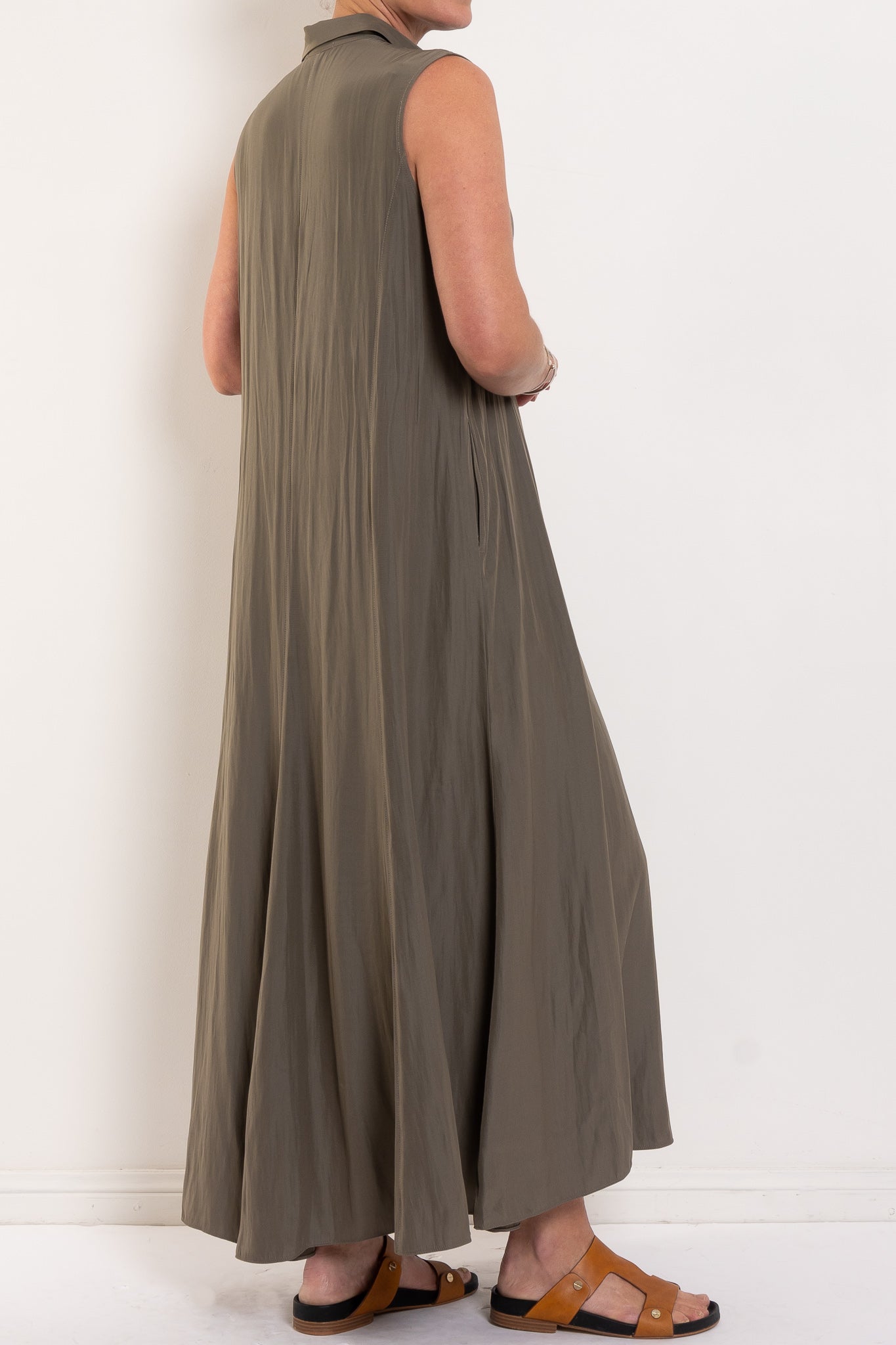Crafted from Mela Purdie’s signature Mache, a fine denier Japanese technical weave with a smooth, air-flow finish, the Flip Maxi Dress offers comfort, drape, and timeless style. The sleeveless silhouette features a soft collar with a zip front closure and a full skirt with subtle panel detailing for graceful movement. Whether you’re dressing for travel, long lunches, or weekends away, this maxi dress delivers understated elegance with ease.