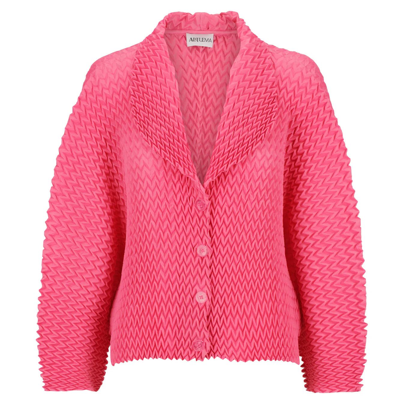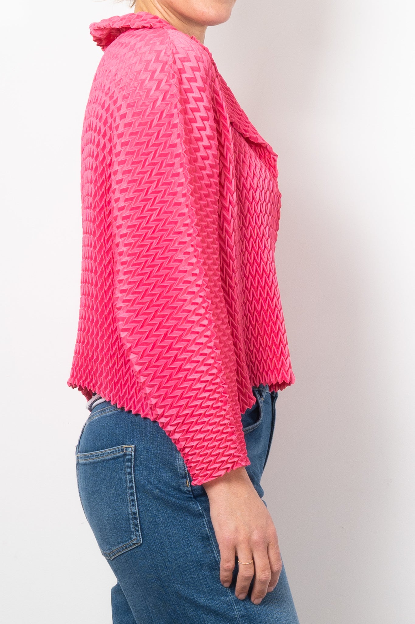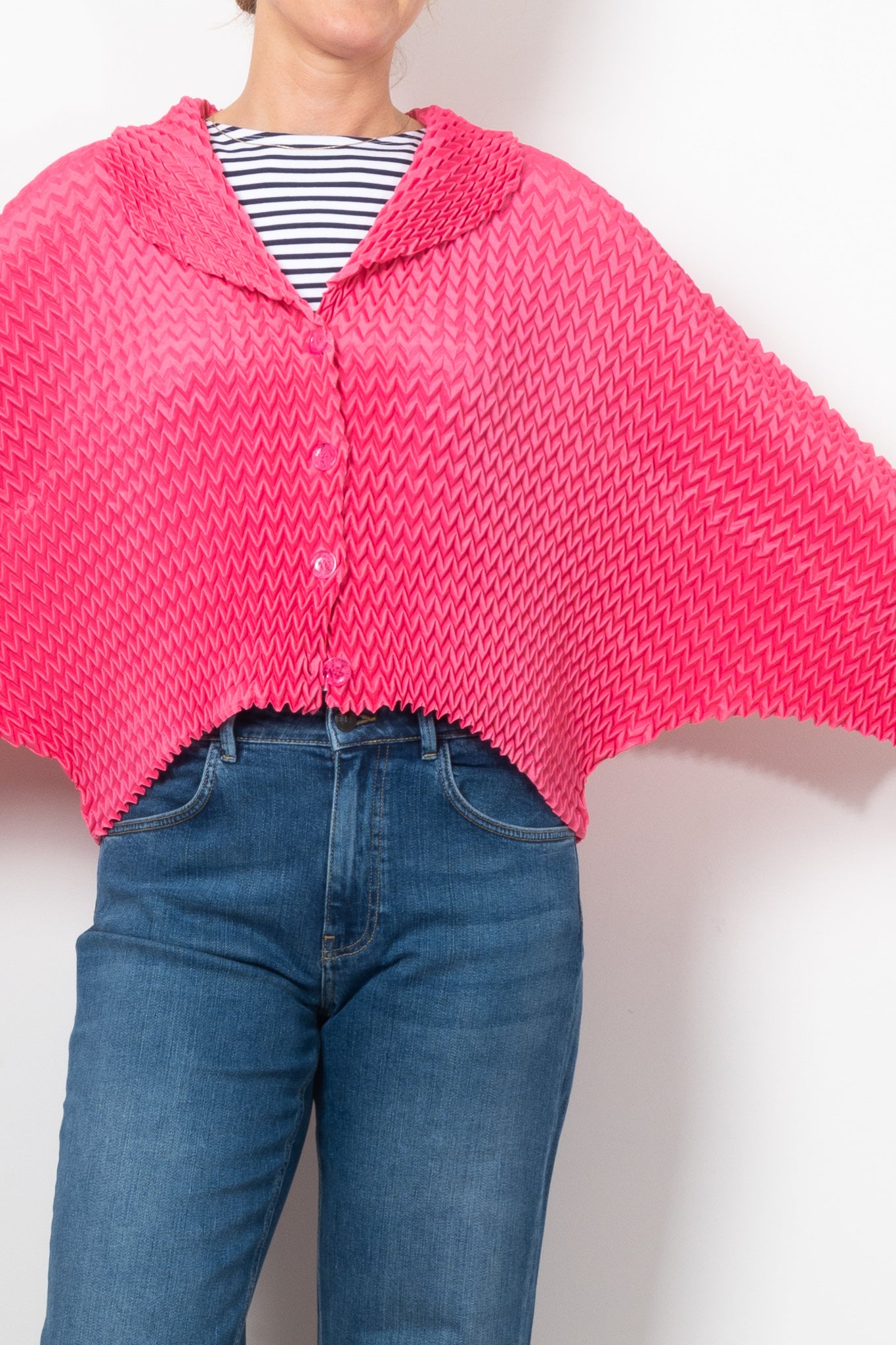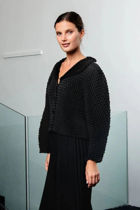 Add a bold touch to any outfit with Alquema's Nightstar Bolero. The hand pleated design adds shape and the collar frames the face beautifully. Made from soft and slinky fabric, this lightweight one size bolero is a statement piece in vibrant pink. Elevate your style with a pop of colour!
