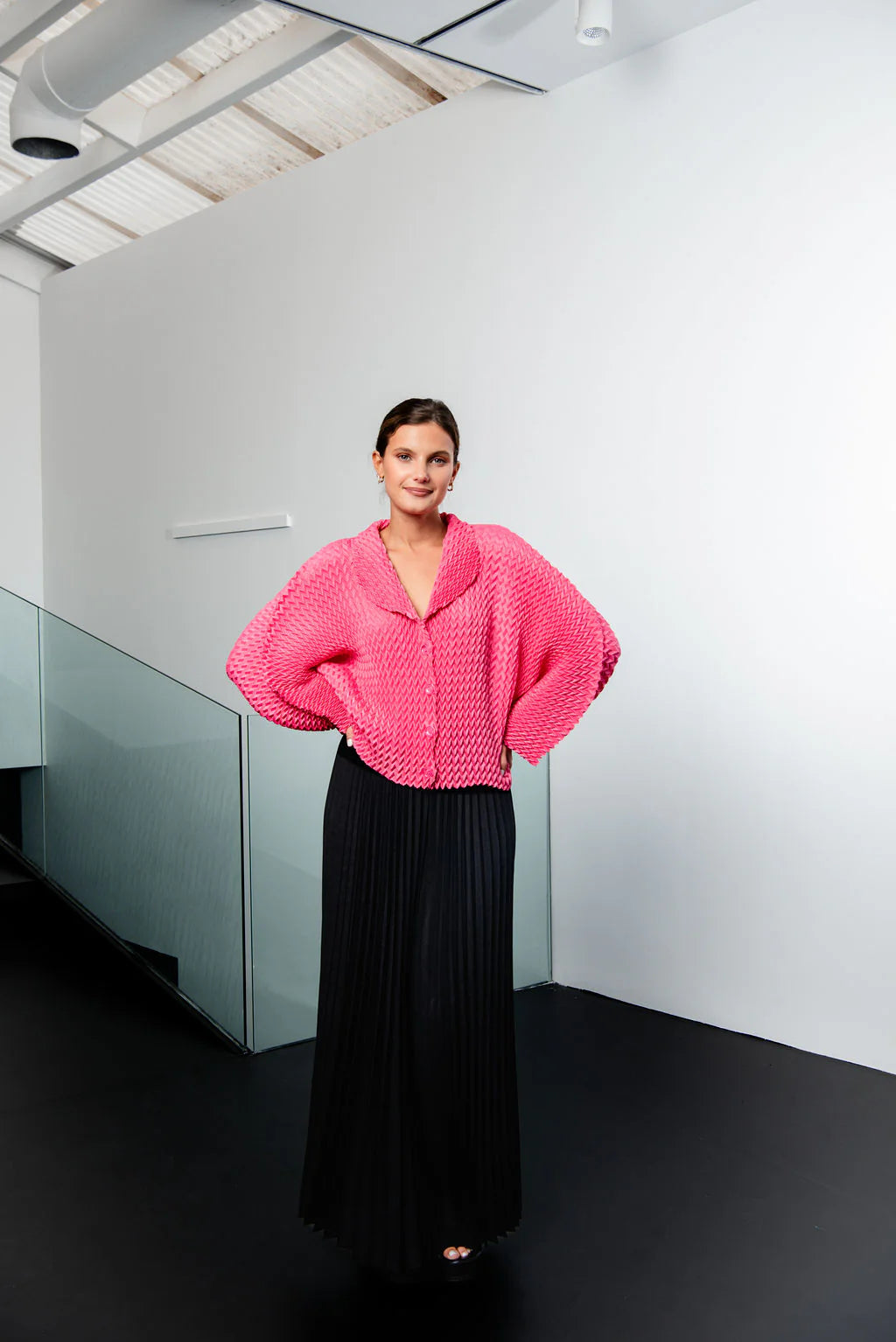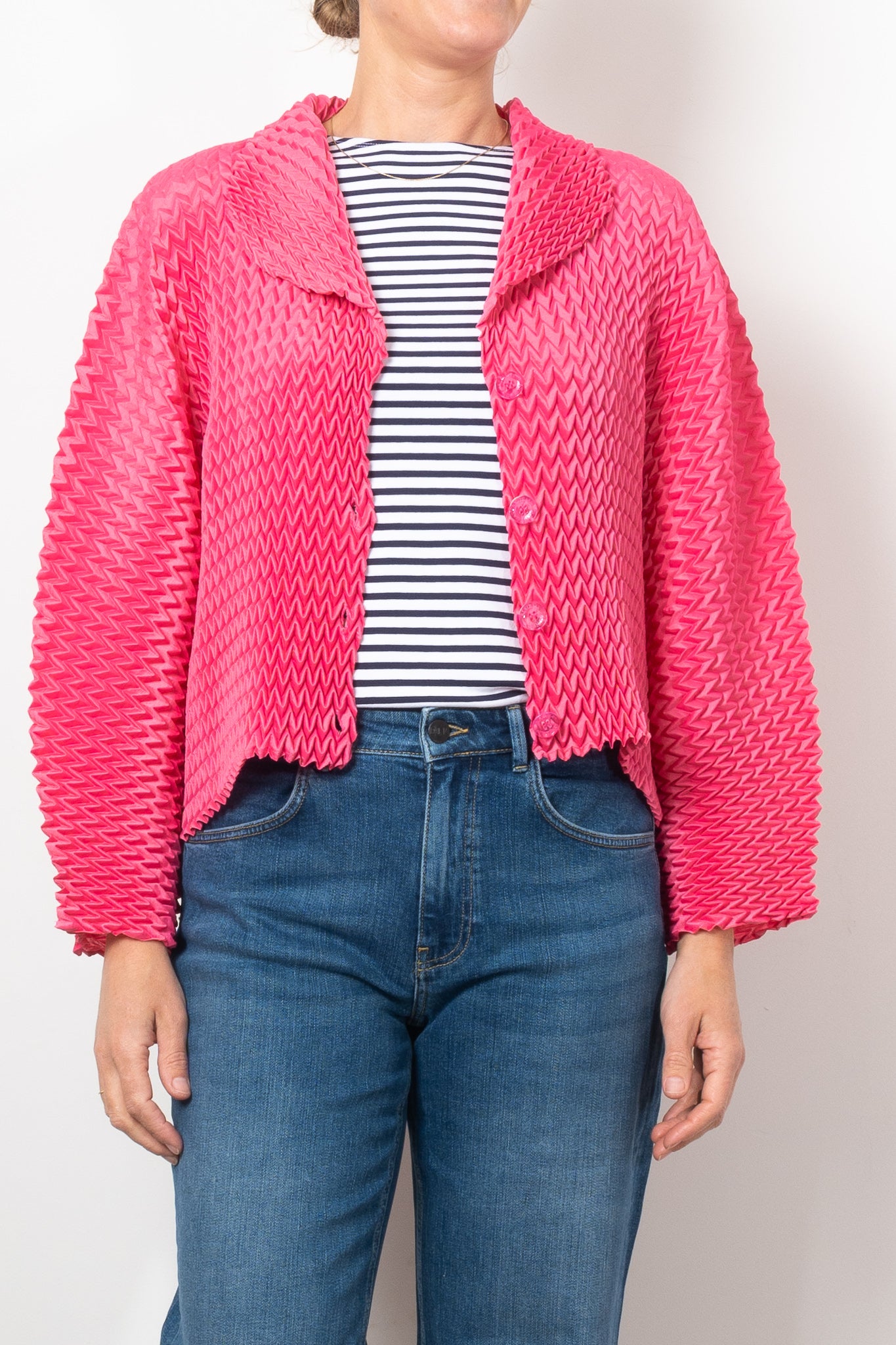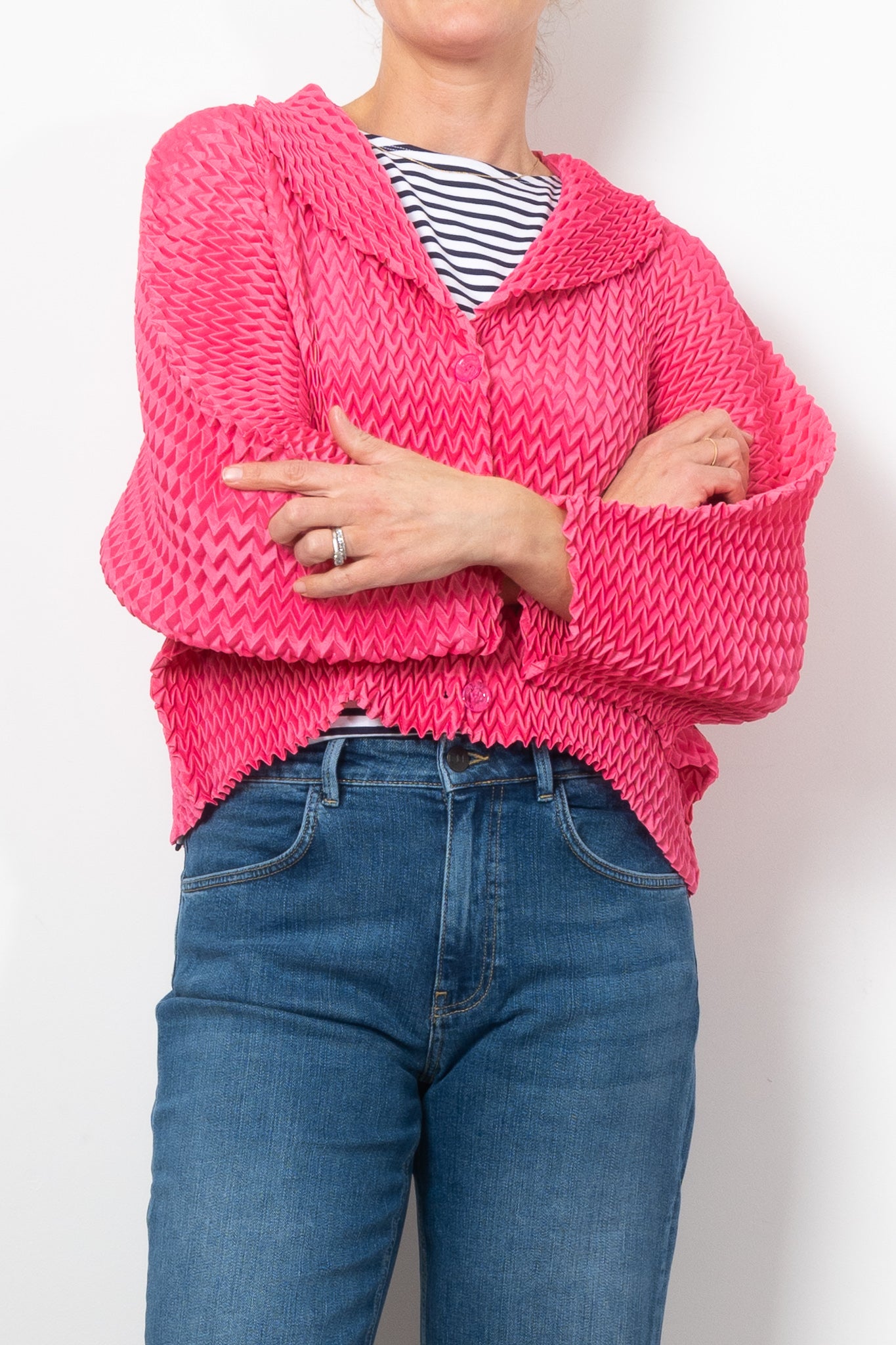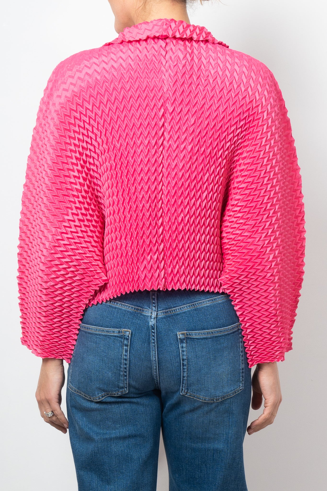 Add a bold touch to any outfit with Alquema's Nightstar Bolero. The hand pleated design adds shape and the collar frames the face beautifully. Made from soft and slinky fabric, this lightweight one size bolero is a statement piece in vibrant pink. Elevate your style with a pop of colour!