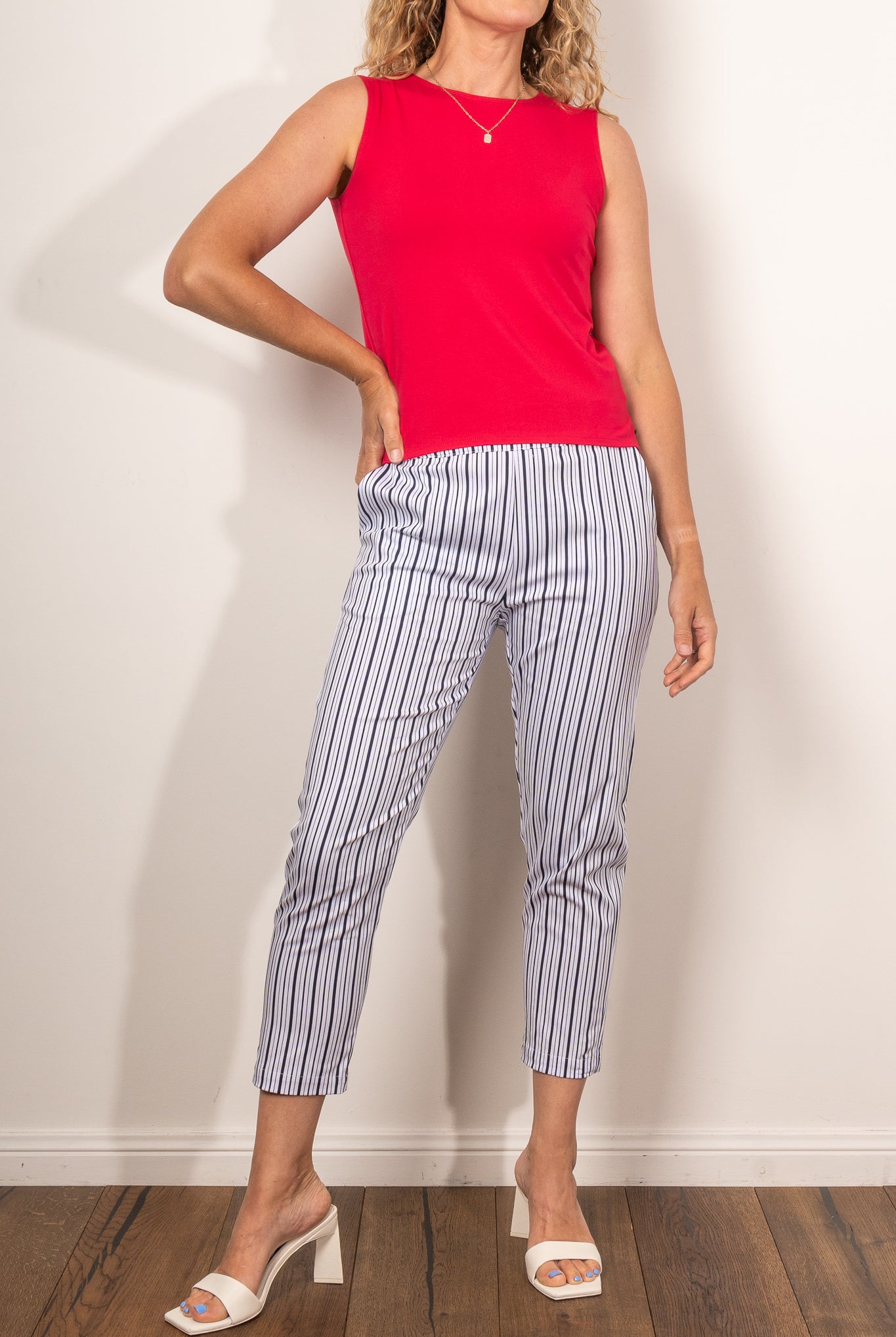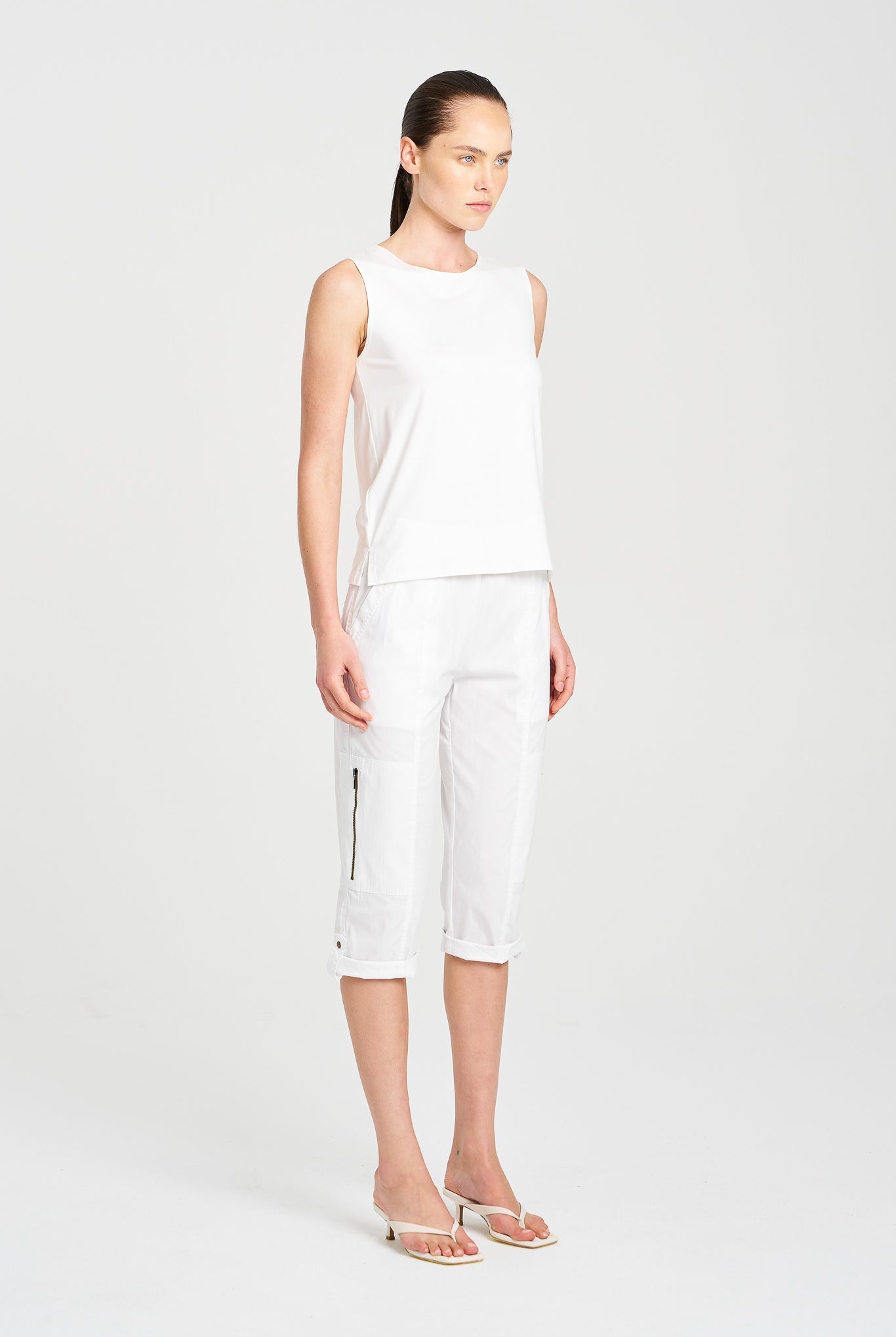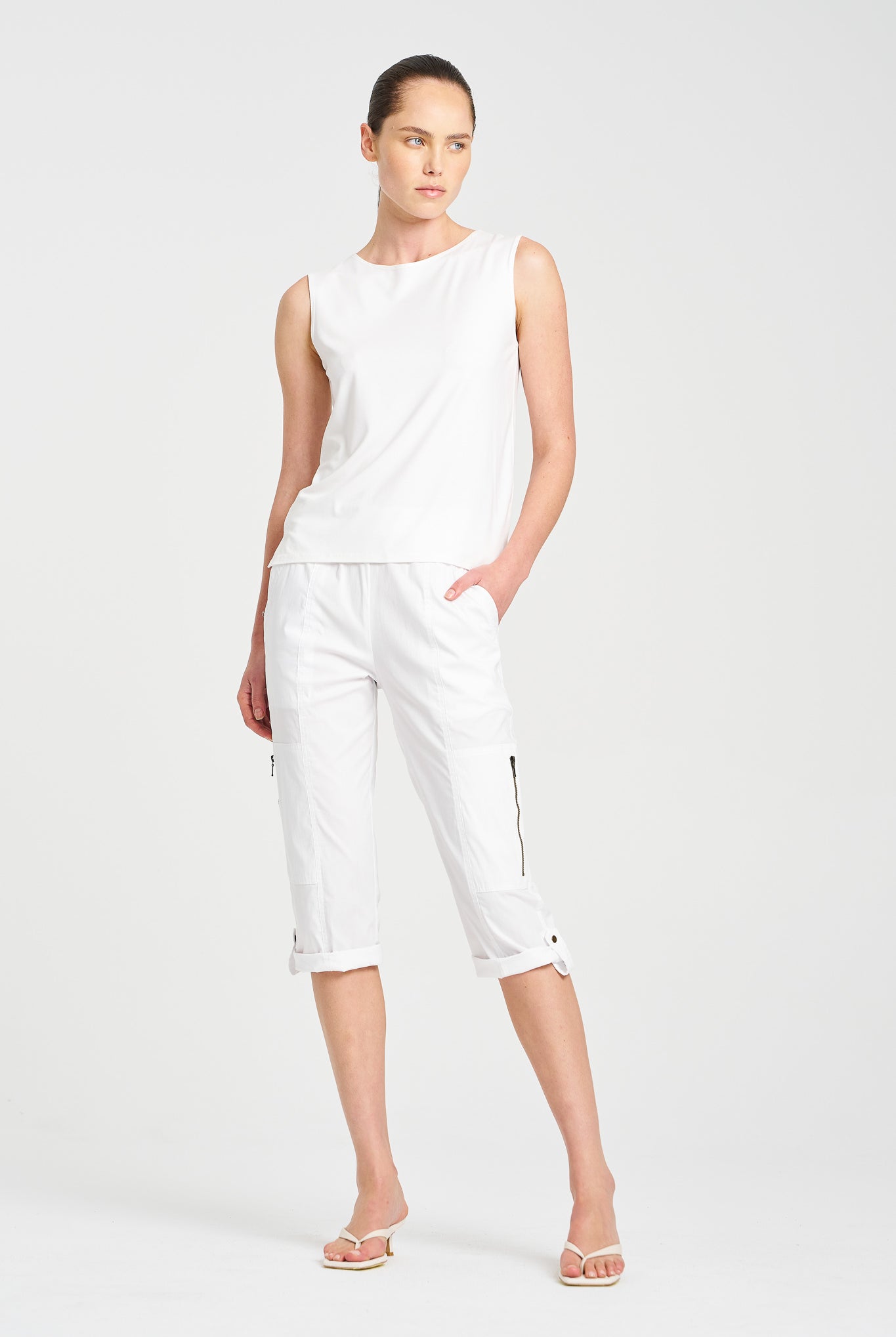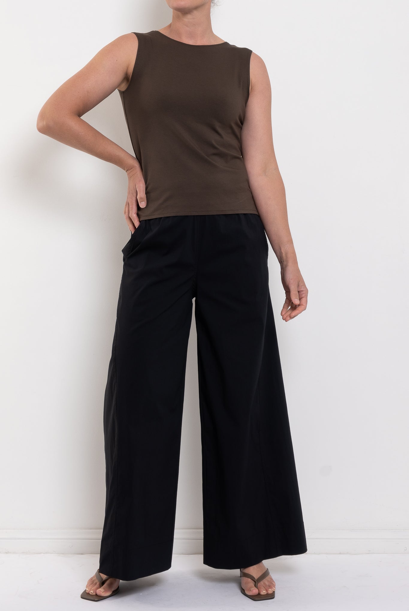 The Frill Neck tank cleverly combines a simple utlitarian shape (a button through tank) with delicate ruffles and soft gathering at the shoulders for laid back elegance. Combined with the track pant shape of the silky, harem style Morroccan pant it's got the vibe of a casual look but the details of something much more luxe.