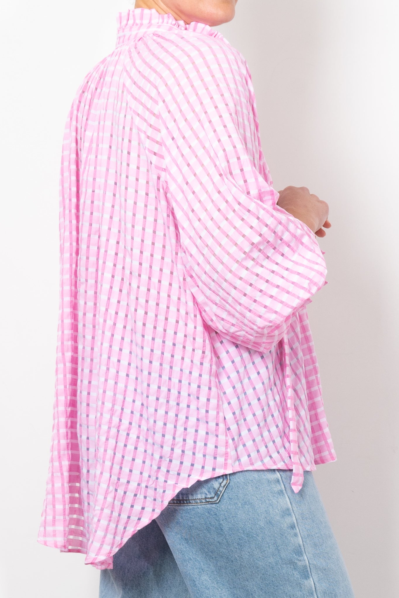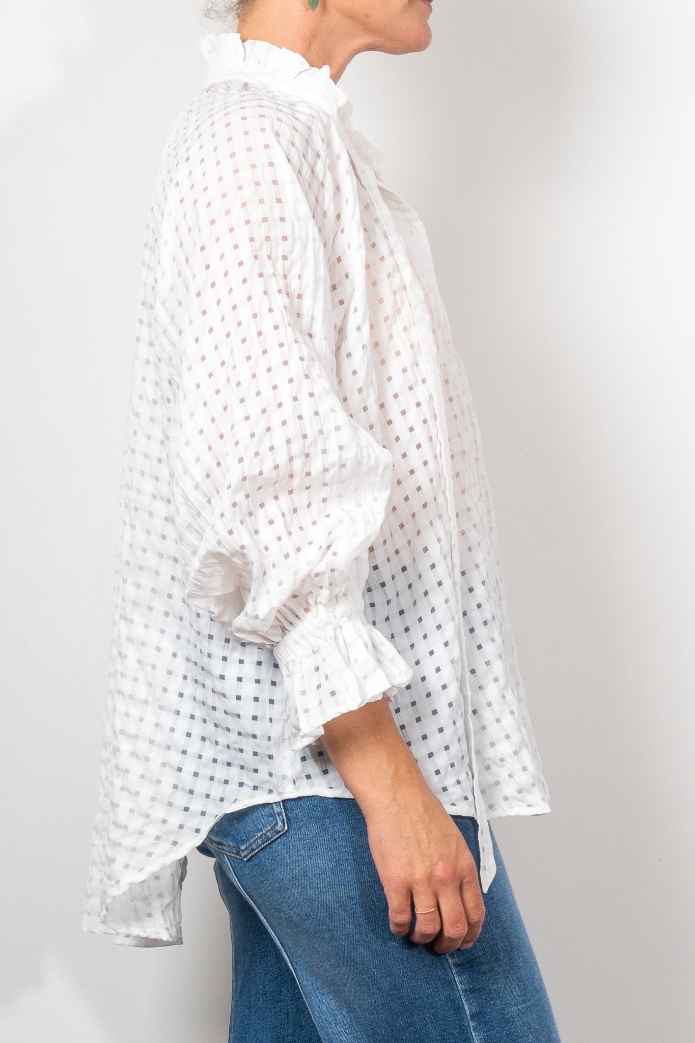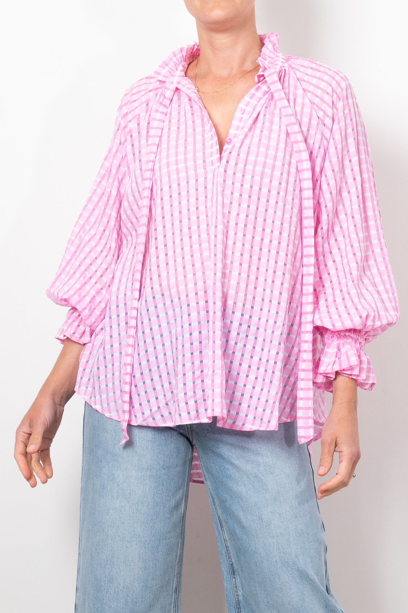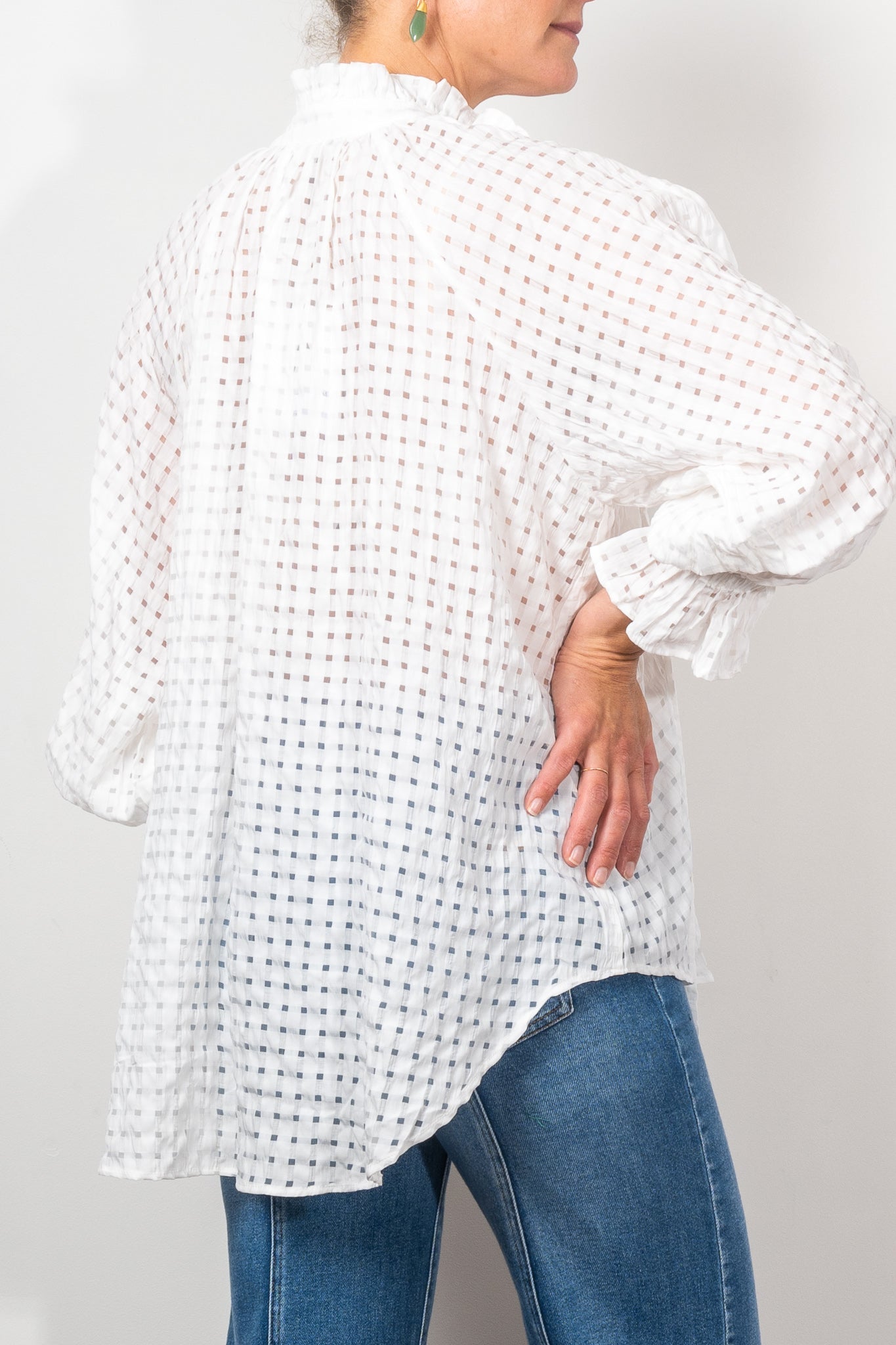 The Alexandra Danill Chequer Top is the perfect blend of effortless style and feminine charm. Made with fluid drapes, tie-up neck detail, a scooped hem, and stunning back pleats, this blouse exudes a nonchalant appeal. With classic details like elasticated cuffs and a button-up front, and finished with delicate frilled cuffs, it is a must-have for any wardrobe.