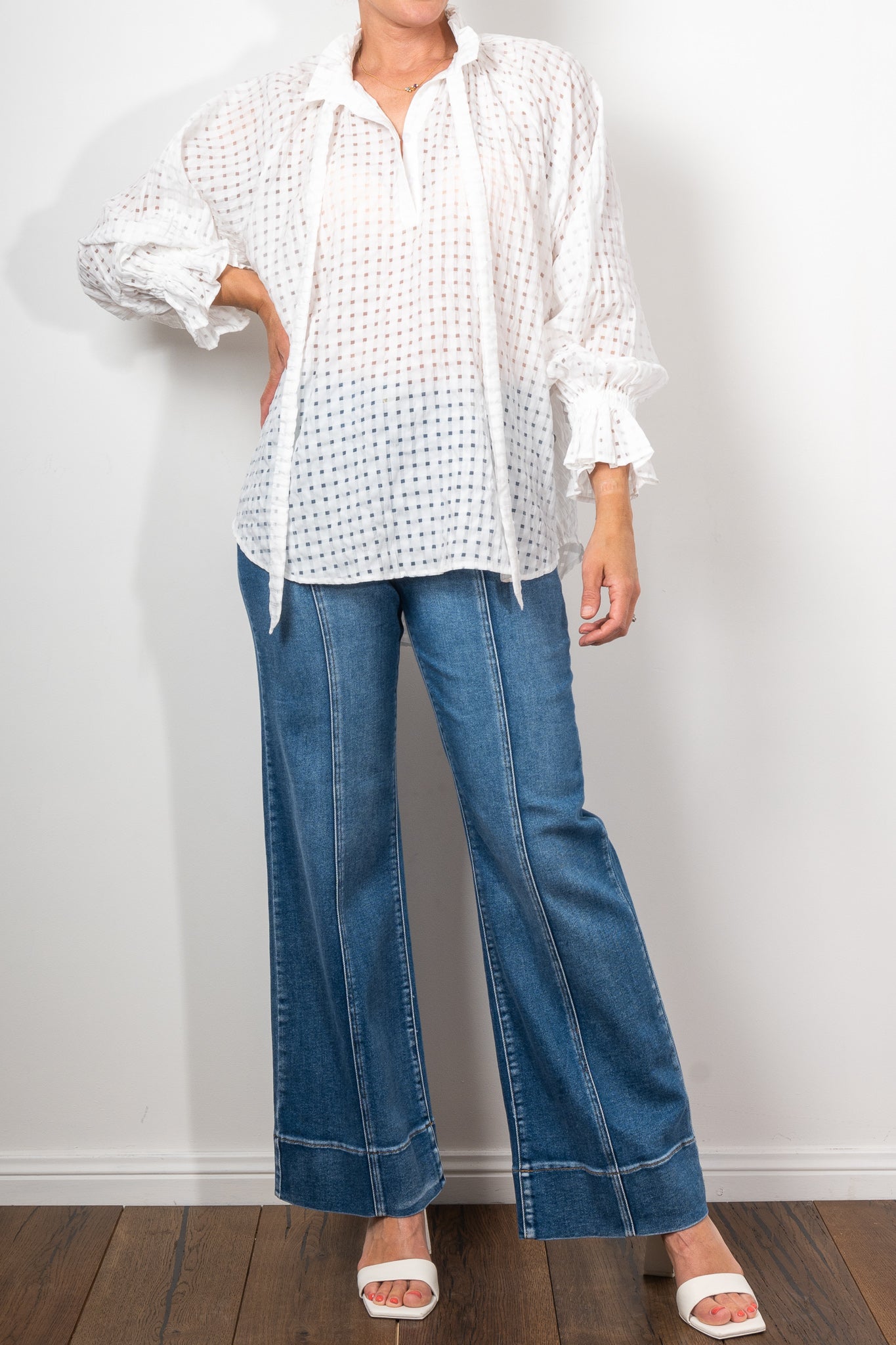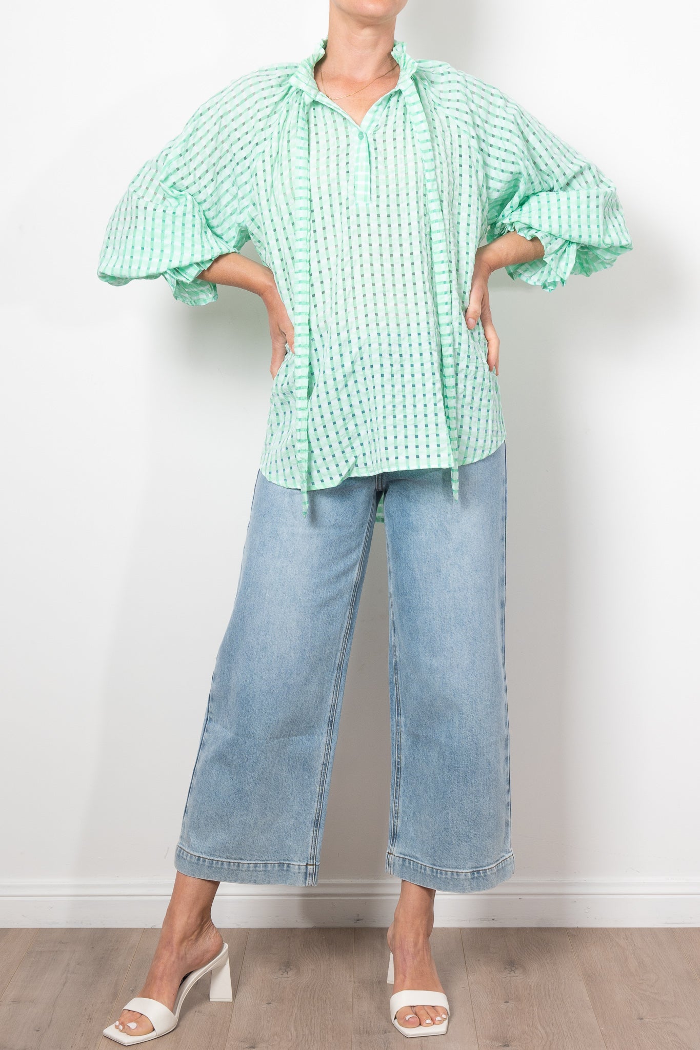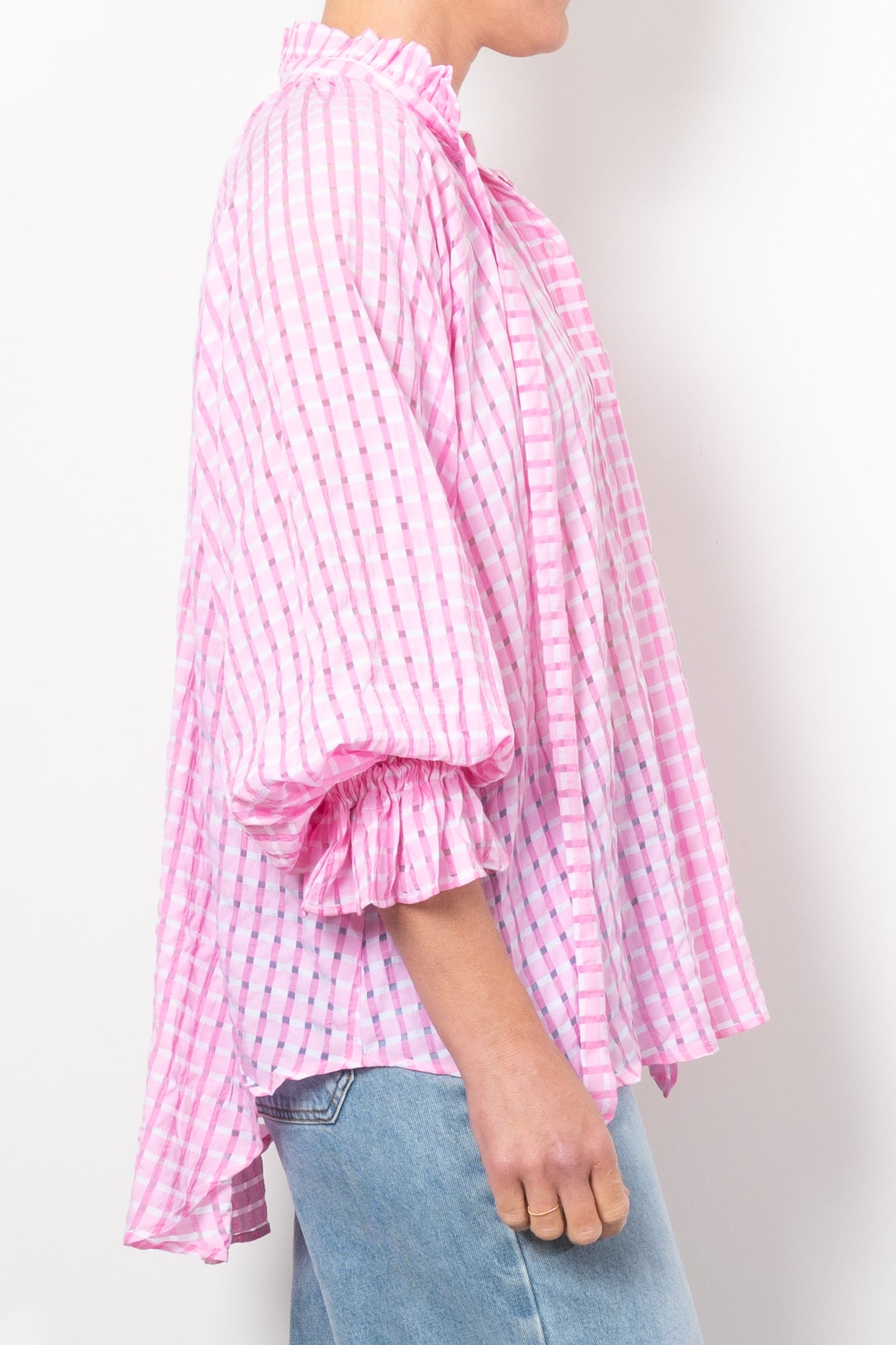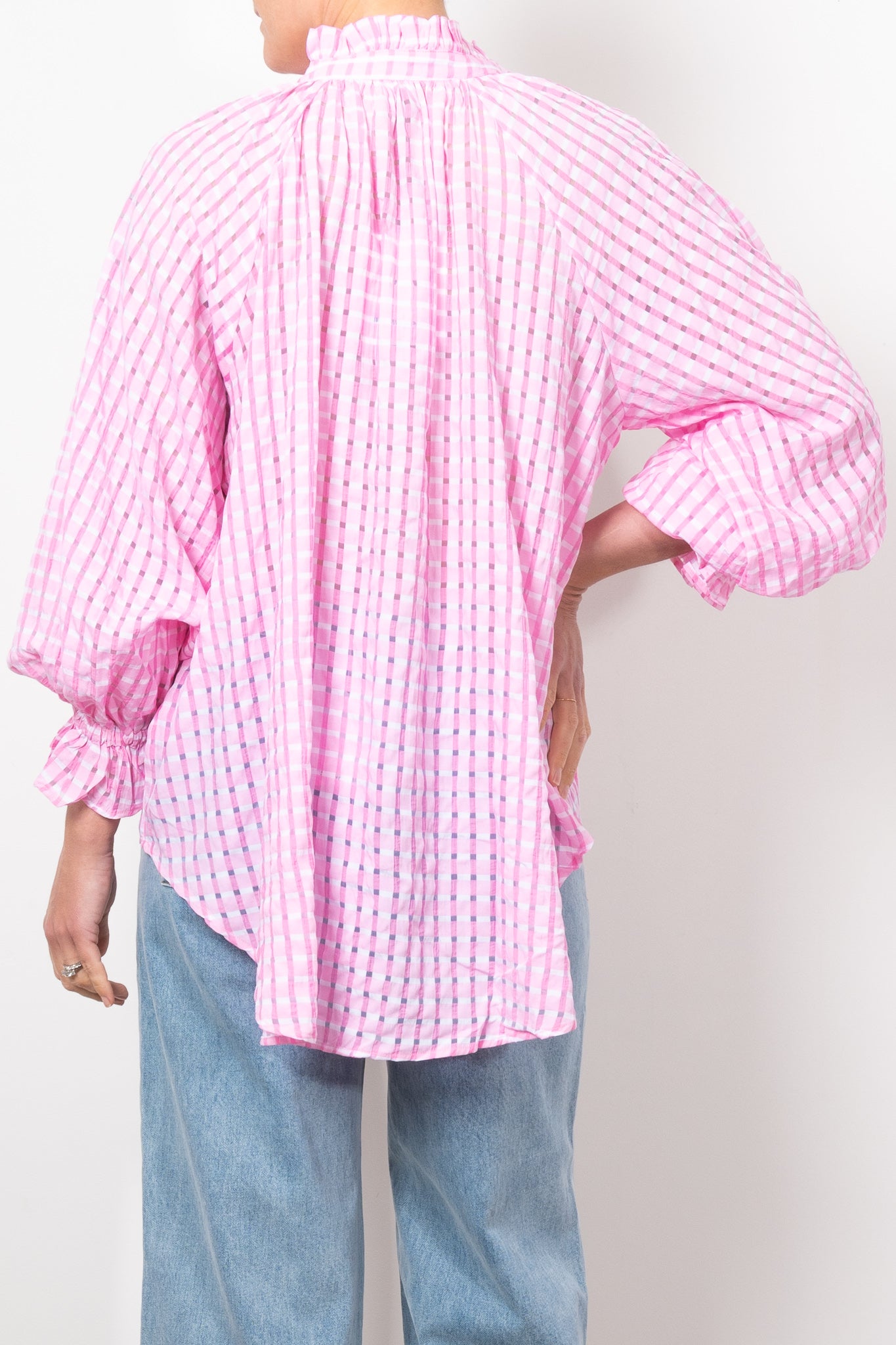 The Alexandra Danill Chequer Top is the perfect blend of effortless style and feminine charm. Made with fluid drapes, tie-up neck detail, a scooped hem, and stunning back pleats, this blouse exudes a nonchalant appeal. With classic details like elasticated cuffs and a button-up front, and finished with delicate frilled cuffs, it is a must-have for any wardrobe.