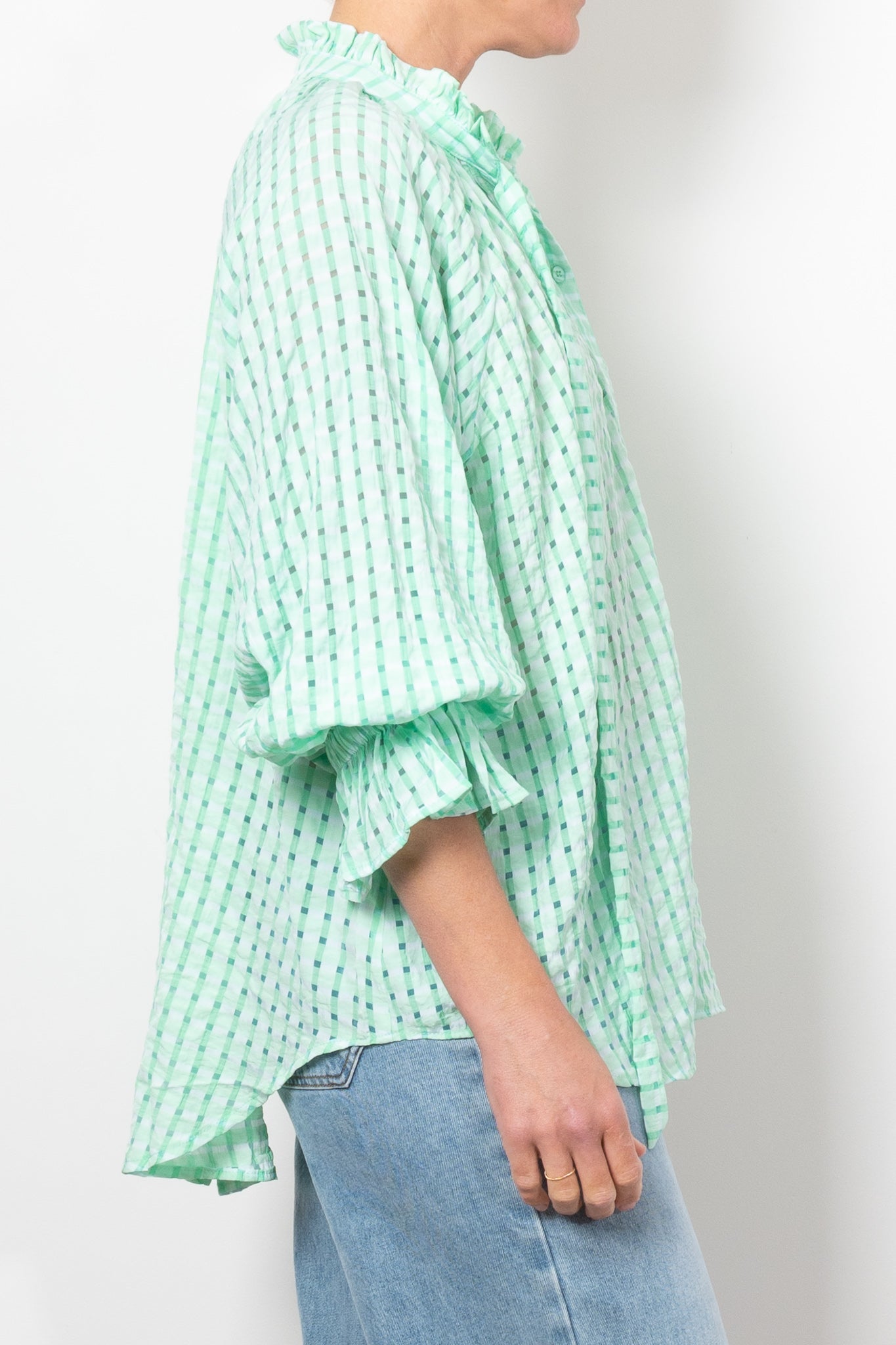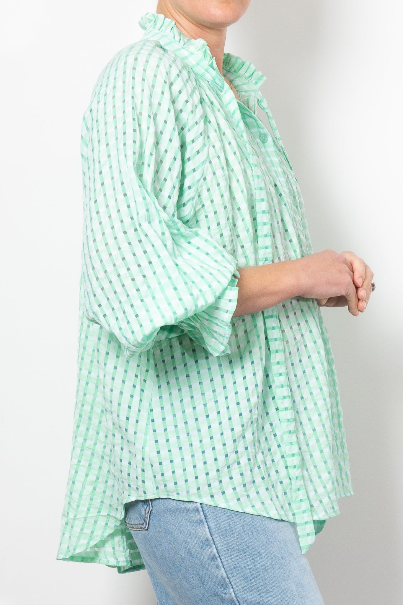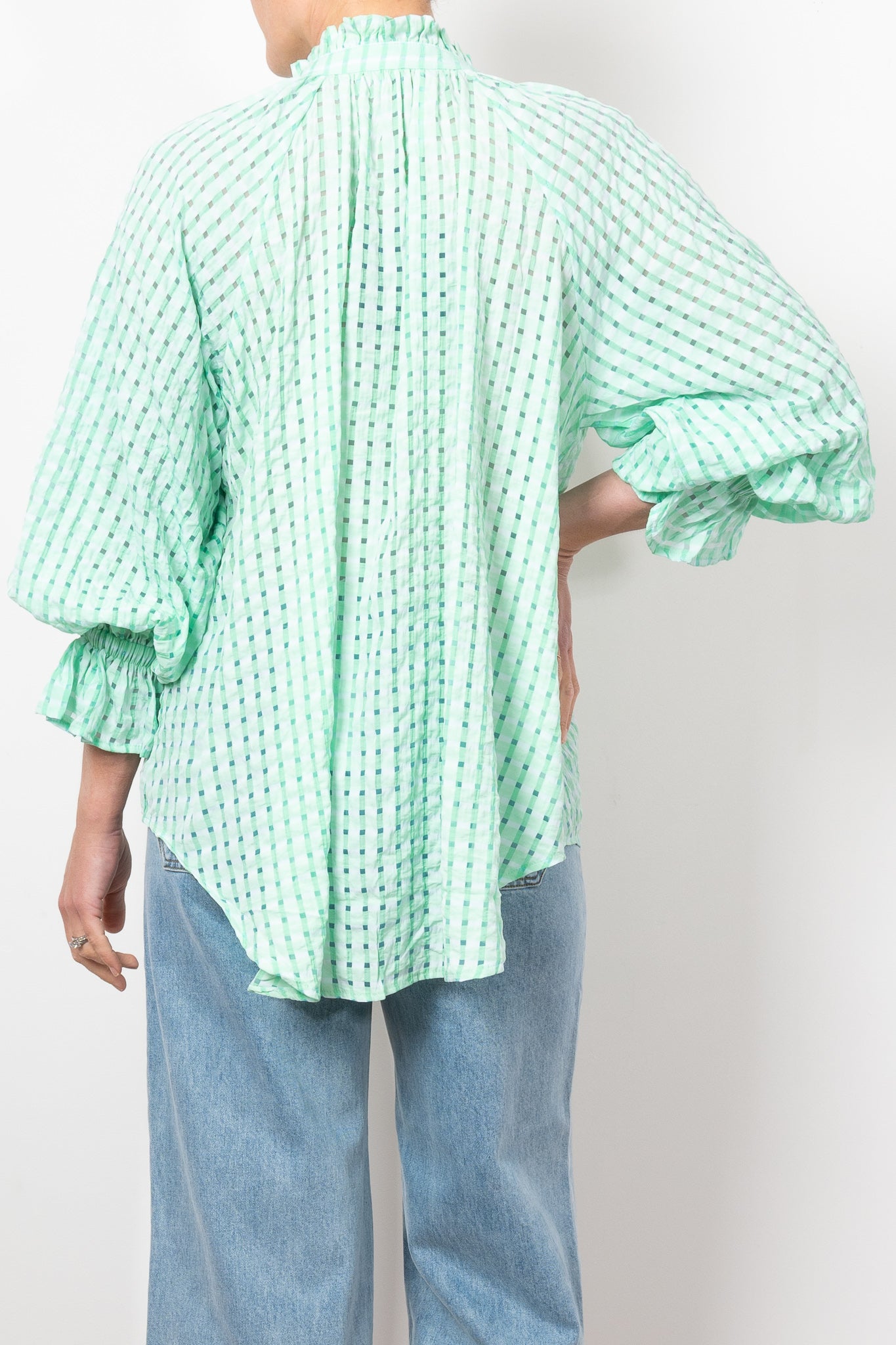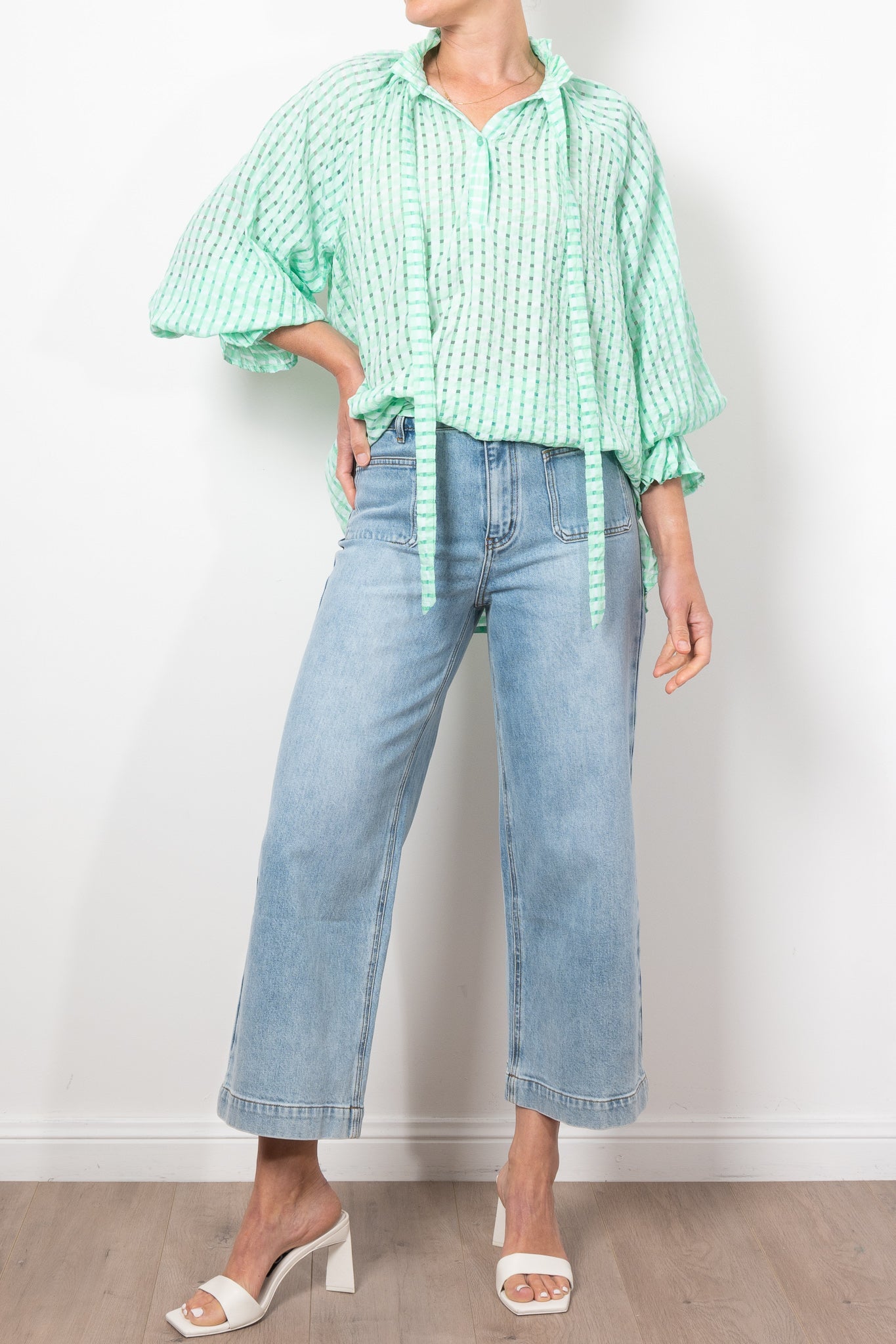 The Alexandra Danill Chequer Top is the perfect blend of effortless style and feminine charm. Made with fluid drapes, tie-up neck detail, a scooped hem, and stunning back pleats, this blouse exudes a nonchalant appeal. With classic details like elasticated cuffs and a button-up front, and finished with delicate frilled cuffs, it is a must-have for any wardrobe.