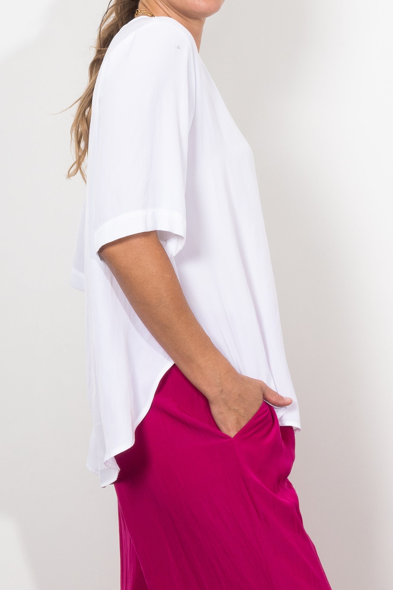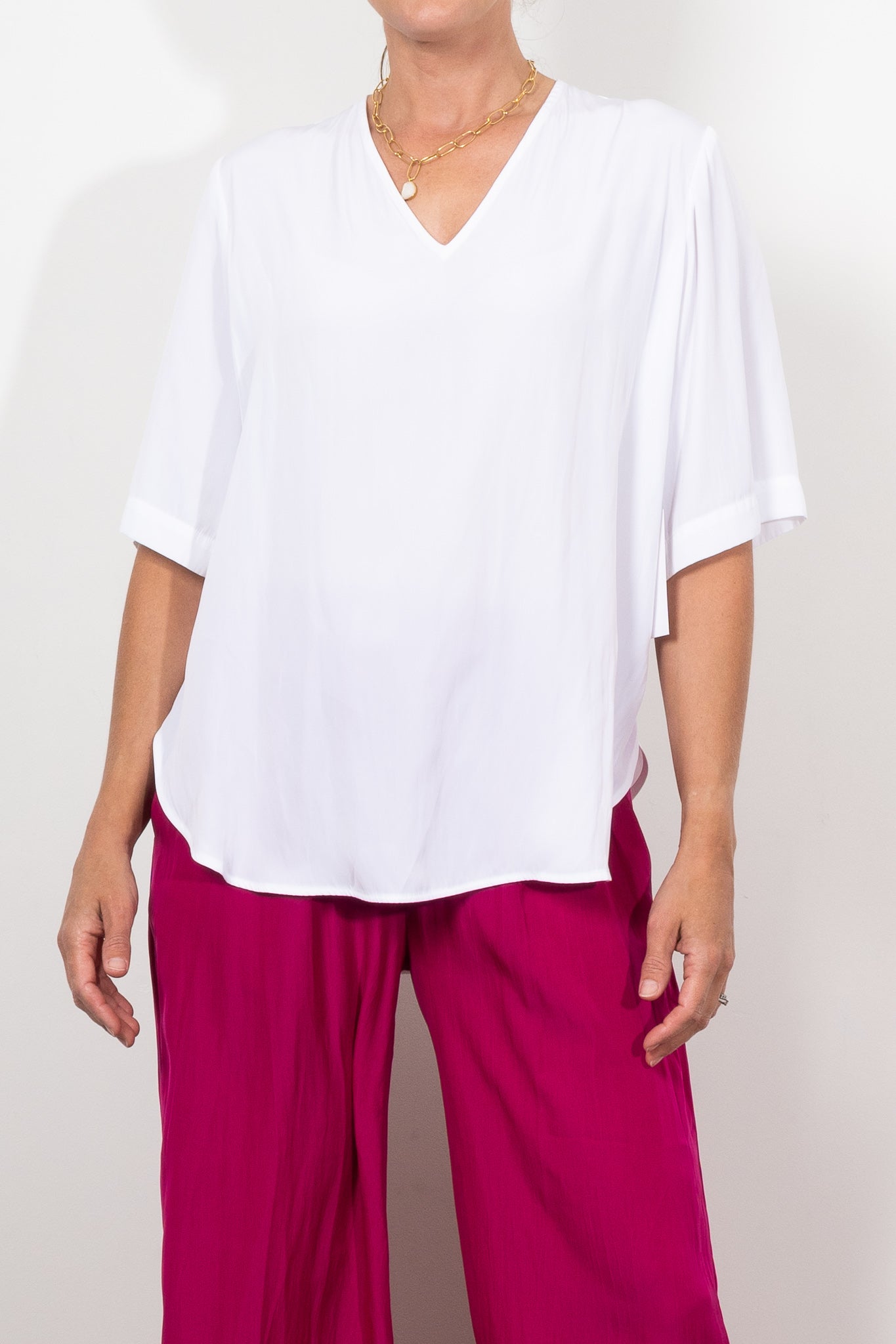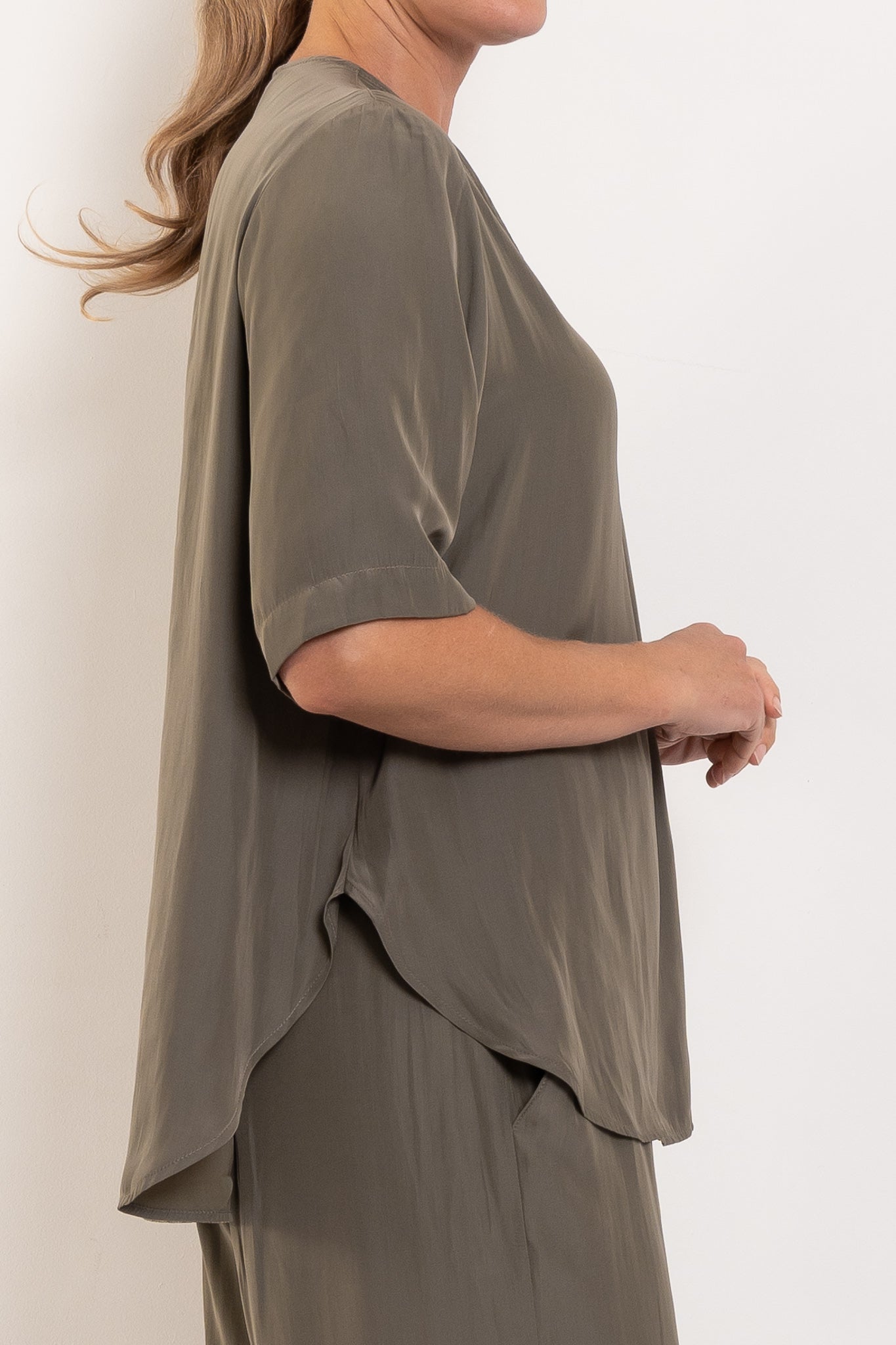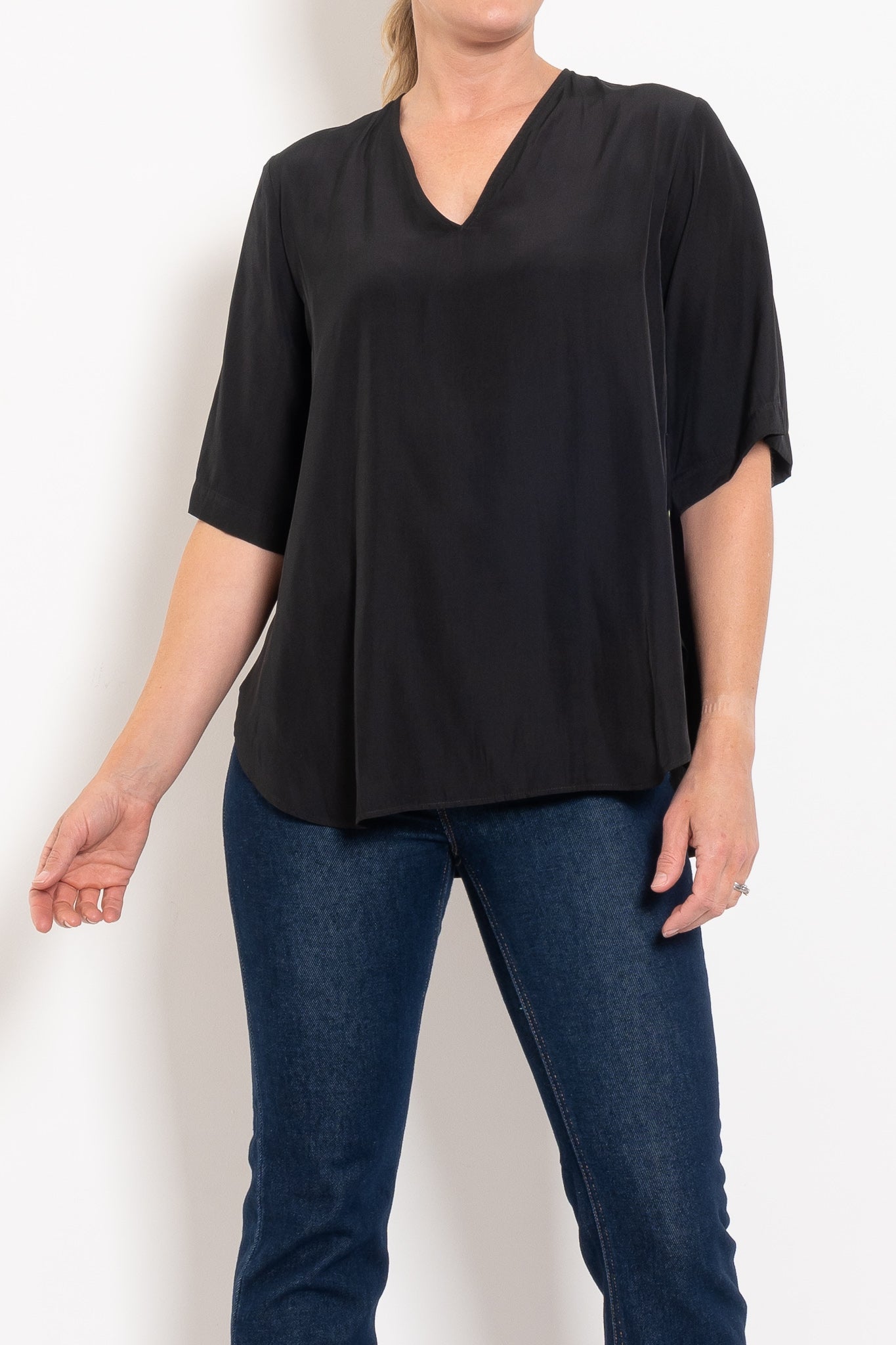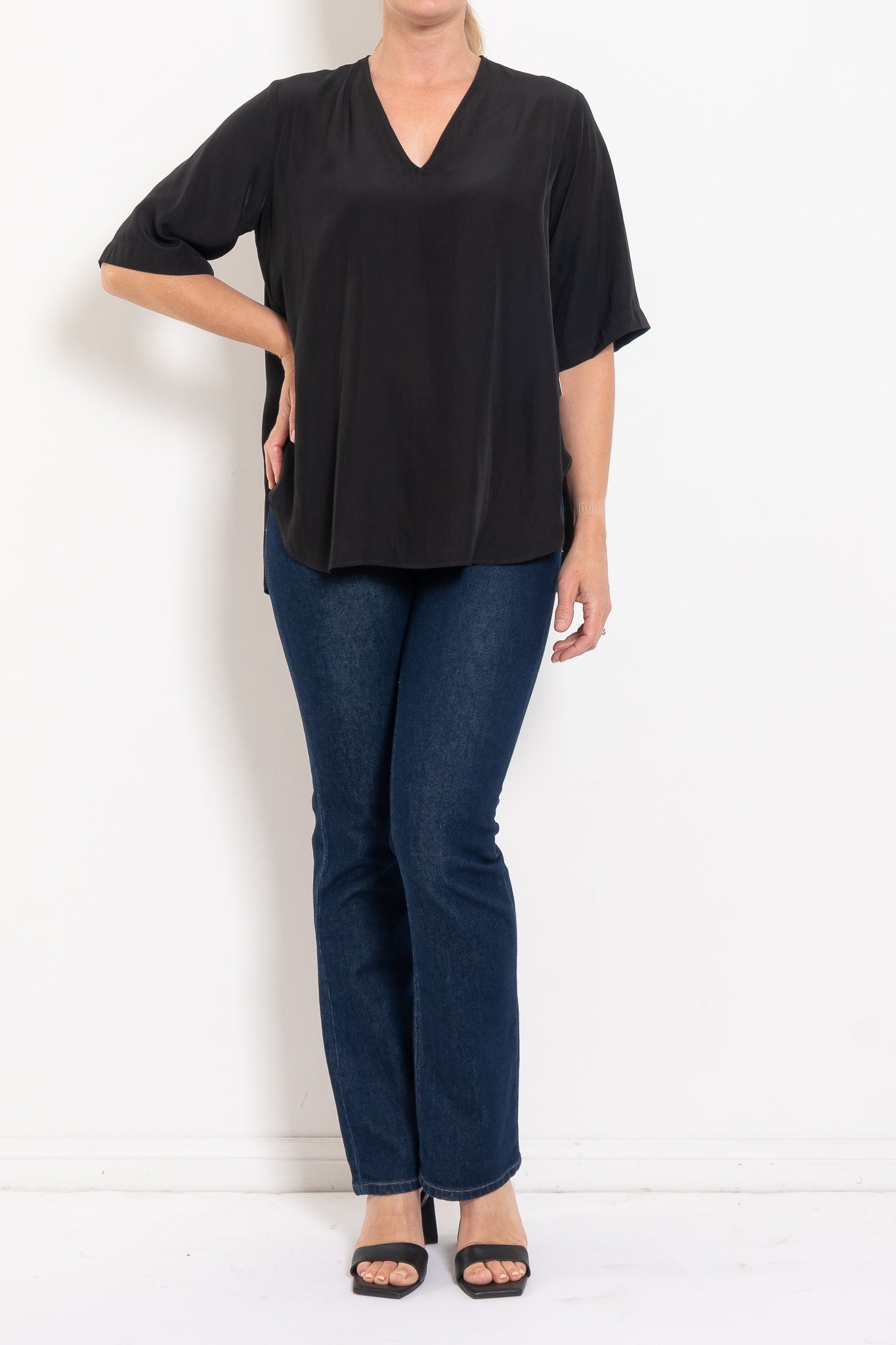 The clean V neckline frames the face and elongates the silhouette, while the curved hem creates a soft, flattering line over the hips. Relaxed 3/4 sleeves keep you cool and comfortable, whether you’re powering through a busy workday or packing it into your carry-on for a weekend away.