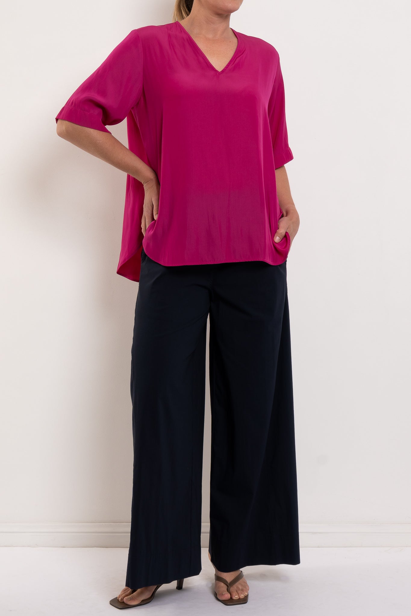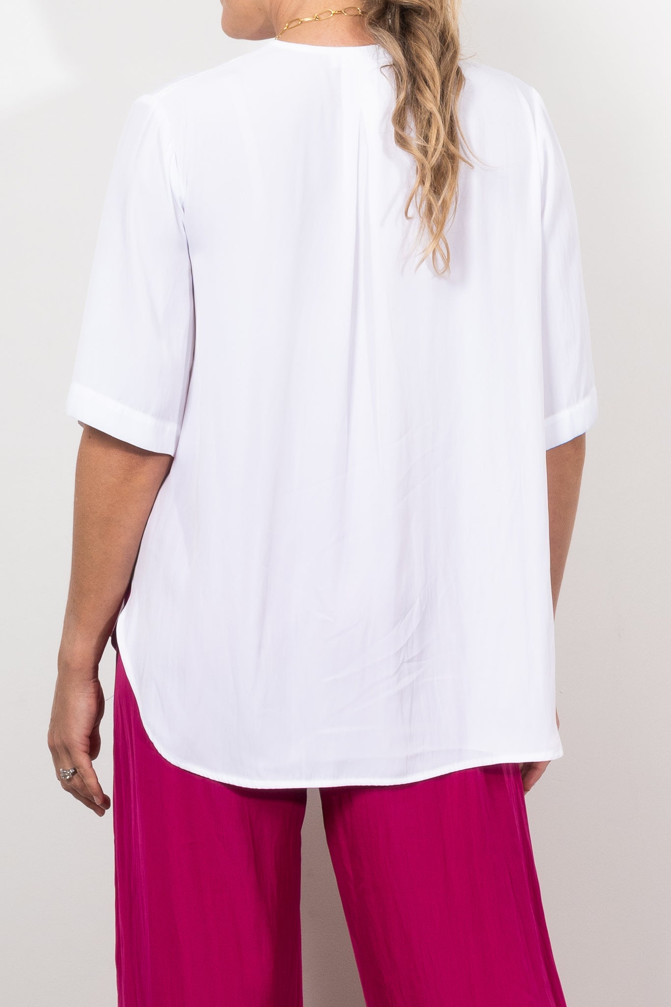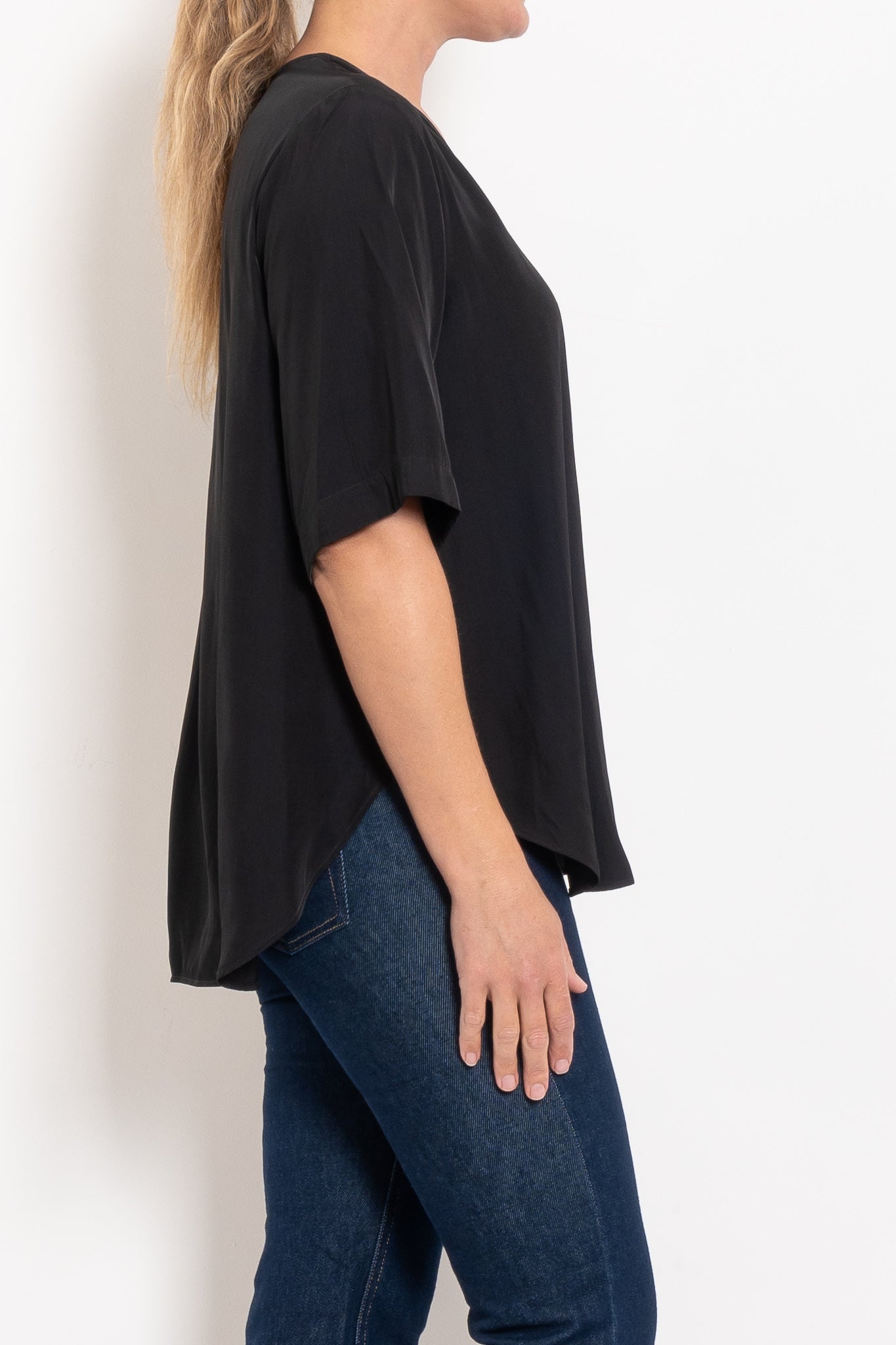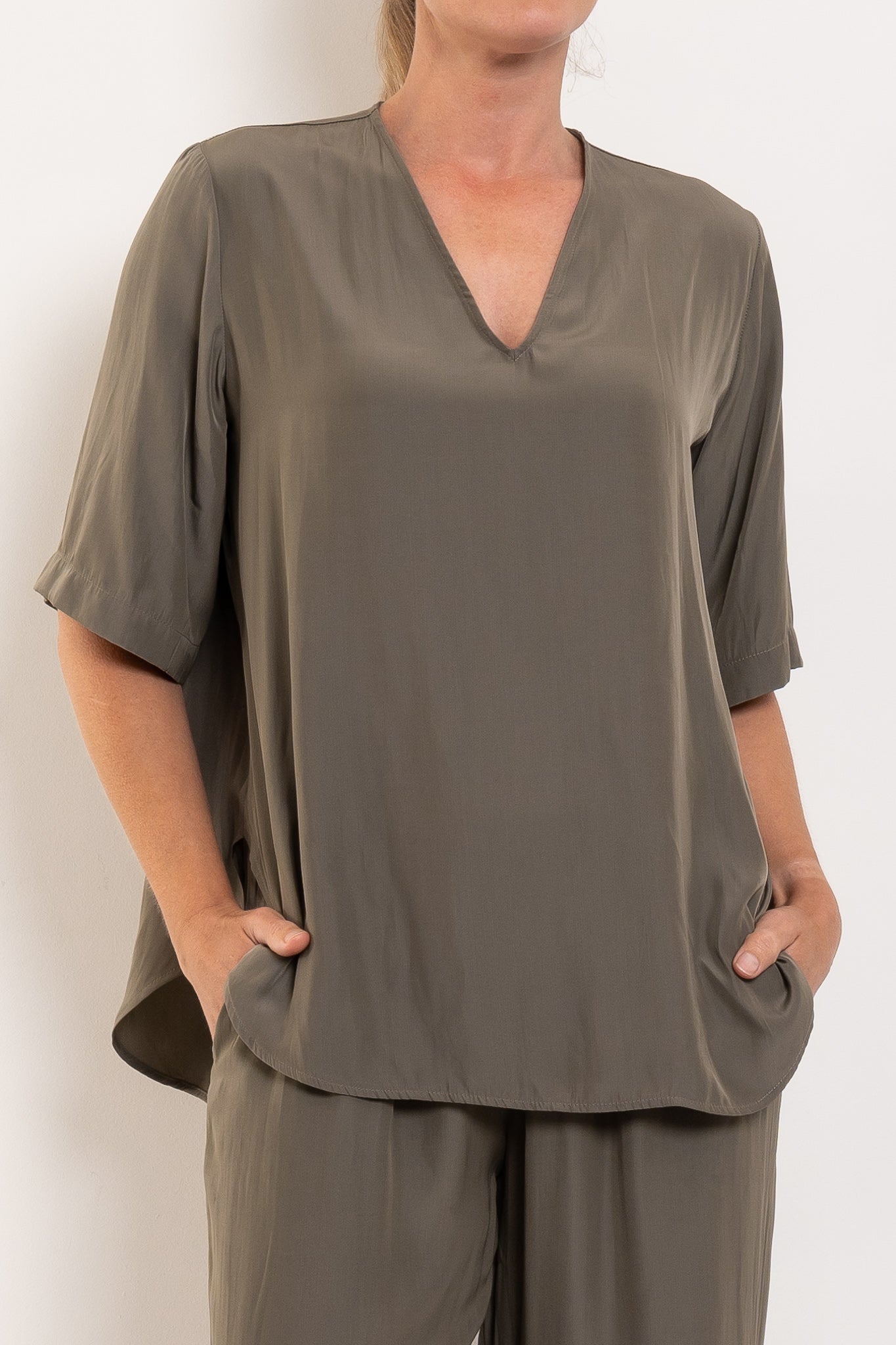 The clean V neckline frames the face and elongates the silhouette, while the curved hem creates a soft, flattering line over the hips. Relaxed 3/4 sleeves keep you cool and comfortable, whether you’re powering through a busy workday or packing it into your carry-on for a weekend away.