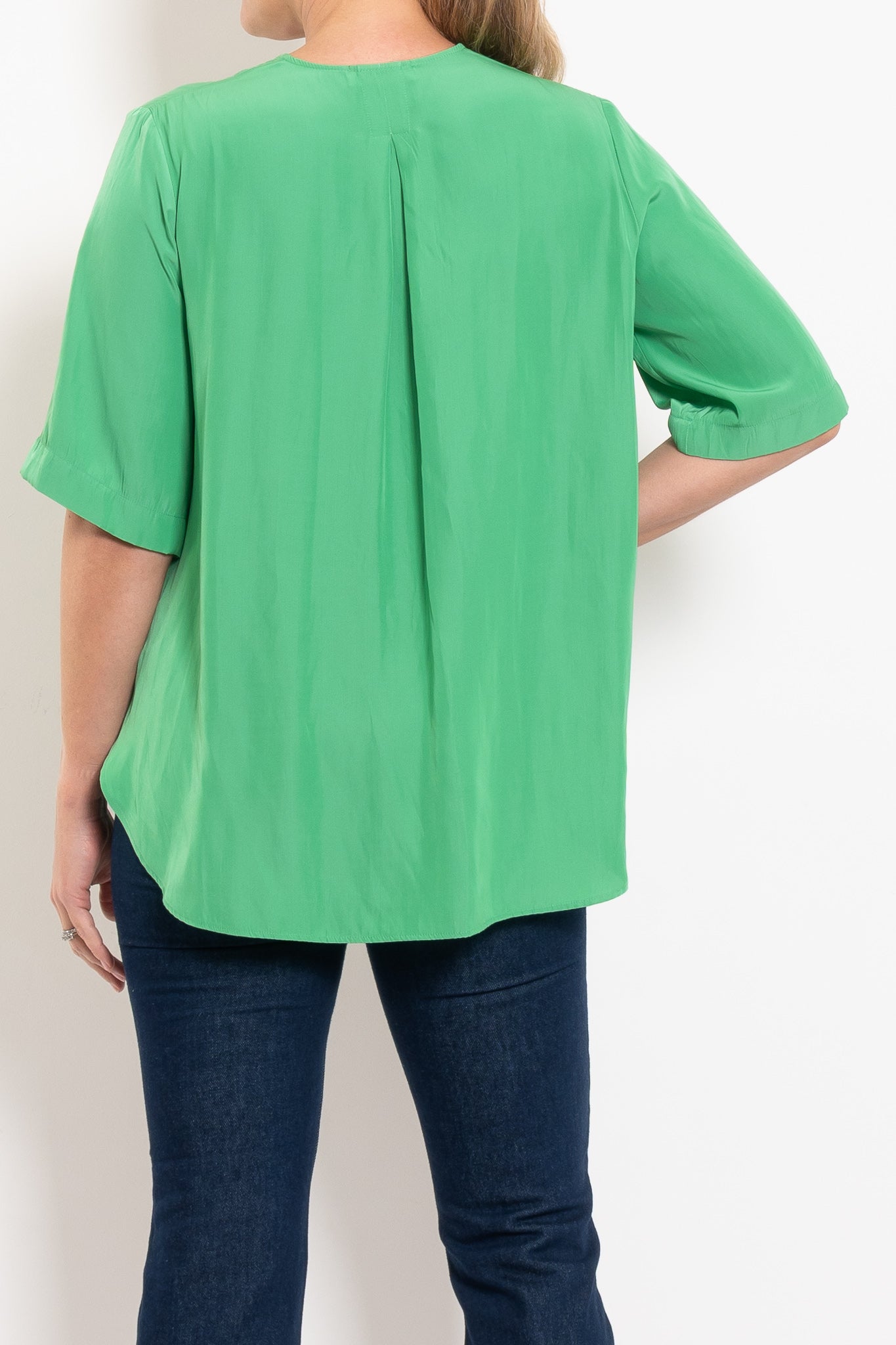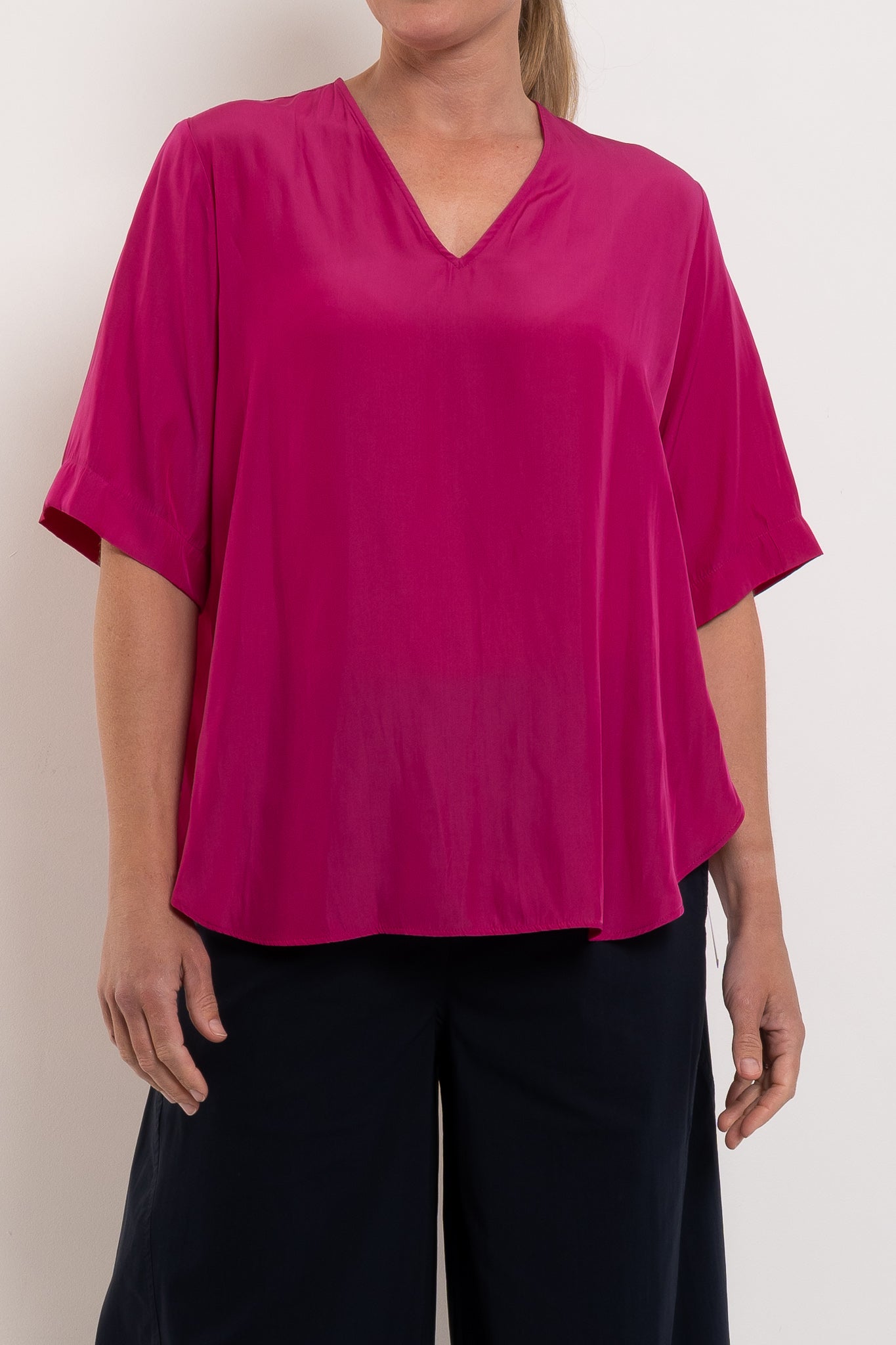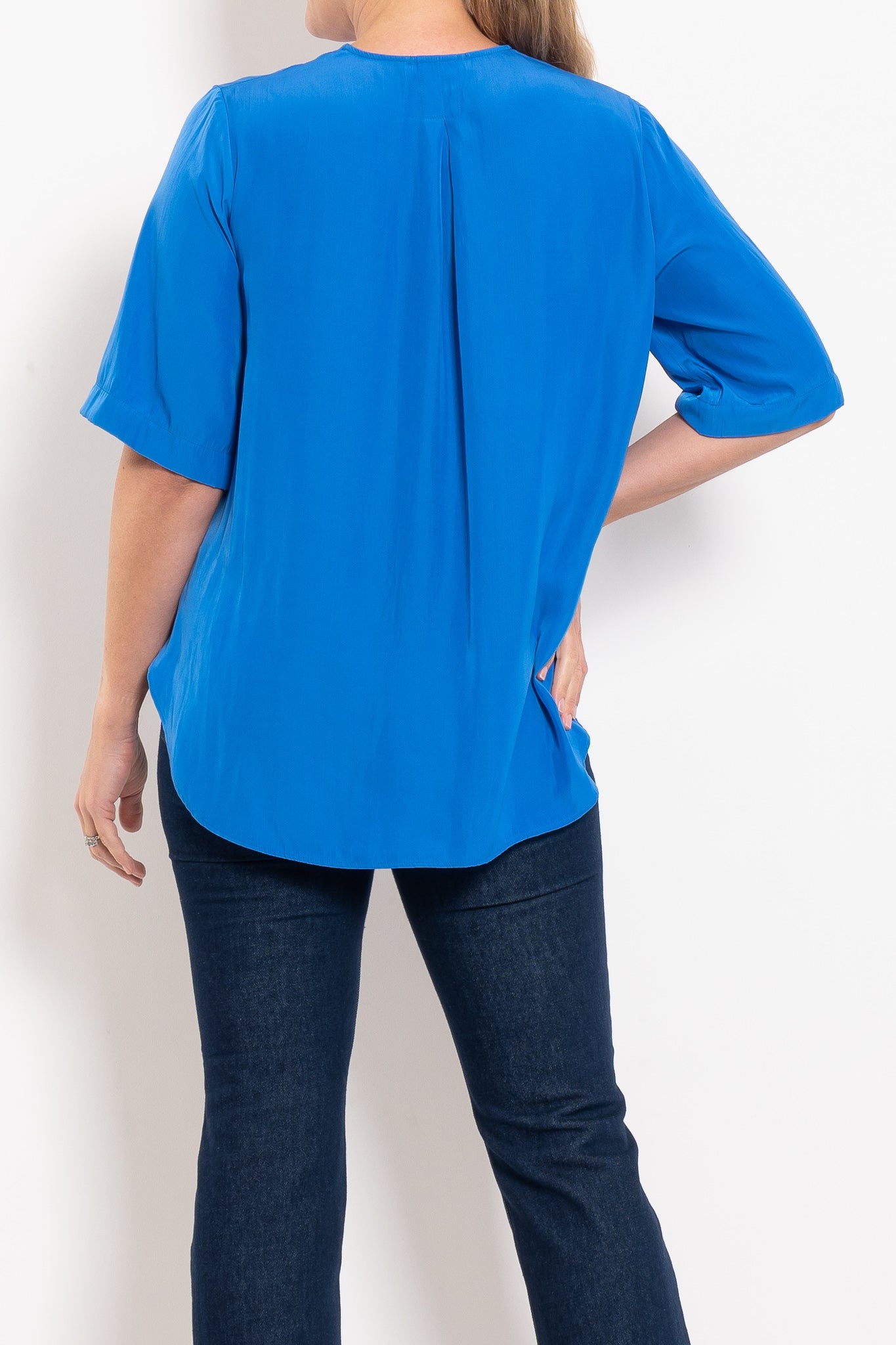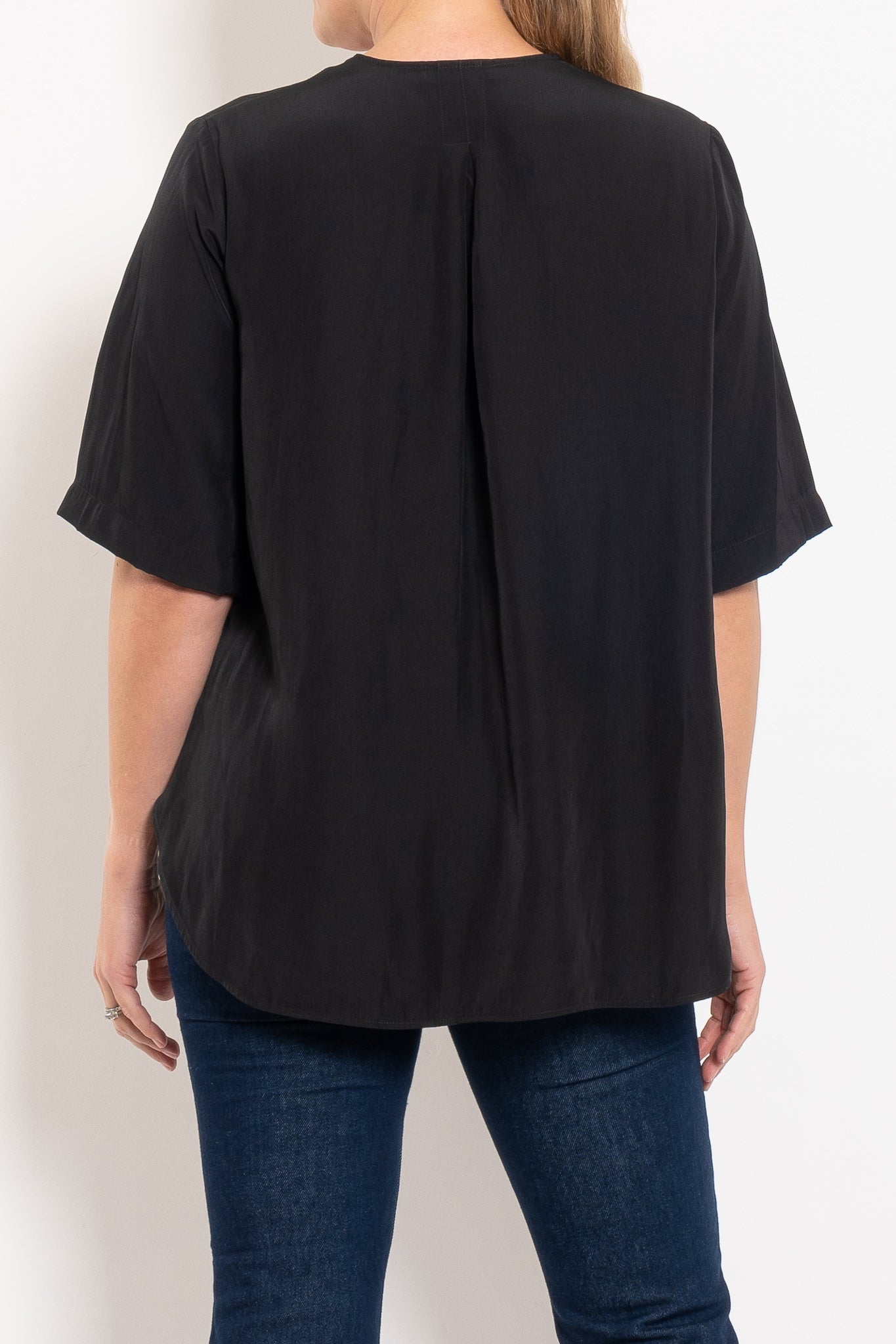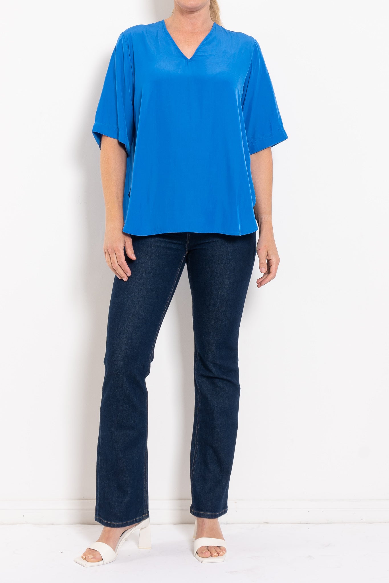 The clean V neckline frames the face and elongates the silhouette, while the curved hem creates a soft, flattering line over the hips. Relaxed 3/4 sleeves keep you cool and comfortable, whether you’re powering through a busy workday or packing it into your carry-on for a weekend away.