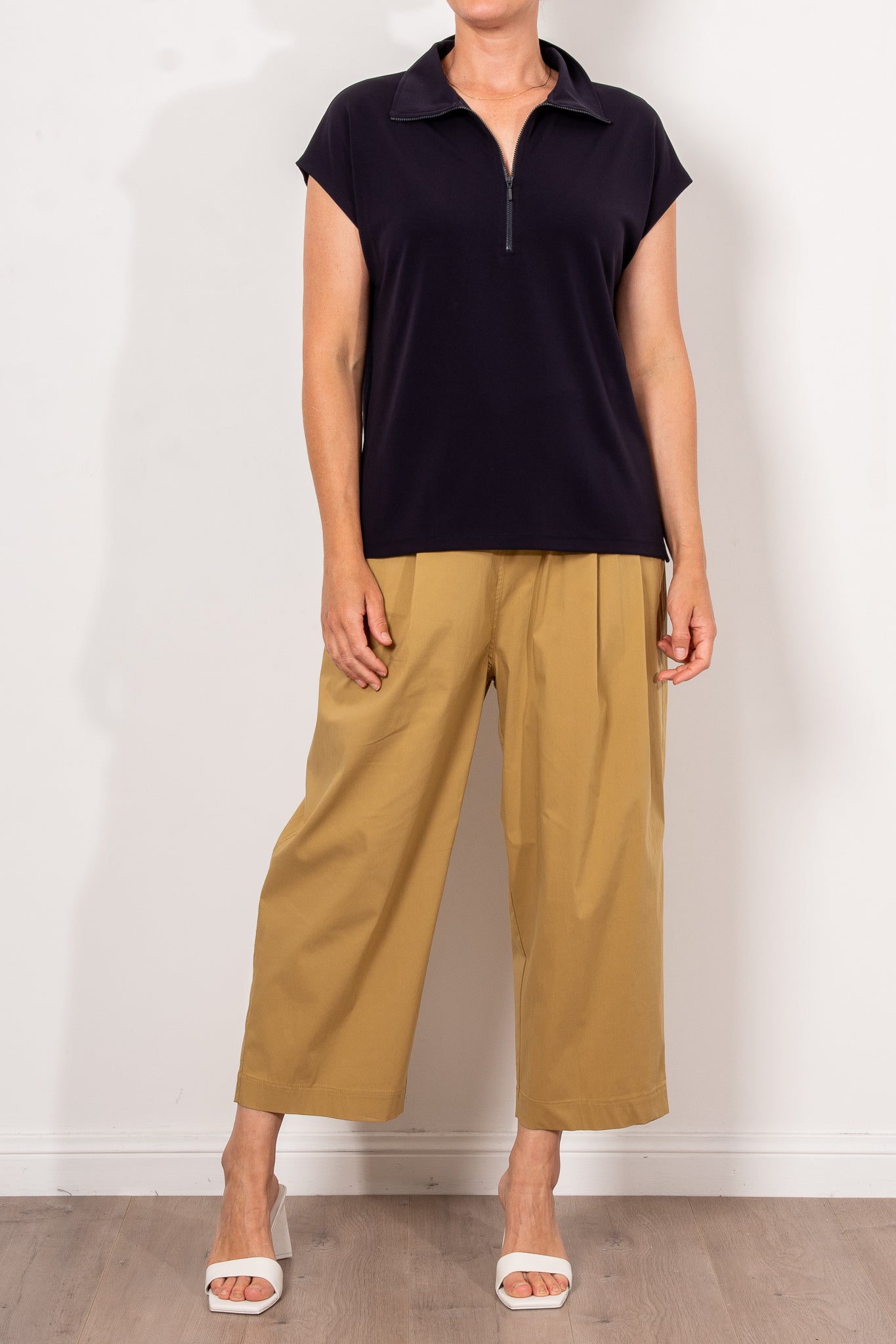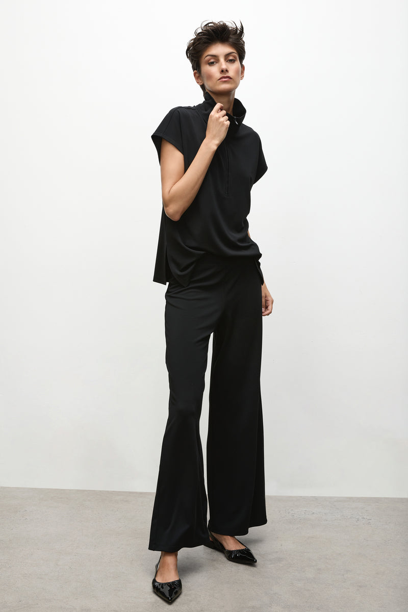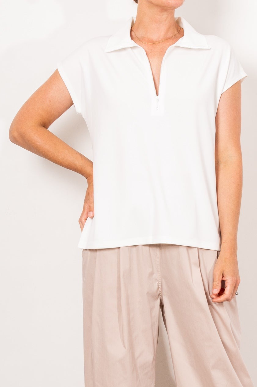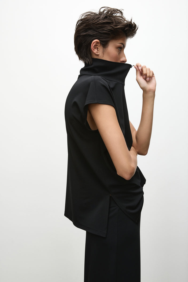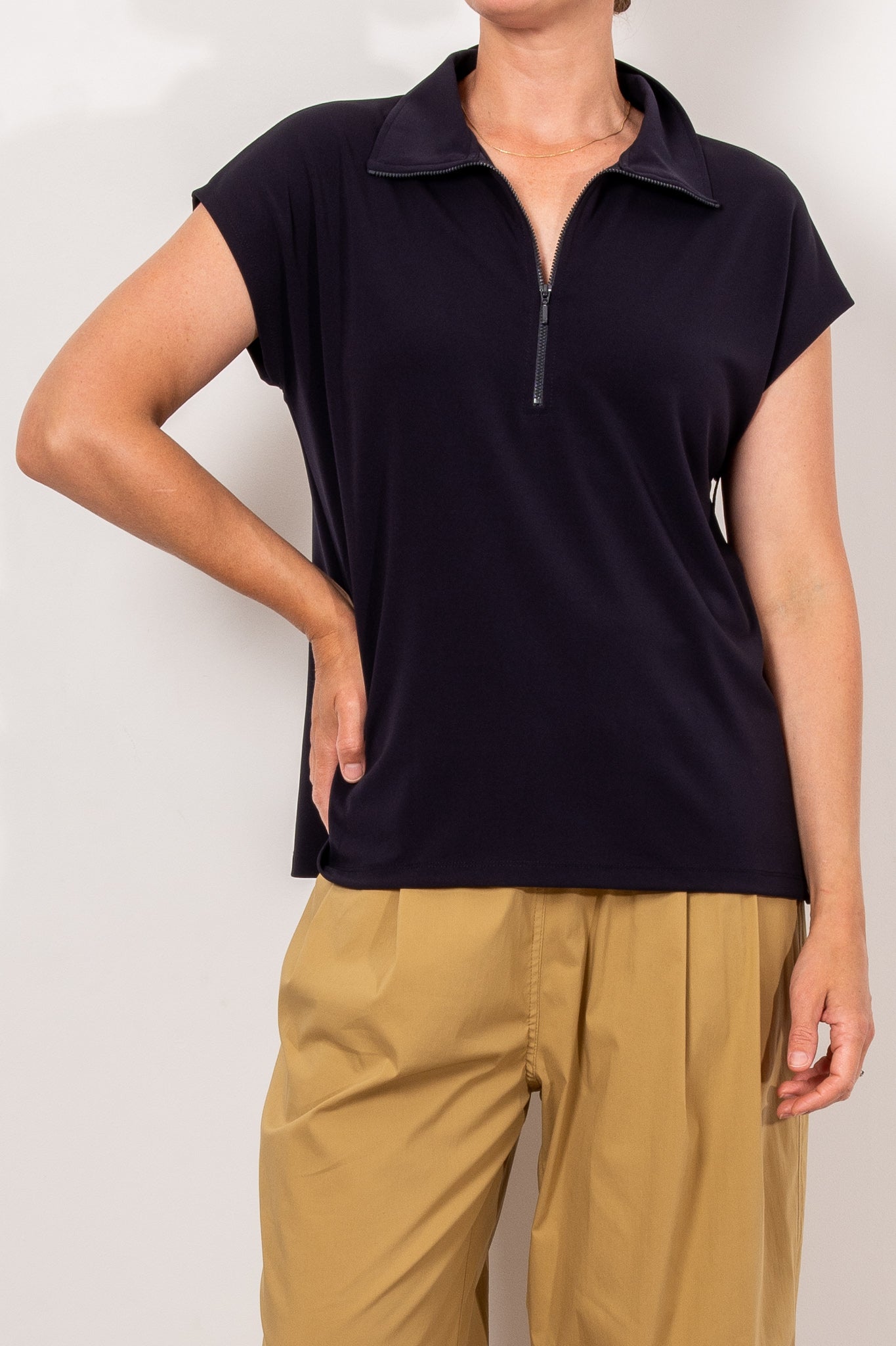 This Mela Purdie Zip Front Shell is perfect for all occasions. Crafted from a Japanese compressed Matte Finish Powder Knit with a firm stand collar and cap sleeves, this mid-length top offers a flattering silhouette. Zip front detailing and easy care make it a must-have for anyone's wardrobe. Uniquely designed and made in Australia!