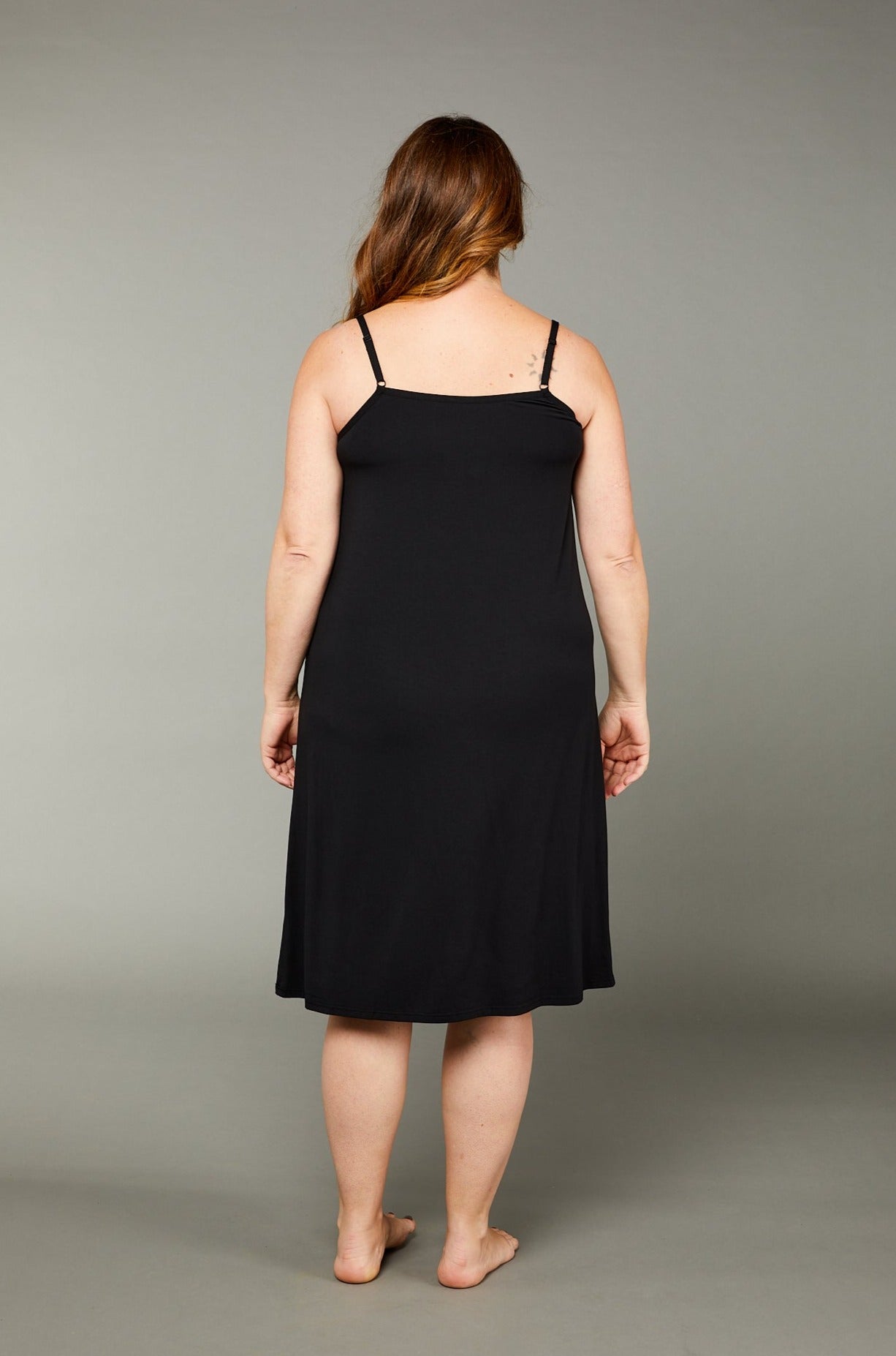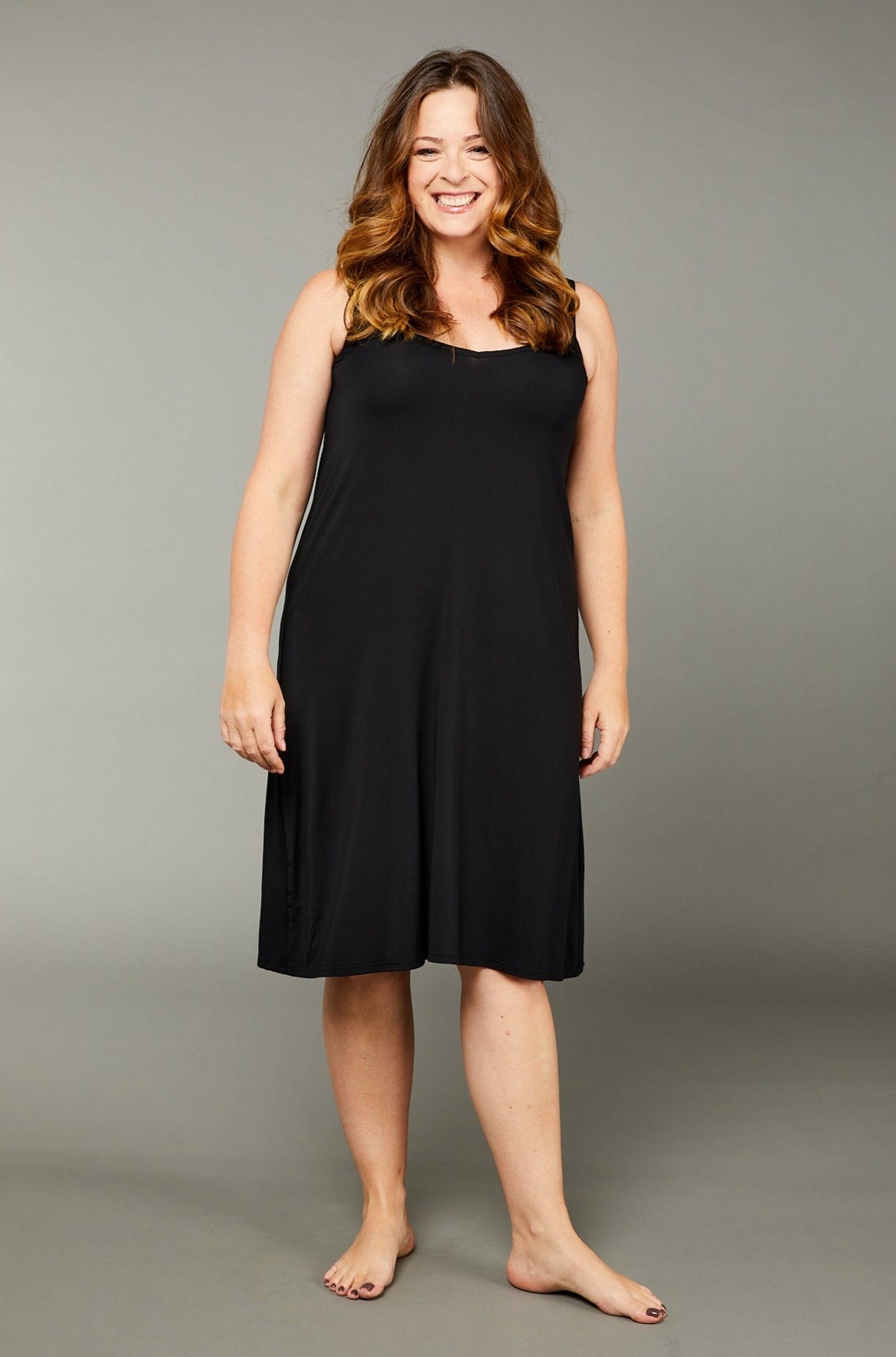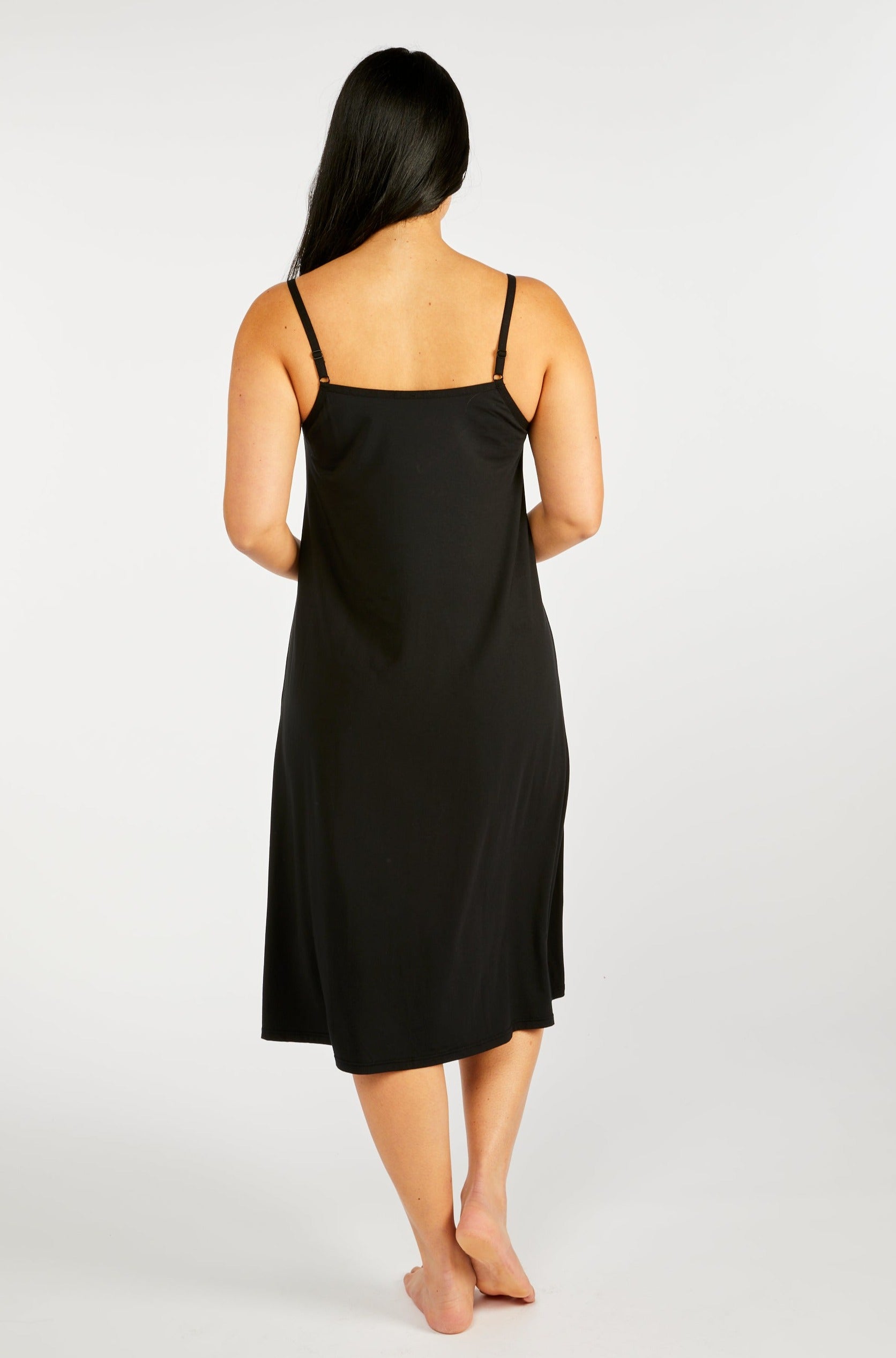 This new long slip is fuller, less body hugging than the original Tani short slip. The Amy slip has wider, adjustable shoestring straps, v-neckline and falls below the knee. Perfect for layering under sheer dresses.