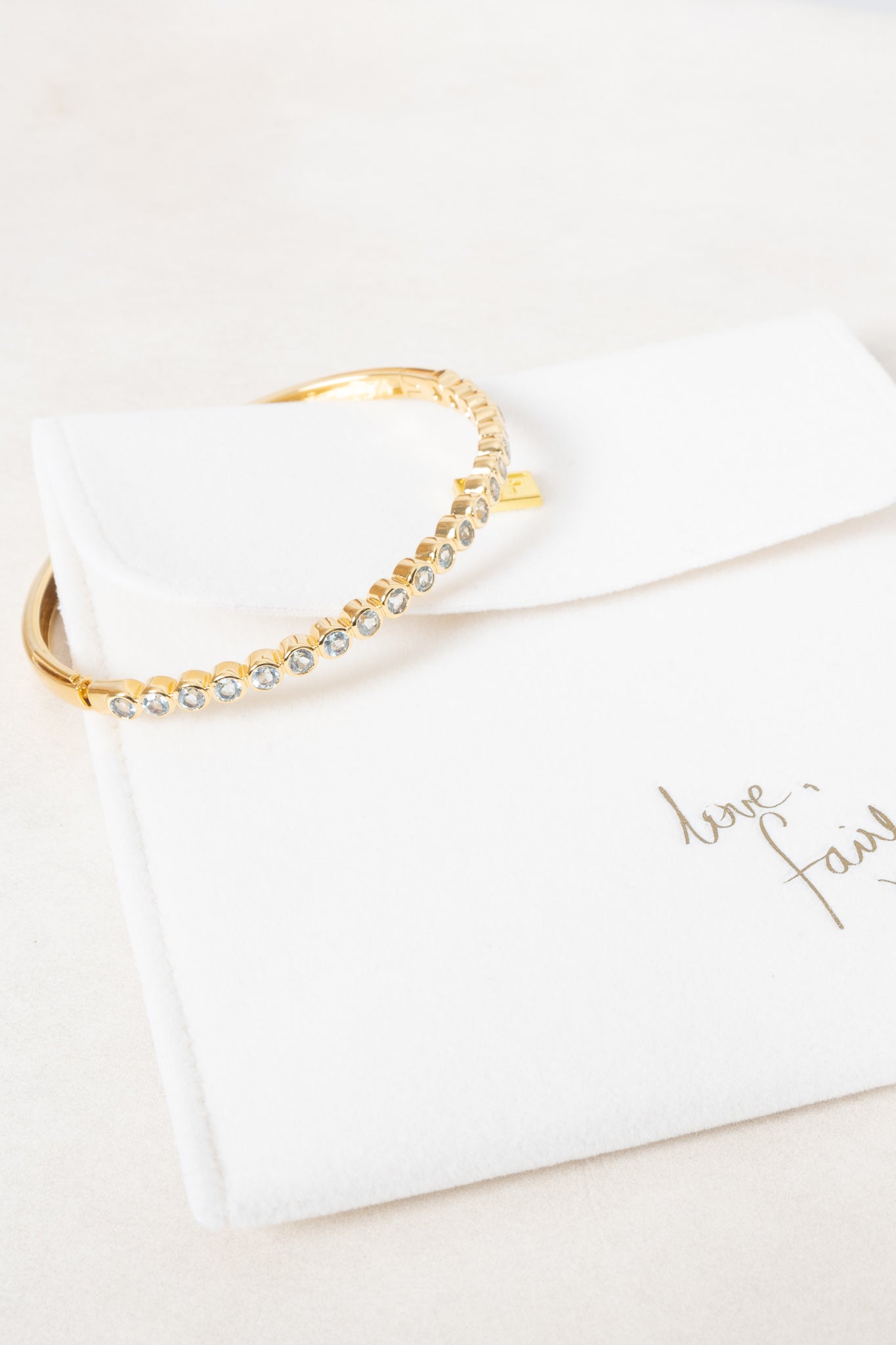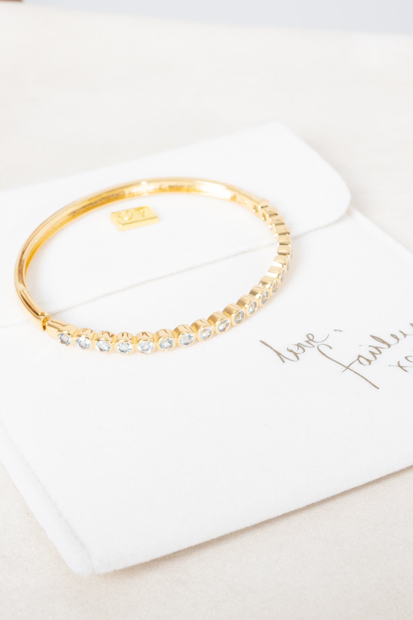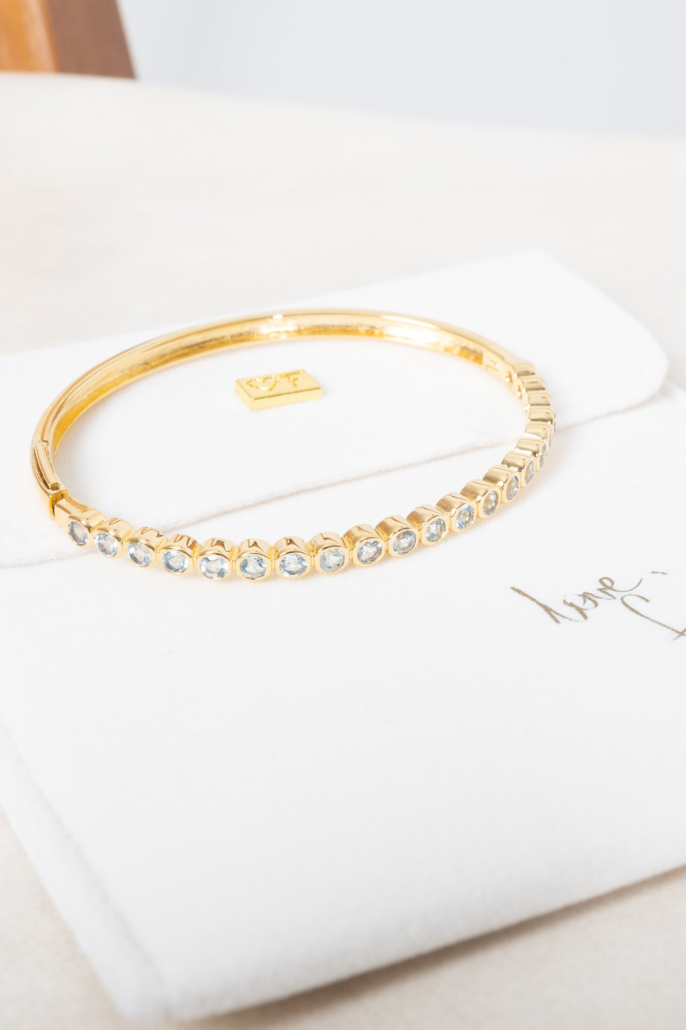 Encrusted with 21 tantalizing pale blue Topaz, this chic bangle with a hinged opening will add some serious luxury to your wrist. Looks great worn solo or part of an arm stack.