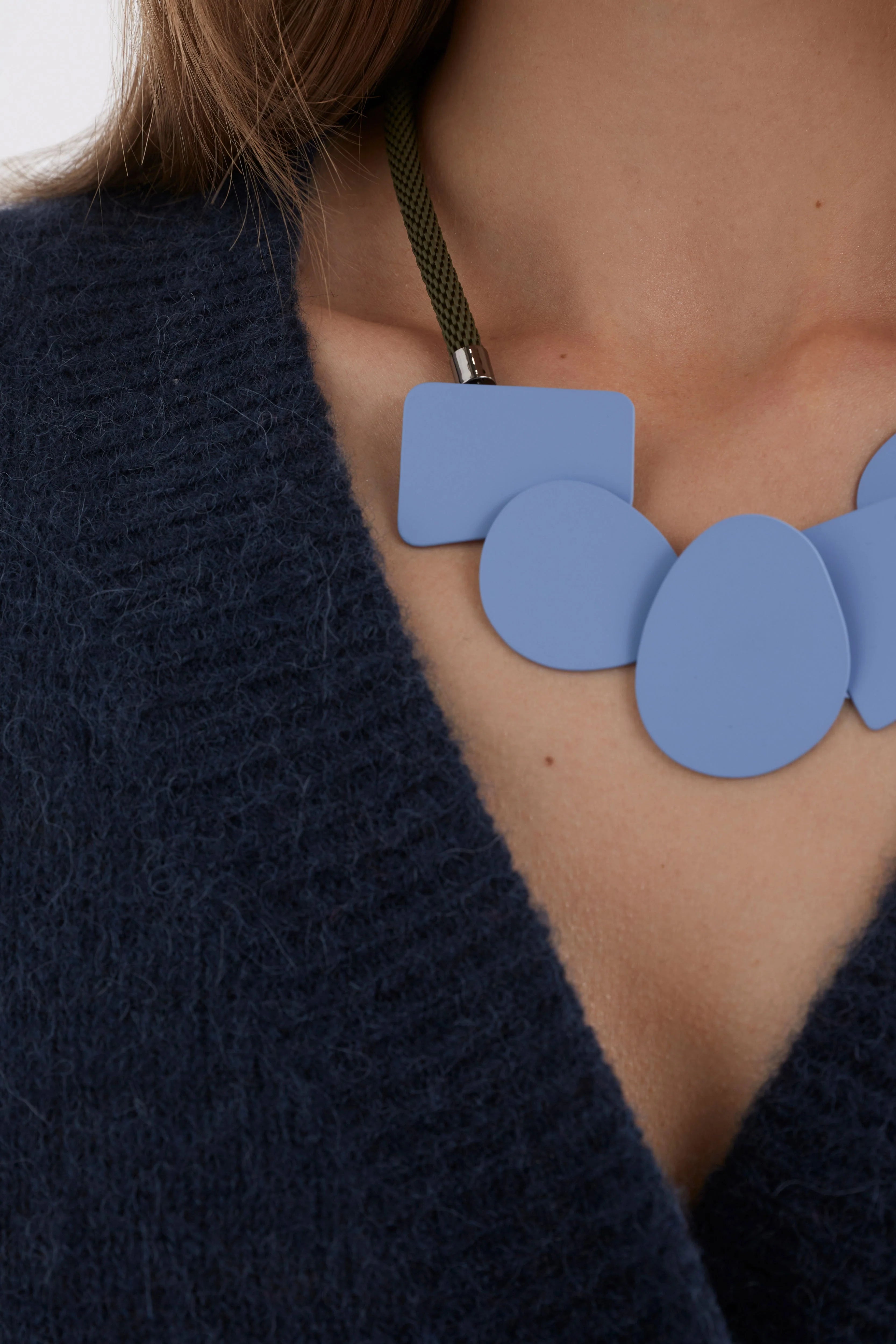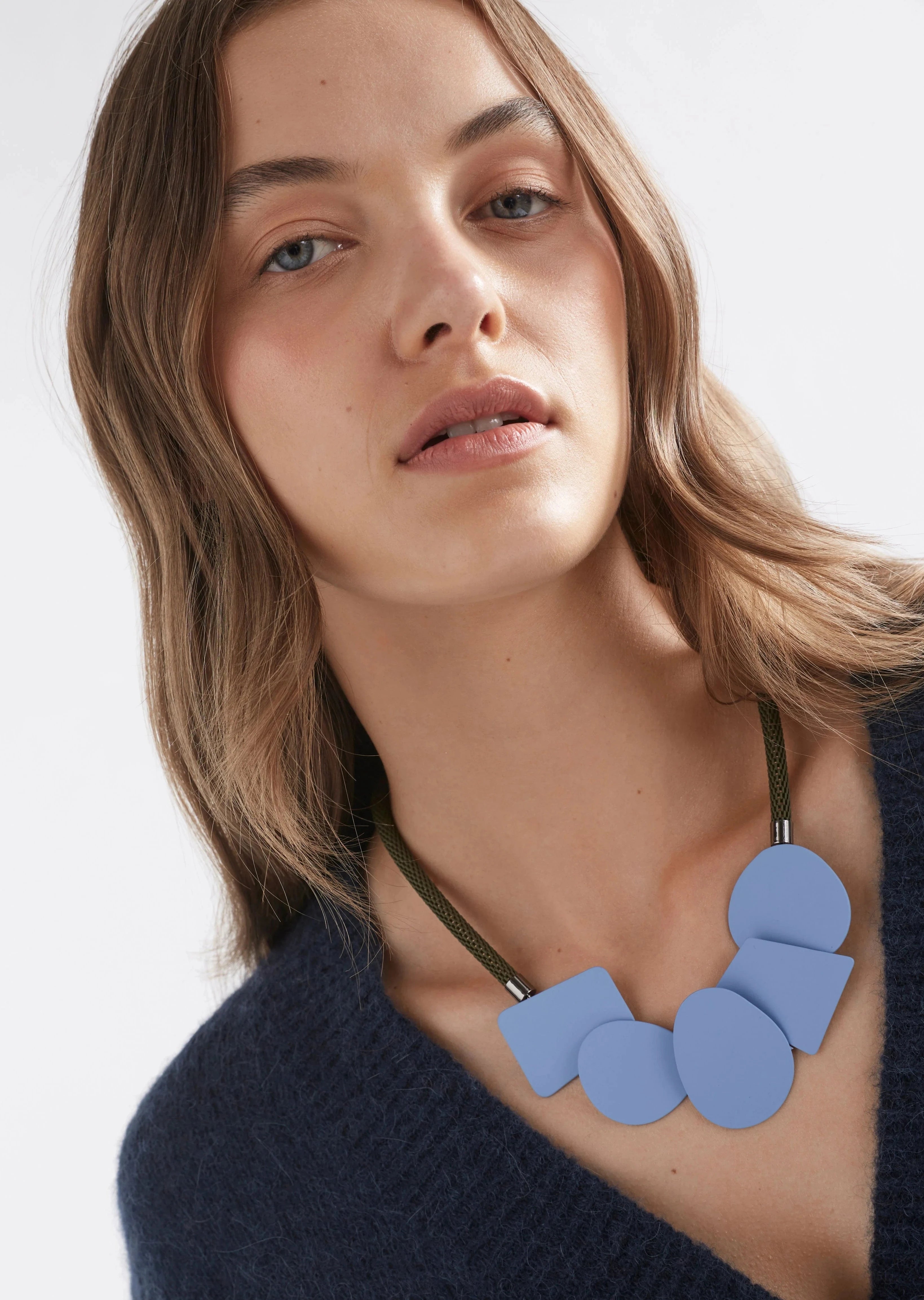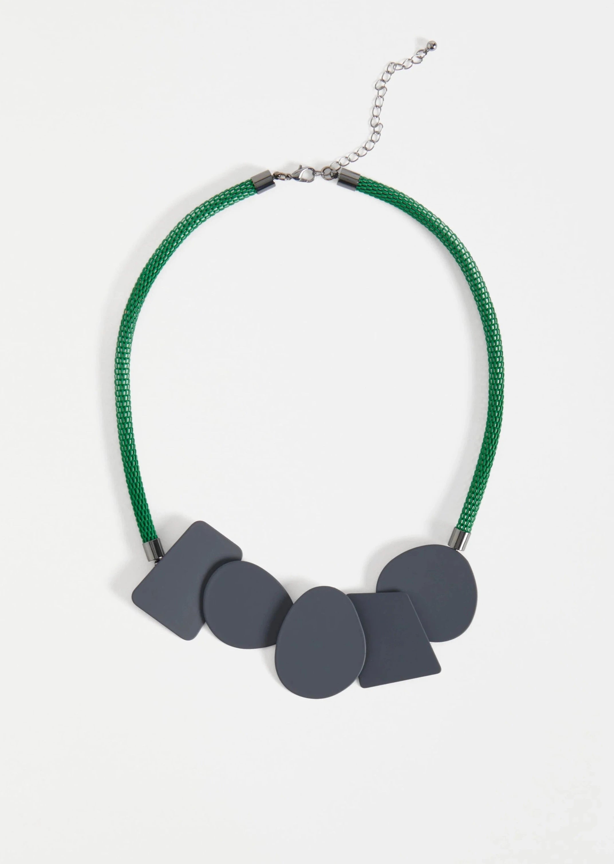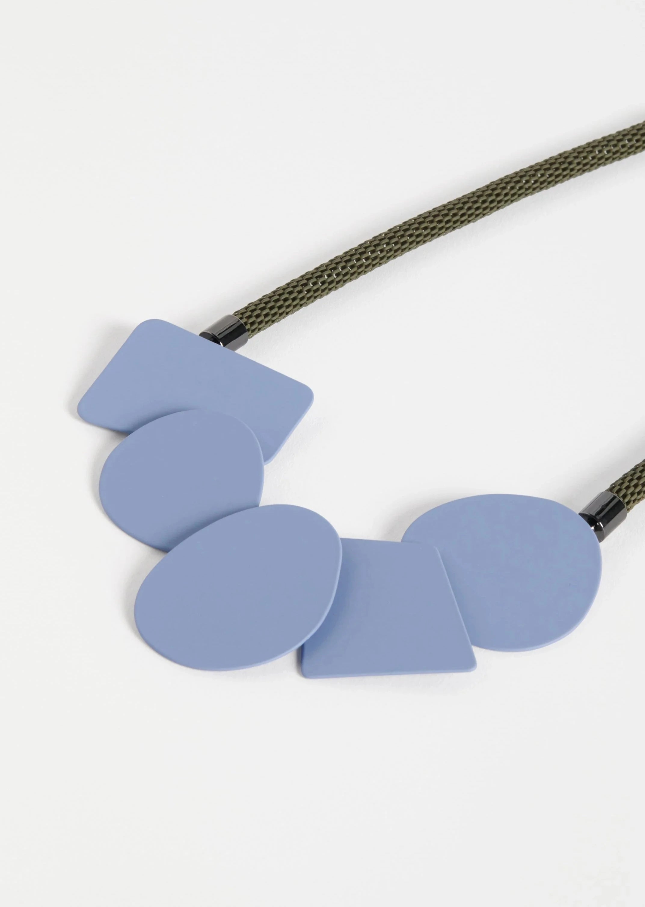 The Hillt Necklace features geometric shapes in an asymmetrical layout. A mix of round and square shapes with rounded edges in rubberised metal contrast with a coloured mesh chain. There is slight movement in the necklace thanks to the jump rings connecting the shapes. The style comes in both a lighter and darker colourway.