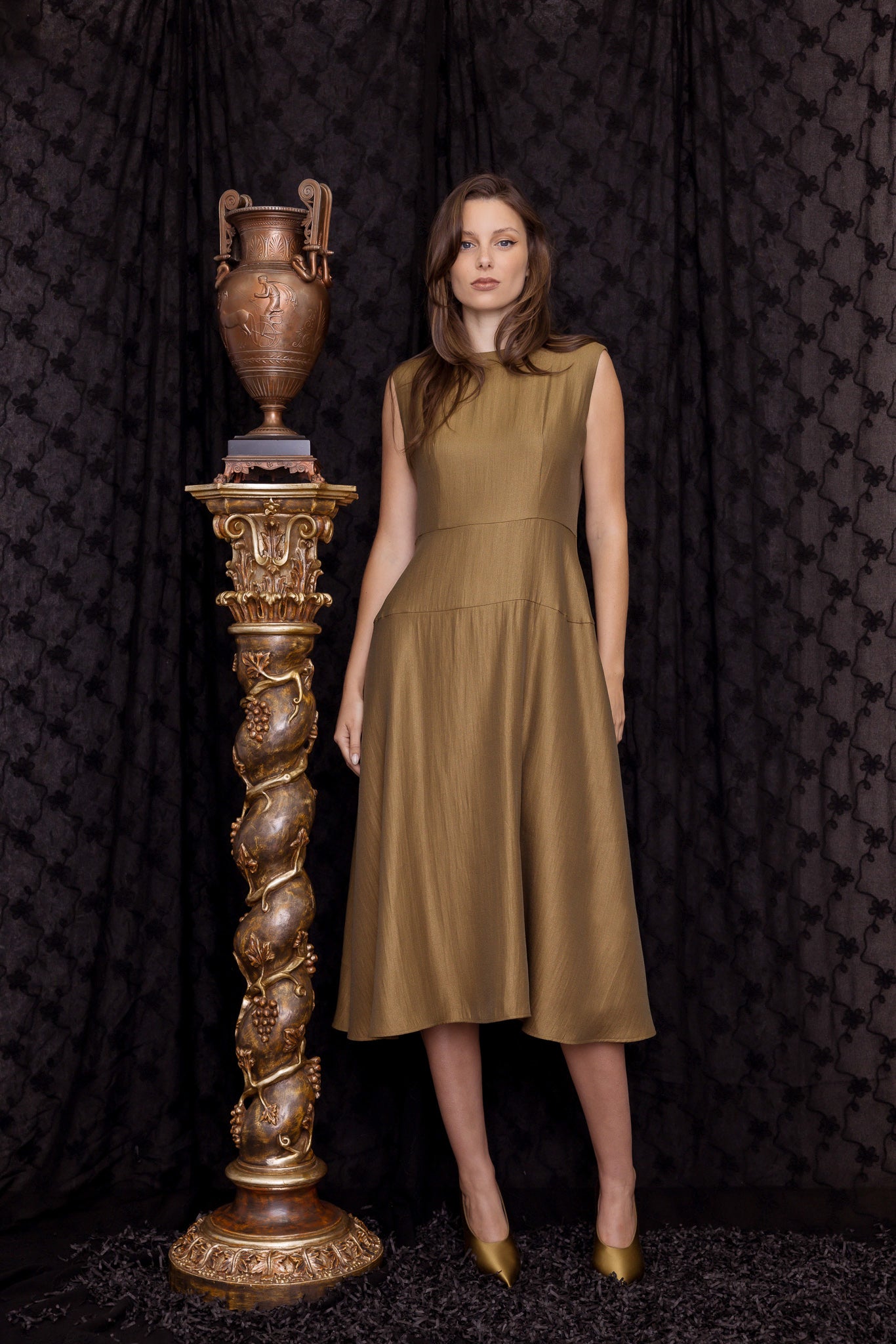 Fall in love with the striking bronze and petrol colourways of the Mosey Dress from M.A. Dainty! This classic fit and flare dress is perfect for any event, with its fitted bodice and full skirt. Timeless and elegant, you'll surely turn heads. Pair with the matching Opera Jacket for a luxurious ensemble.