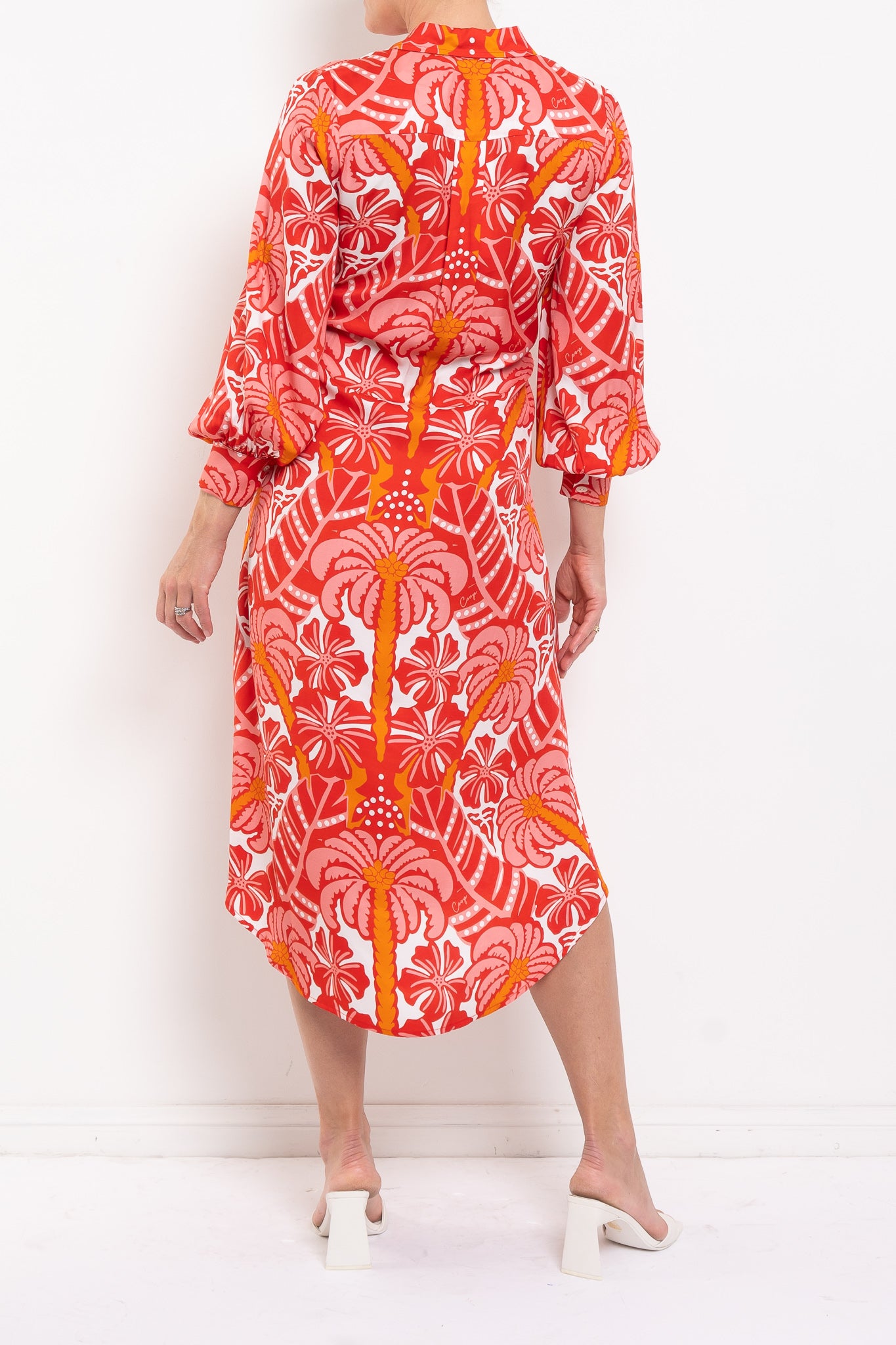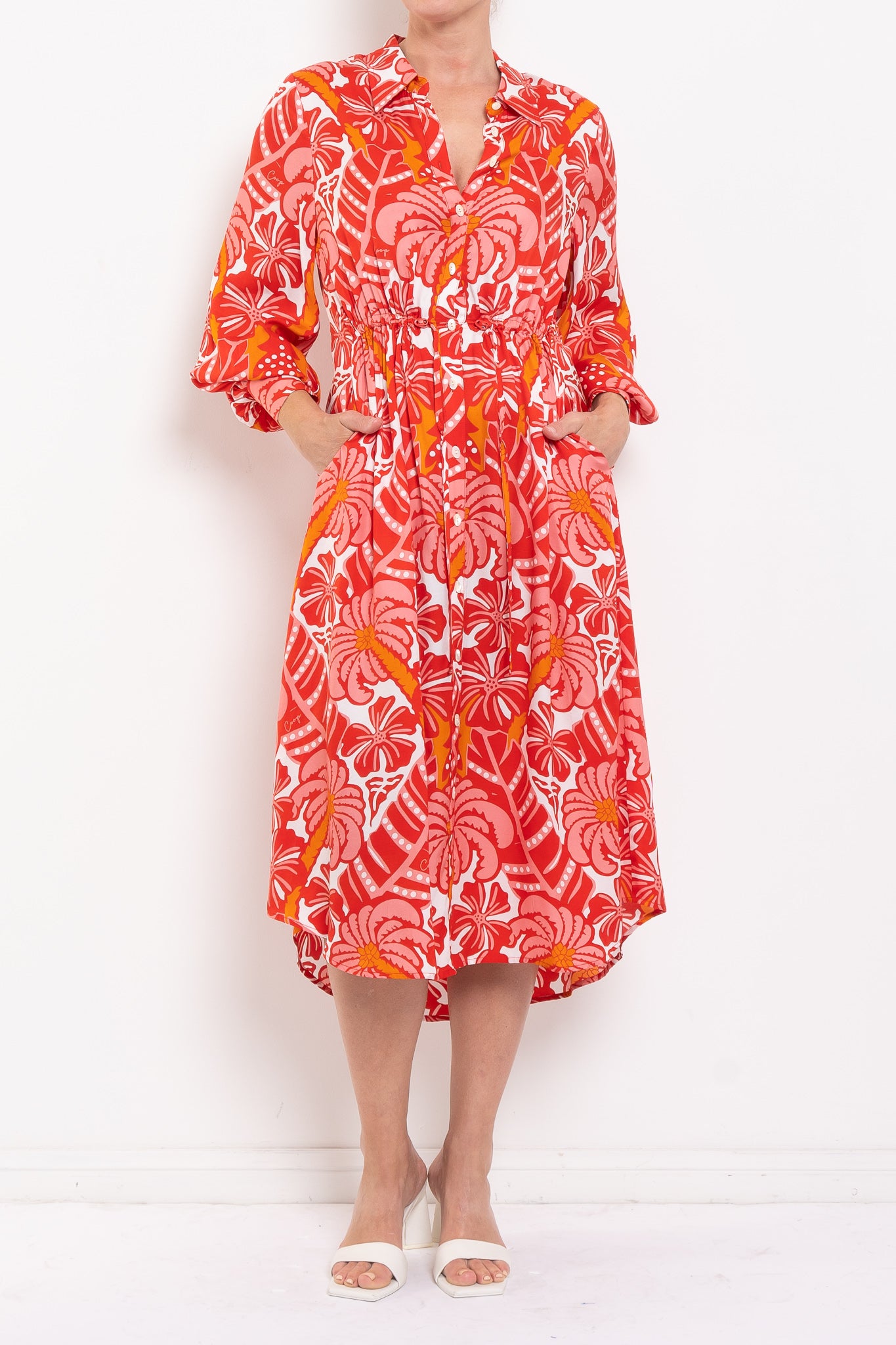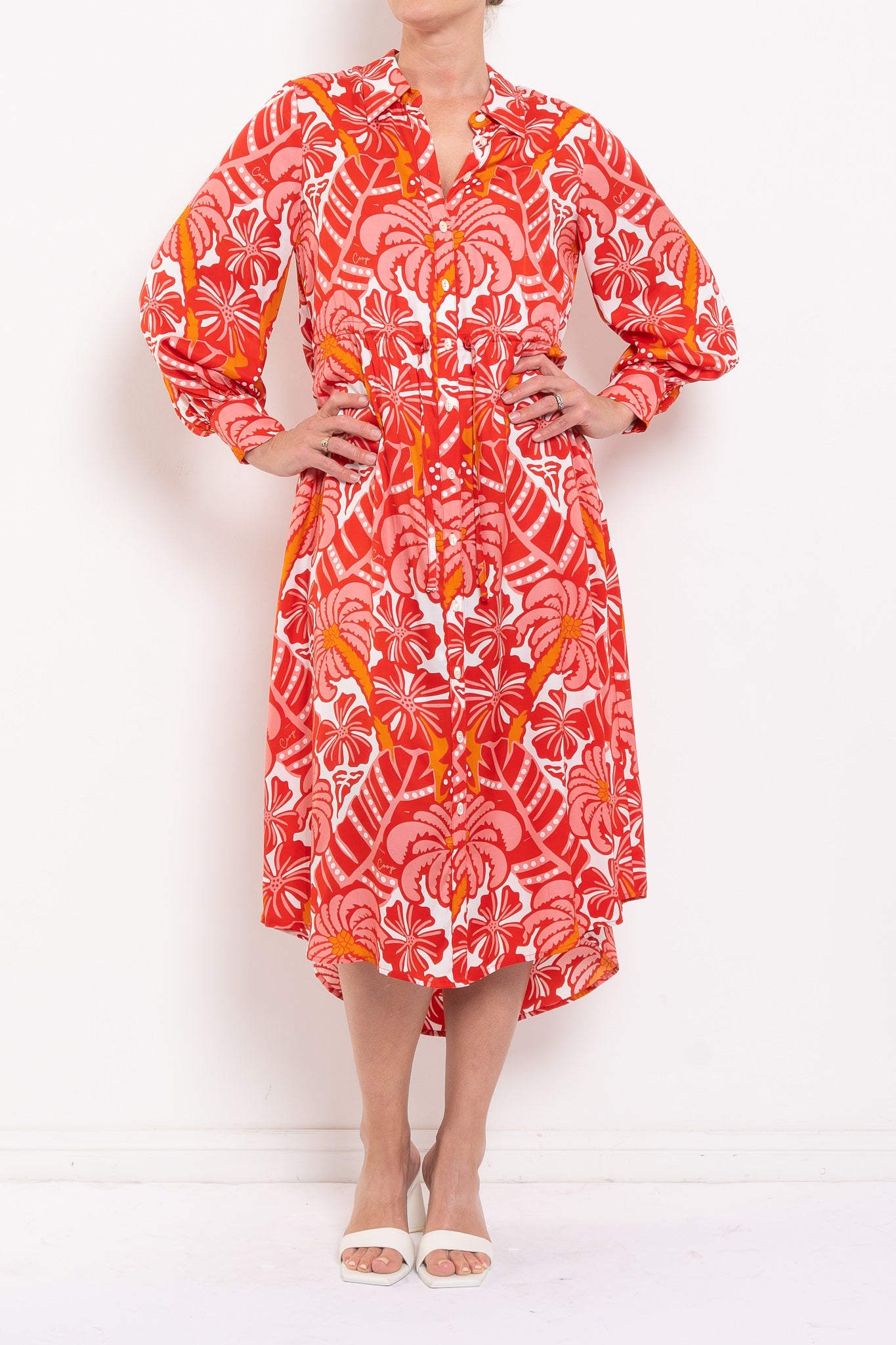 Flaunt vibrant colours and bold patterns this season with the showstopping ‘Tropical Punch’ fabrication, in the ‘Draw Me Near’ dress. Showcasing a button through design, with full sleeves and cuffs, the dress features a draw cord at the front that can be used to cinch in the waist for added shape. A perfect throw on dress for when you can't decide on what to wear.