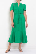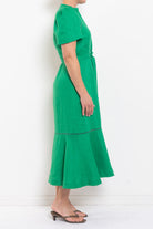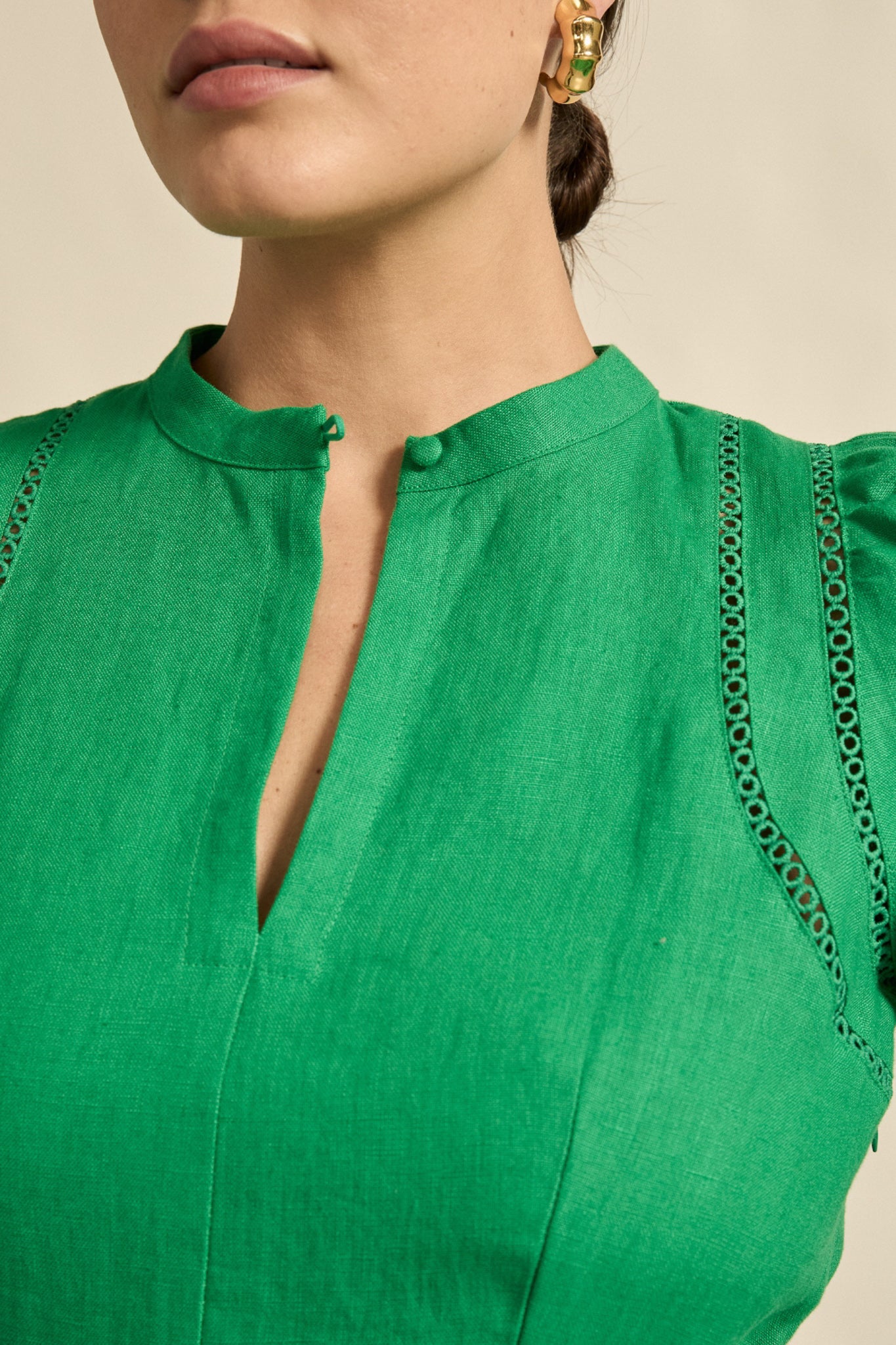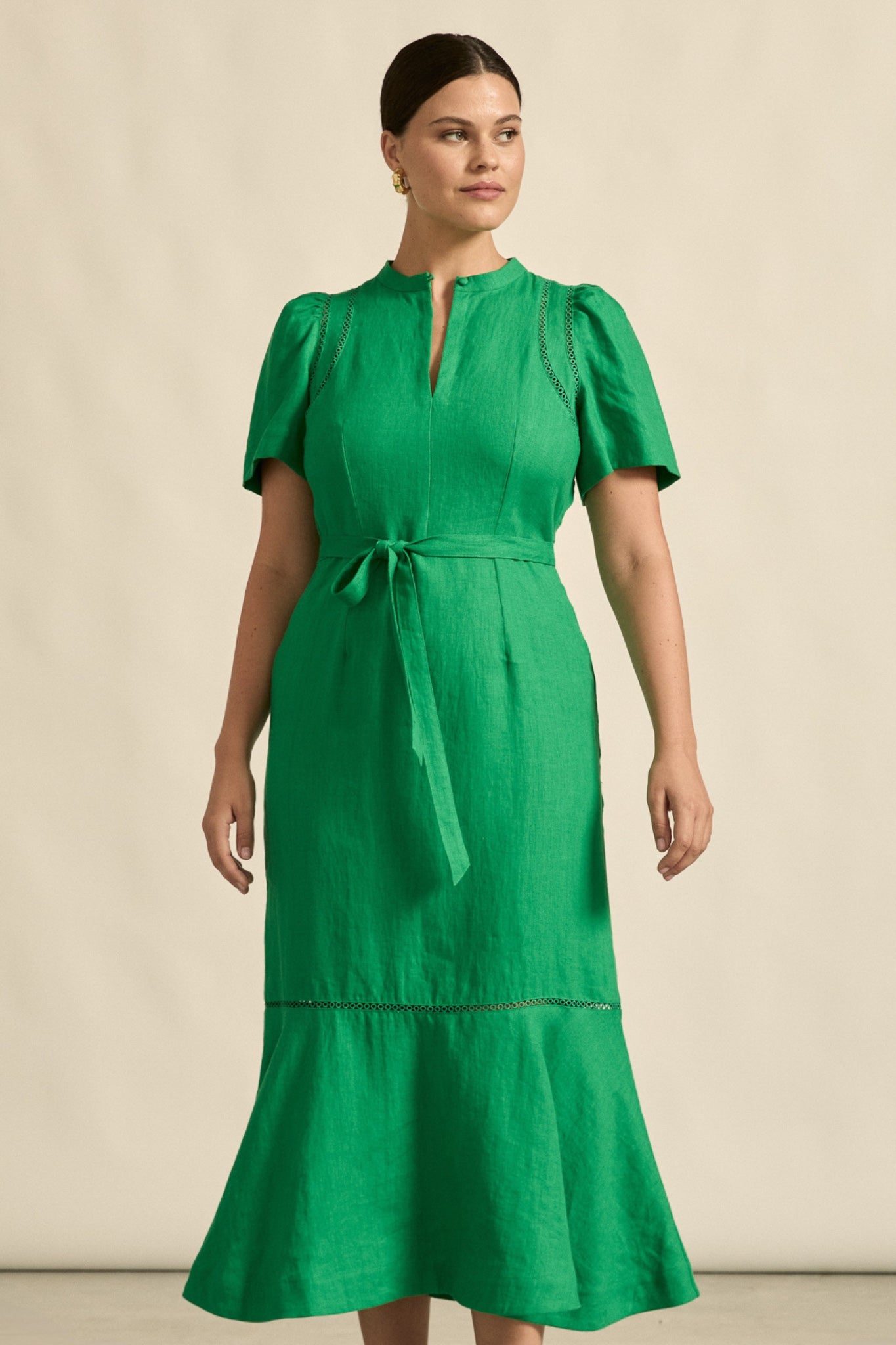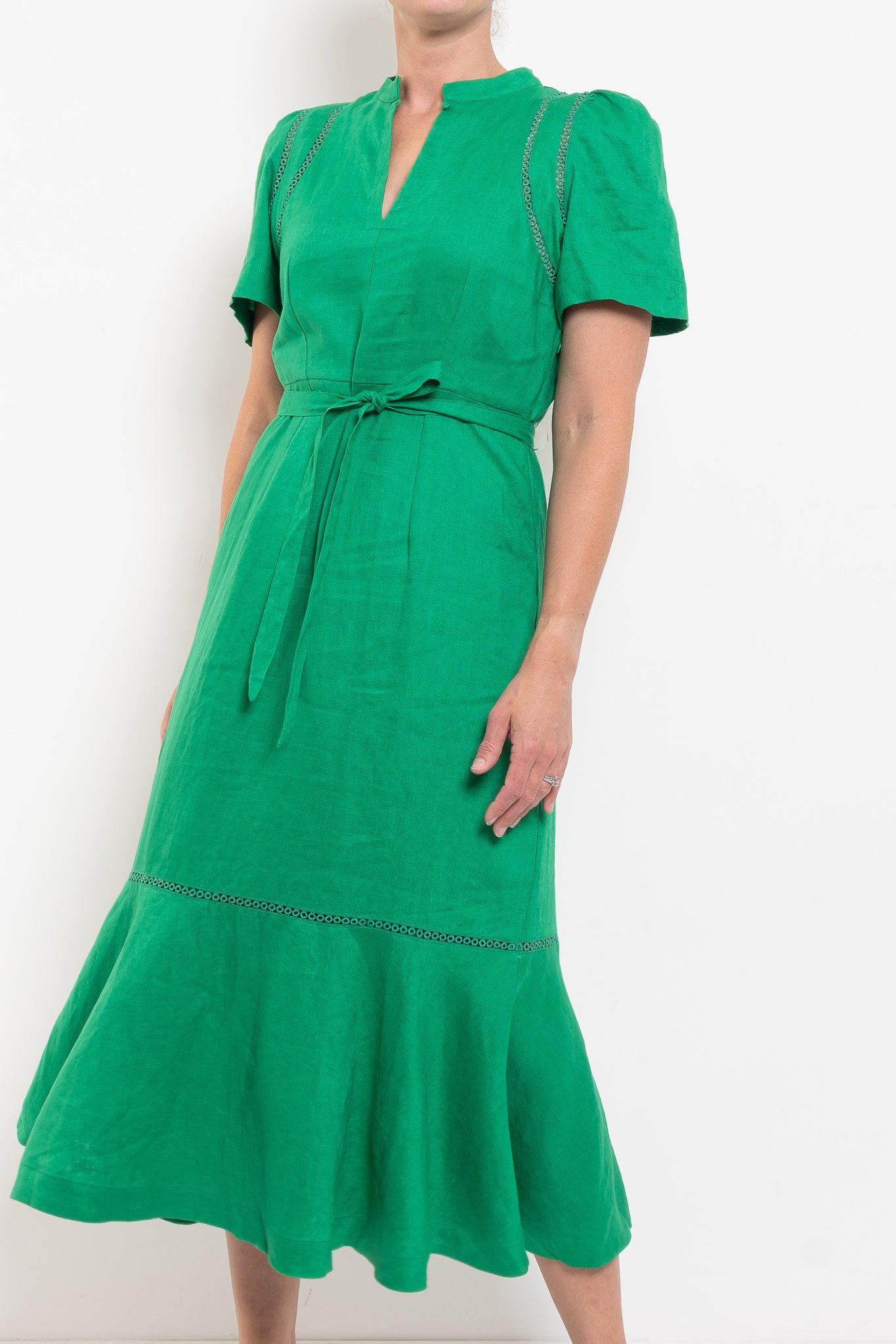 Cut from 100% linen in a vibrant parrot green hue, the Cable Dress is both striking and sophisticated. A midi-length A-line silhouette offers refined movement, while gathered tulip sleeves bring soft volume. Circular lace inserts at the knee and shoulder add unique detailing, balanced by a split neckline with a covered dome button. A self-tie belt defines the waist, and discreet side pockets keep it practical. Finished with an invisible side zip, this dress blends modern tailoring with romantic flourishes – perfect for occasions where you want to stand out.