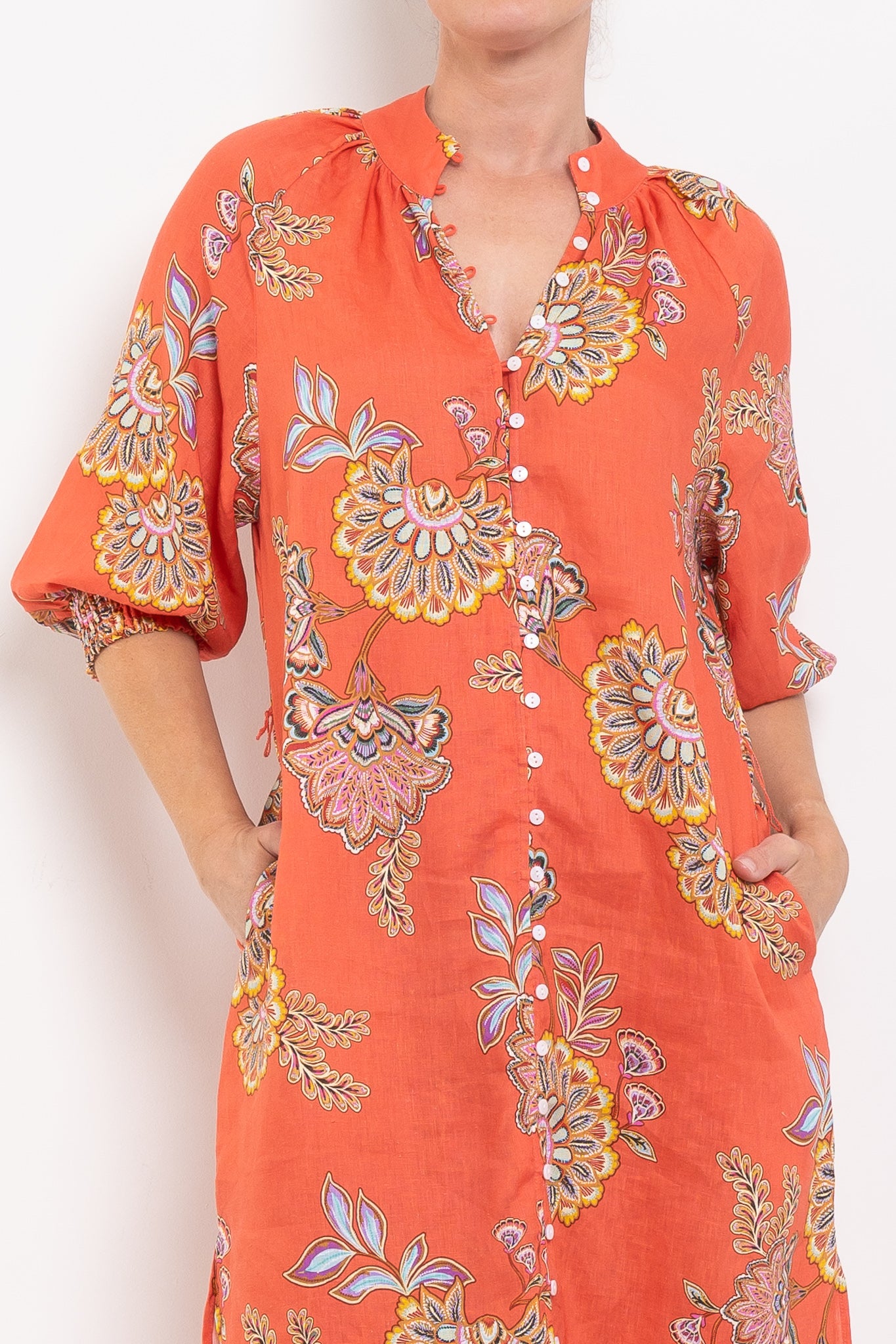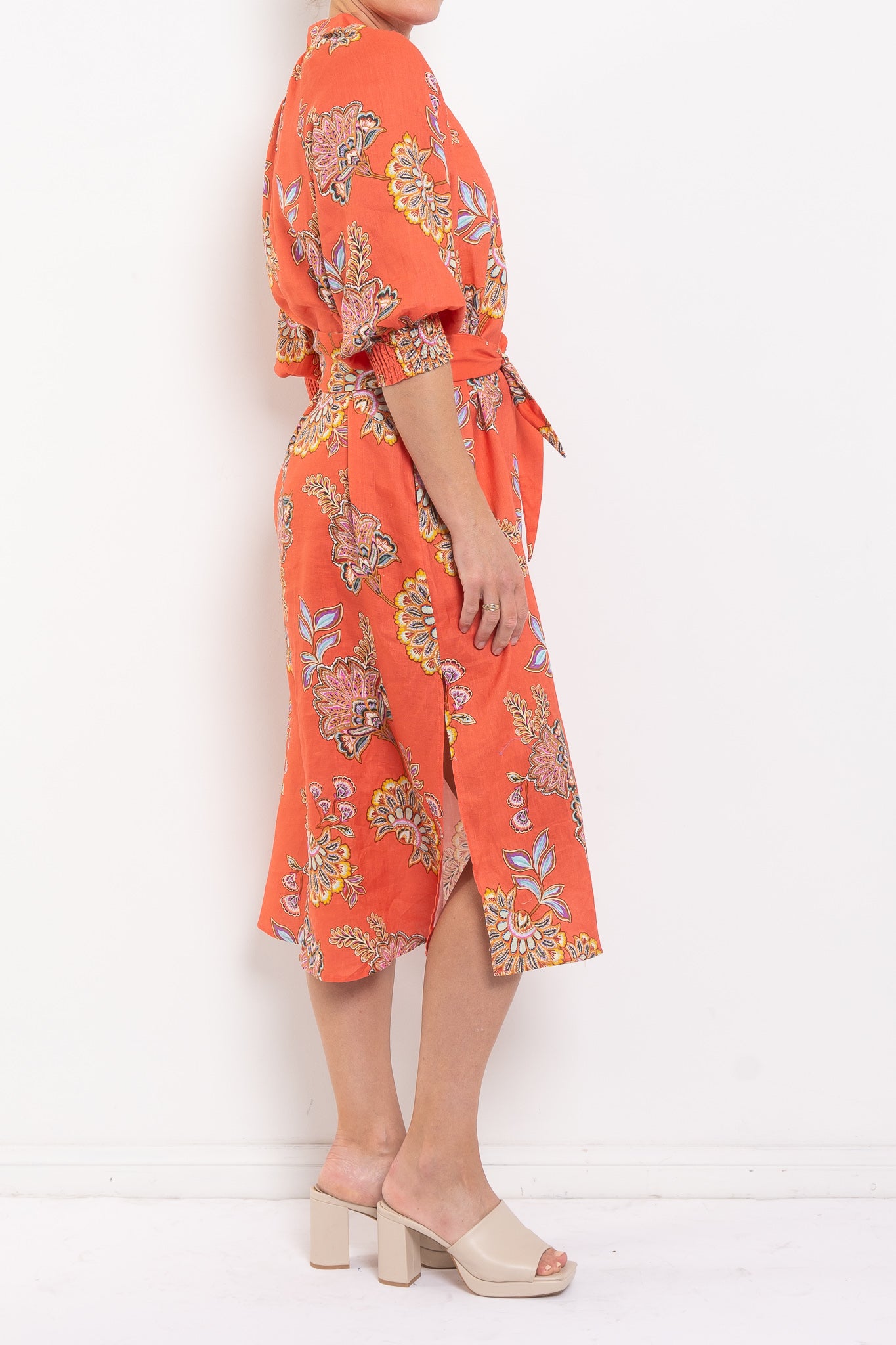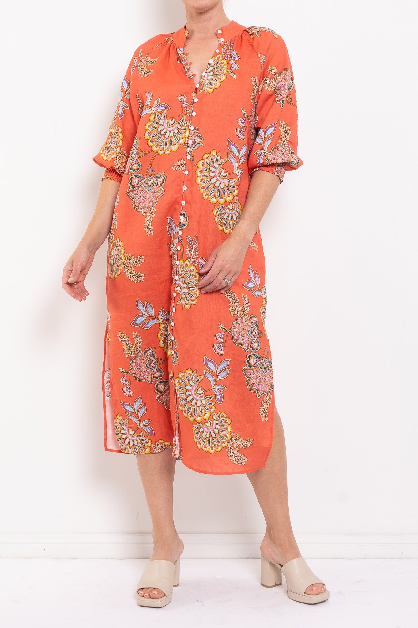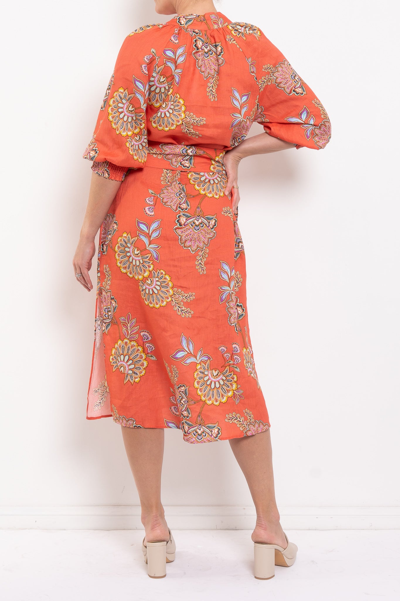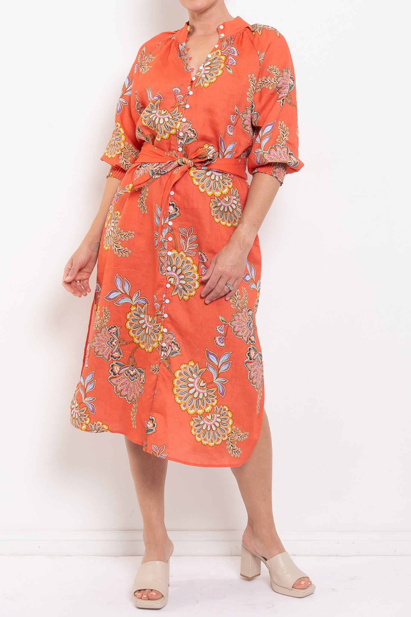 Cut from 100% linen in the exclusive K’gari Melon print, the Flourish Dress brings ease and versatility to your wardrobe. A rounded high stand collar with delicate shell buttons lends a polished touch, while the relaxed silhouette moves with you. The wide self-tie belt allows you to play with shape – cinched at the waist for definition or worn loose for laid-back chic. With blouson sleeves and a side split for comfort, this piece flows seamlessly from resort wear to city outings.