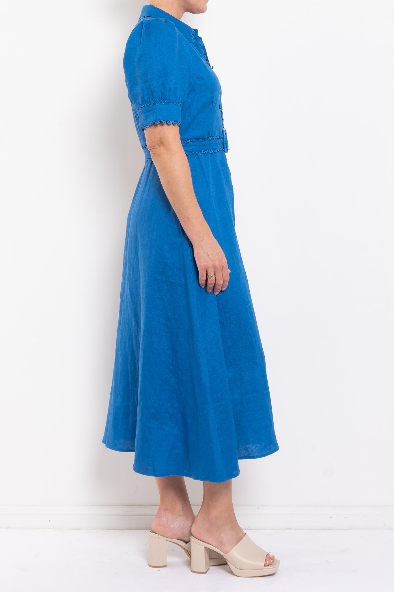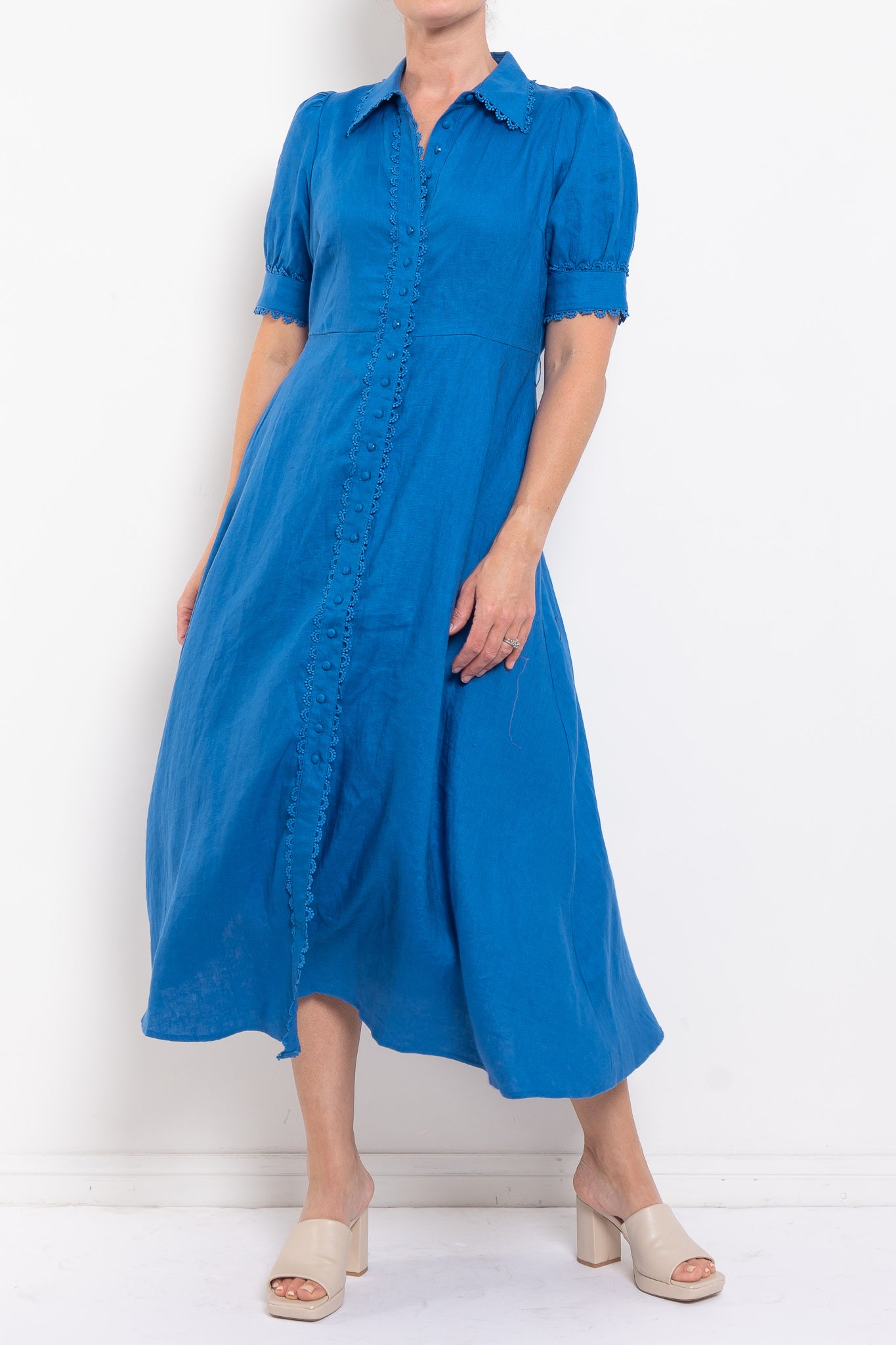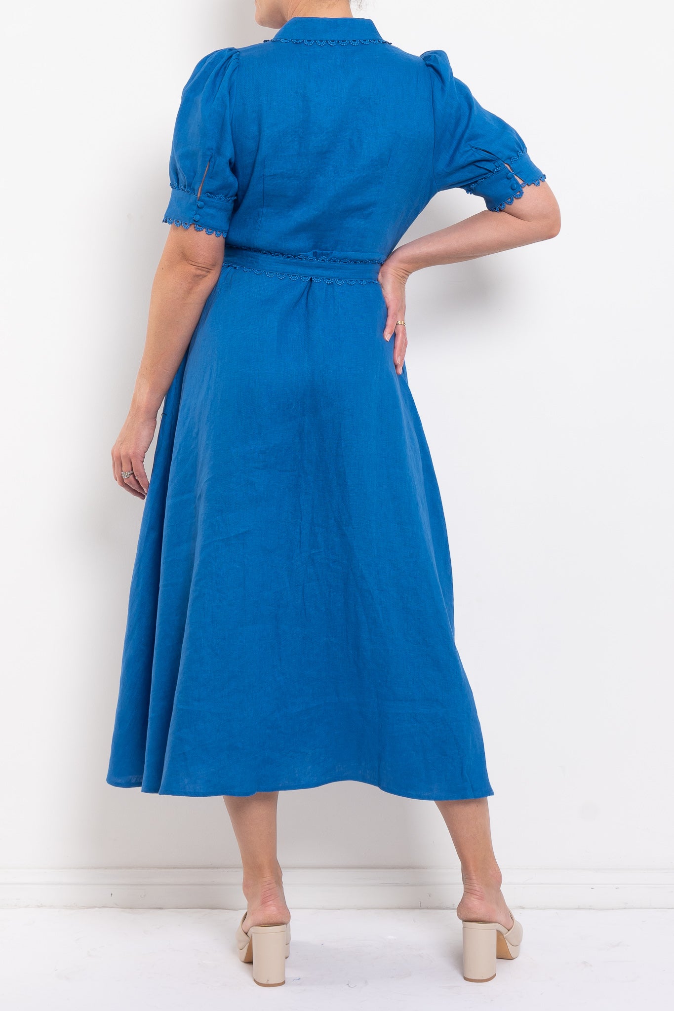 Crafted from 100% linen in the fresh Shoreline hue, the Yearn Dress blends timeless femininity with everyday wearability. Its fit-and-flare shape flatters, while the self-fabric belt lets you adjust the silhouette to suit your mood. Scallop lace trims at the collar, placket, and cuffs add artisanal detail, complemented by puff sleeves with lace-edged cuffs. Covered buttons complete the look with a soft finish, making this the perfect piece for elegant events or elevated daytime style.