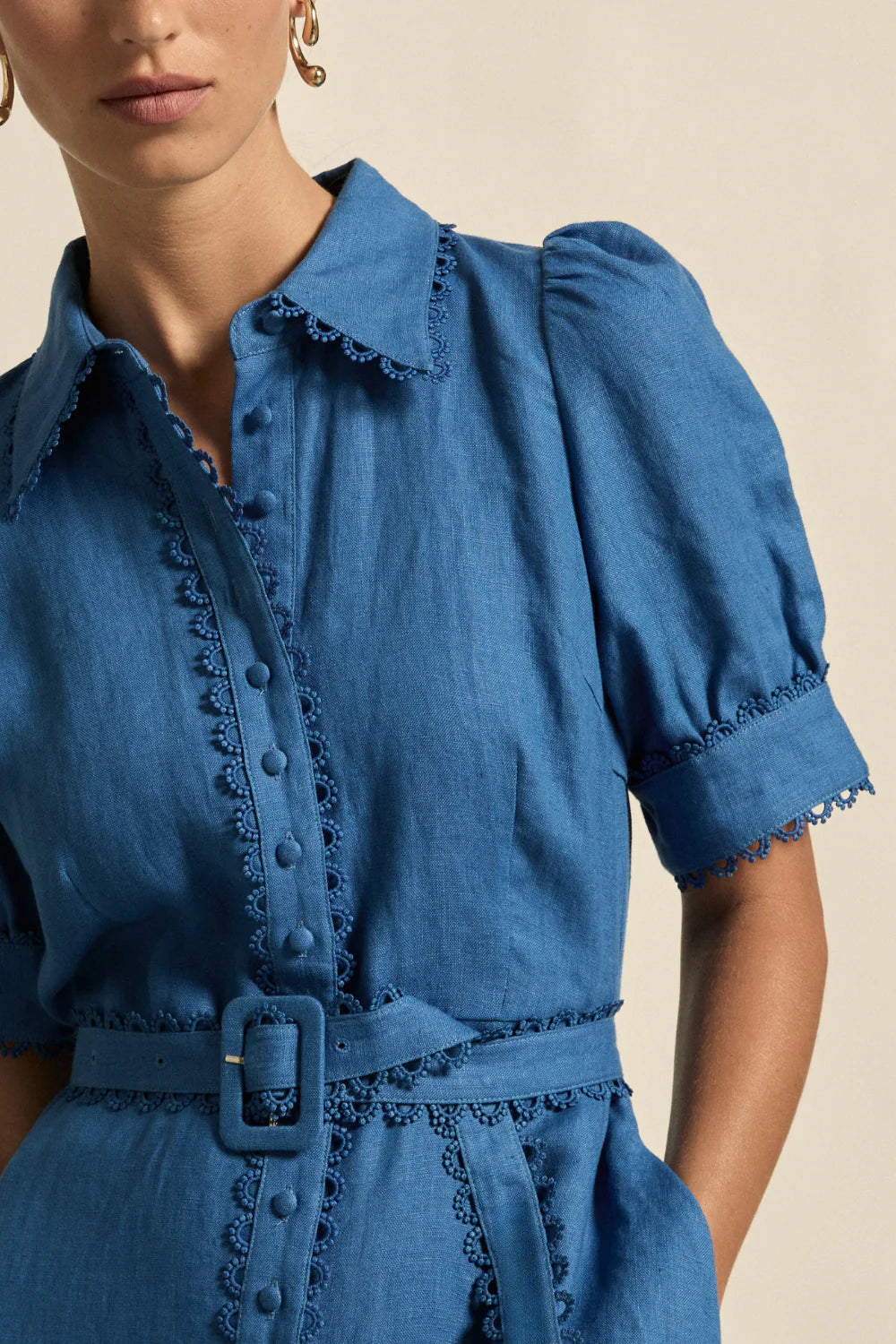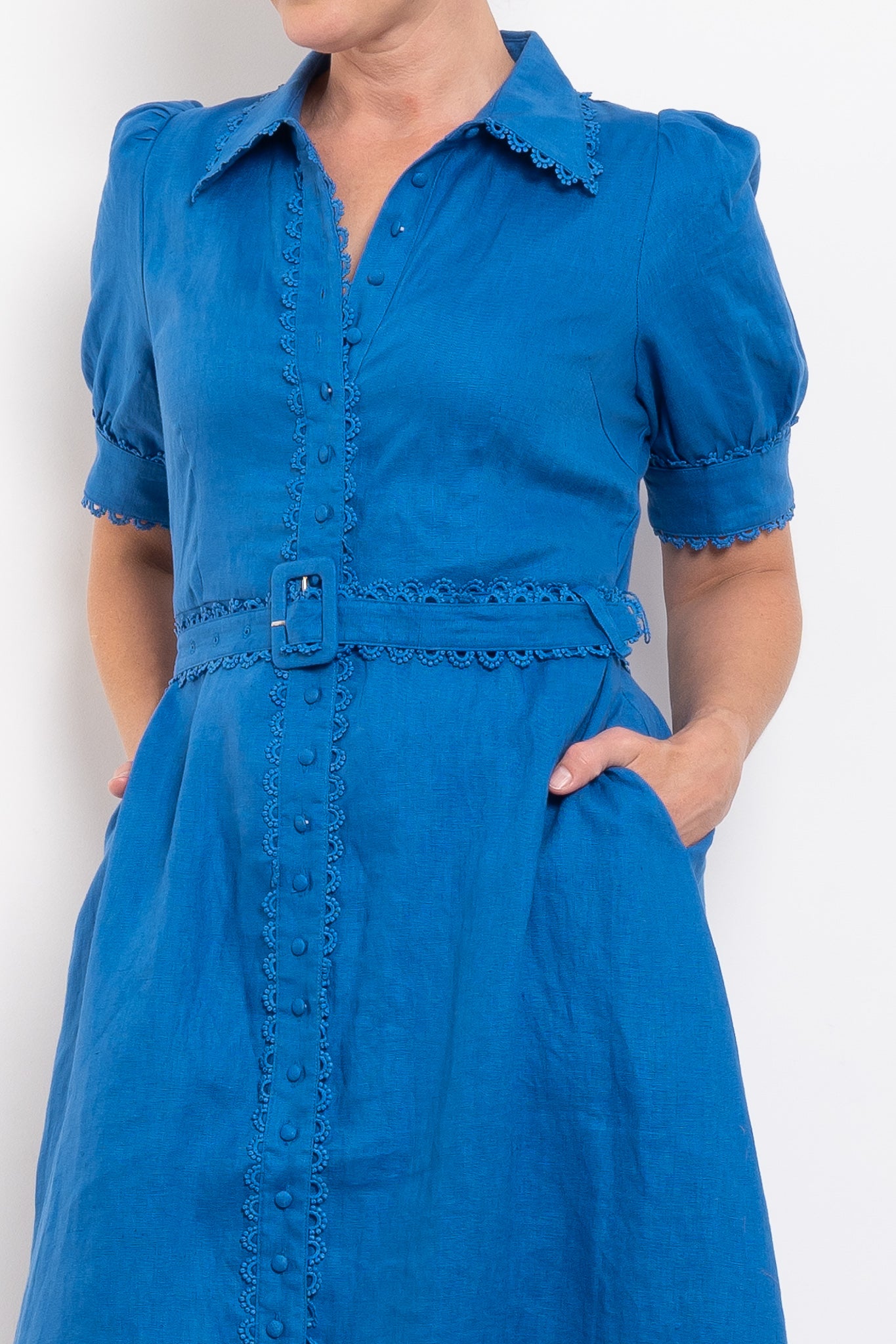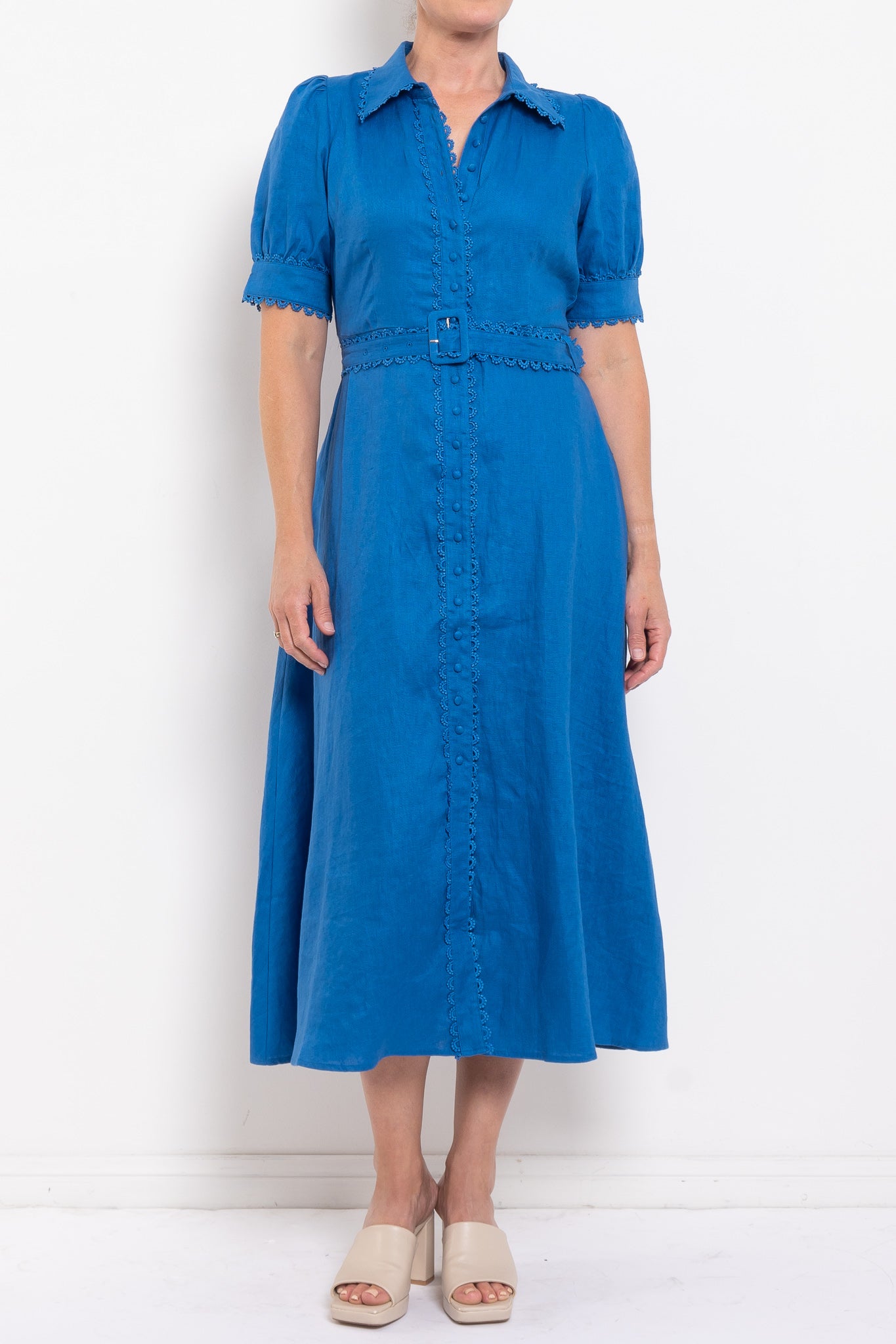 Crafted from 100% linen in the fresh Shoreline hue, the Yearn Dress blends timeless femininity with everyday wearability. Its fit-and-flare shape flatters, while the self-fabric belt lets you adjust the silhouette to suit your mood. Scallop lace trims at the collar, placket, and cuffs add artisanal detail, complemented by puff sleeves with lace-edged cuffs. Covered buttons complete the look with a soft finish, making this the perfect piece for elegant events or elevated daytime style.