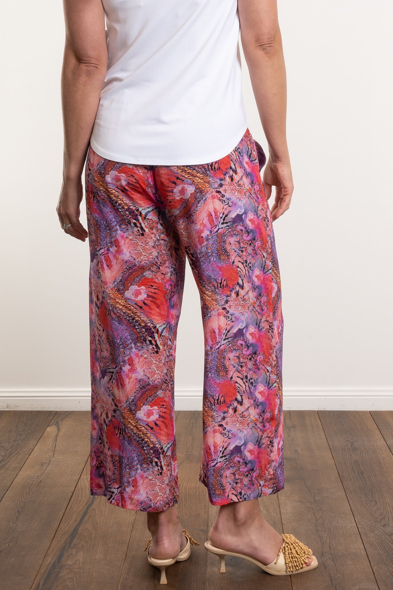 Cut from Mela Purdie’s soft-washed Silk Crepe de Chine, the Pace Pant showcases the striking Kaleidoscope print — a swirl of pinks, purples and coral tones that feel instantly uplifting. The elasticated waistband ensures everyday comfort, while the slightly cropped, wide-leg silhouette offers graceful movement and polish. Style with the matching Scoop Shell for a coordinated set that transitions seamlessly from day to dinner, or pair with a simple white shirt for laid-back sophistication.
