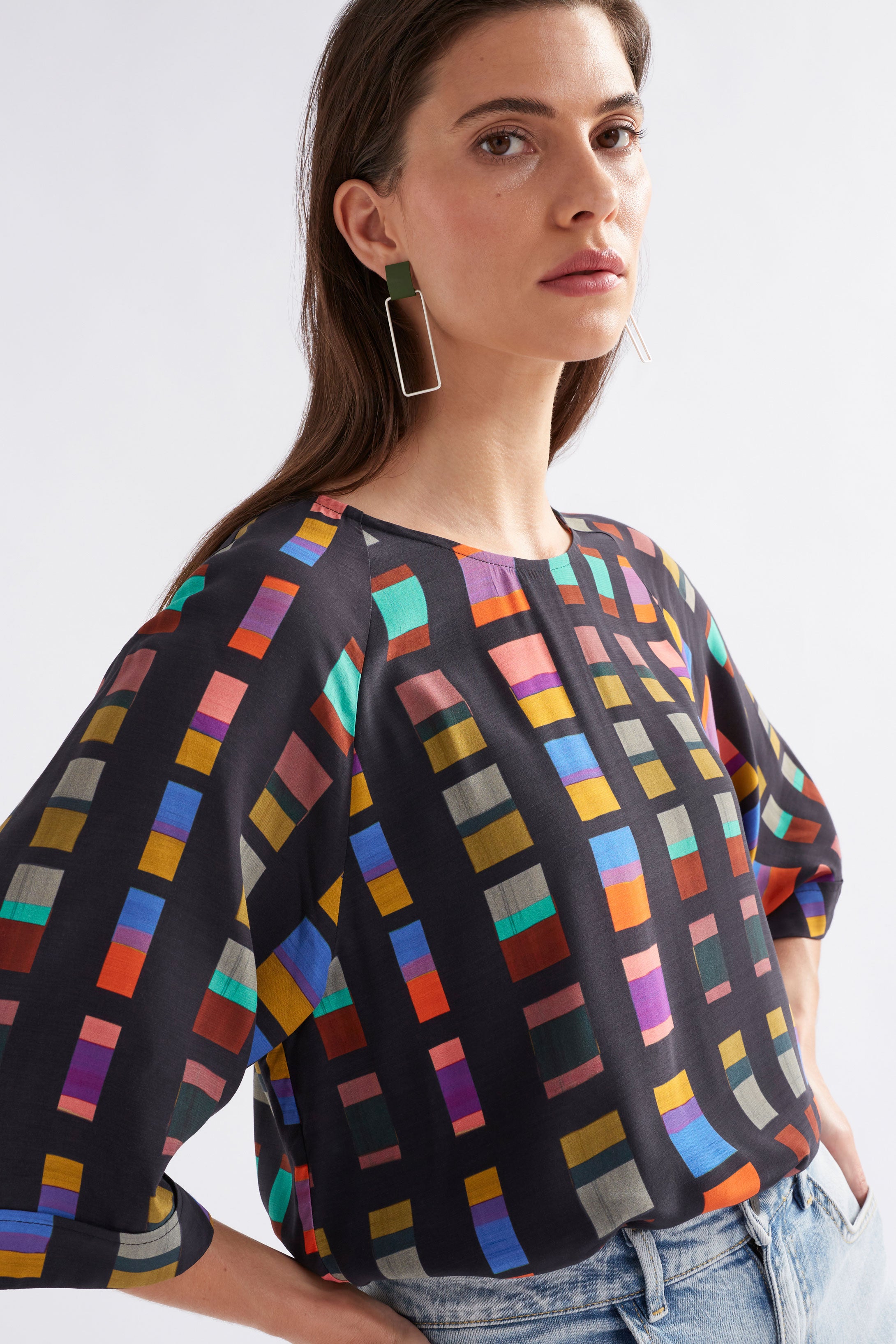 Reimagining the classic raglan design with a fresh, modern feel, the Malo Top quickly became an ELK classic. Featuring a crew neck and raglan sleeves that hit just above the elbow with a faux cuff, offering a comfortable and elevated fit. A seam at the back with pleating adds subtle volume, while the side splits at the hem create movement. Crafted from a smooth blend of ECOVERO™ Viscose and Viscose Rayon, this top drapes beautifully, softly contouring to your body for effortless wear. Now offered in the contemporary Tessela Print.