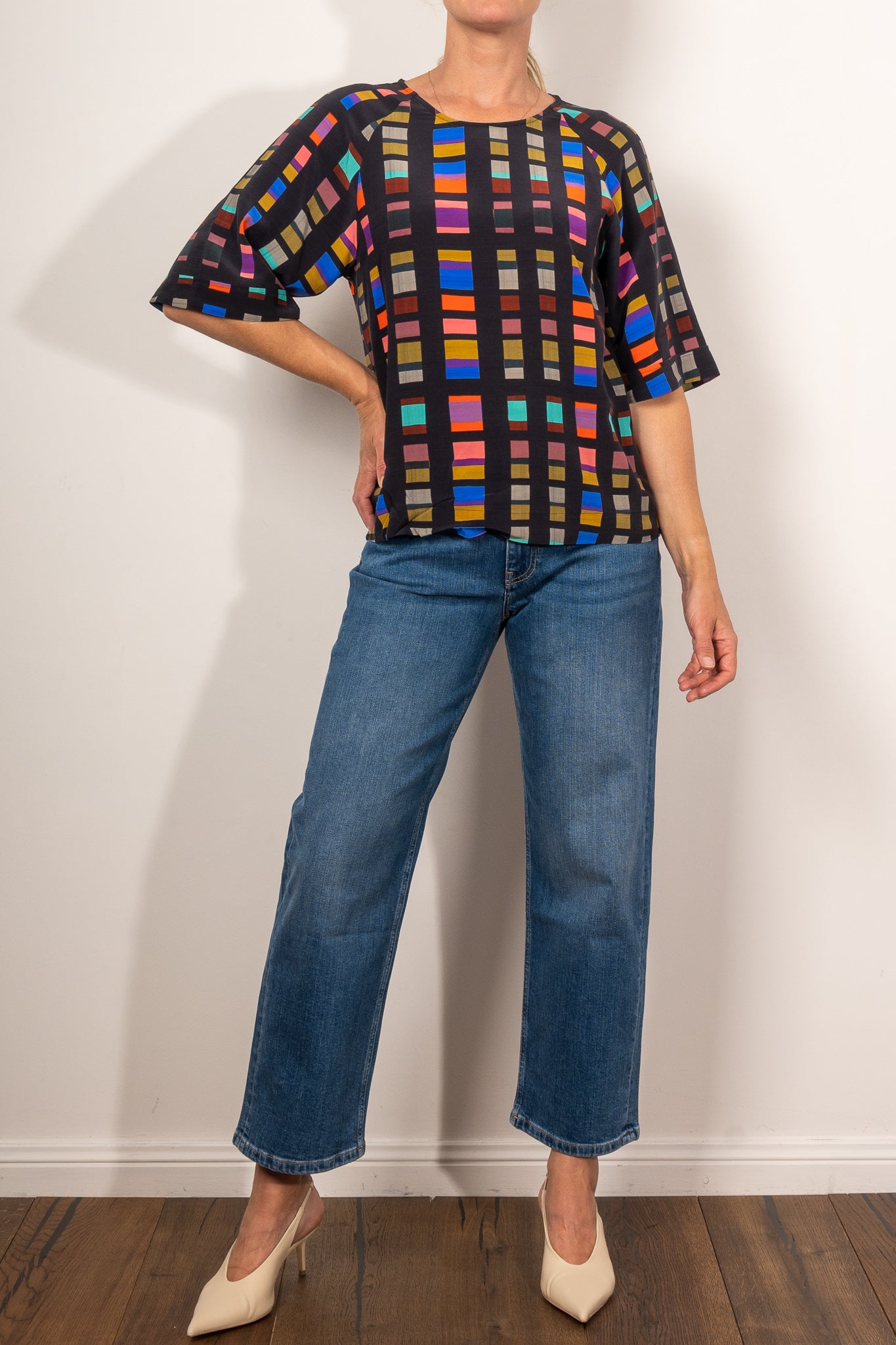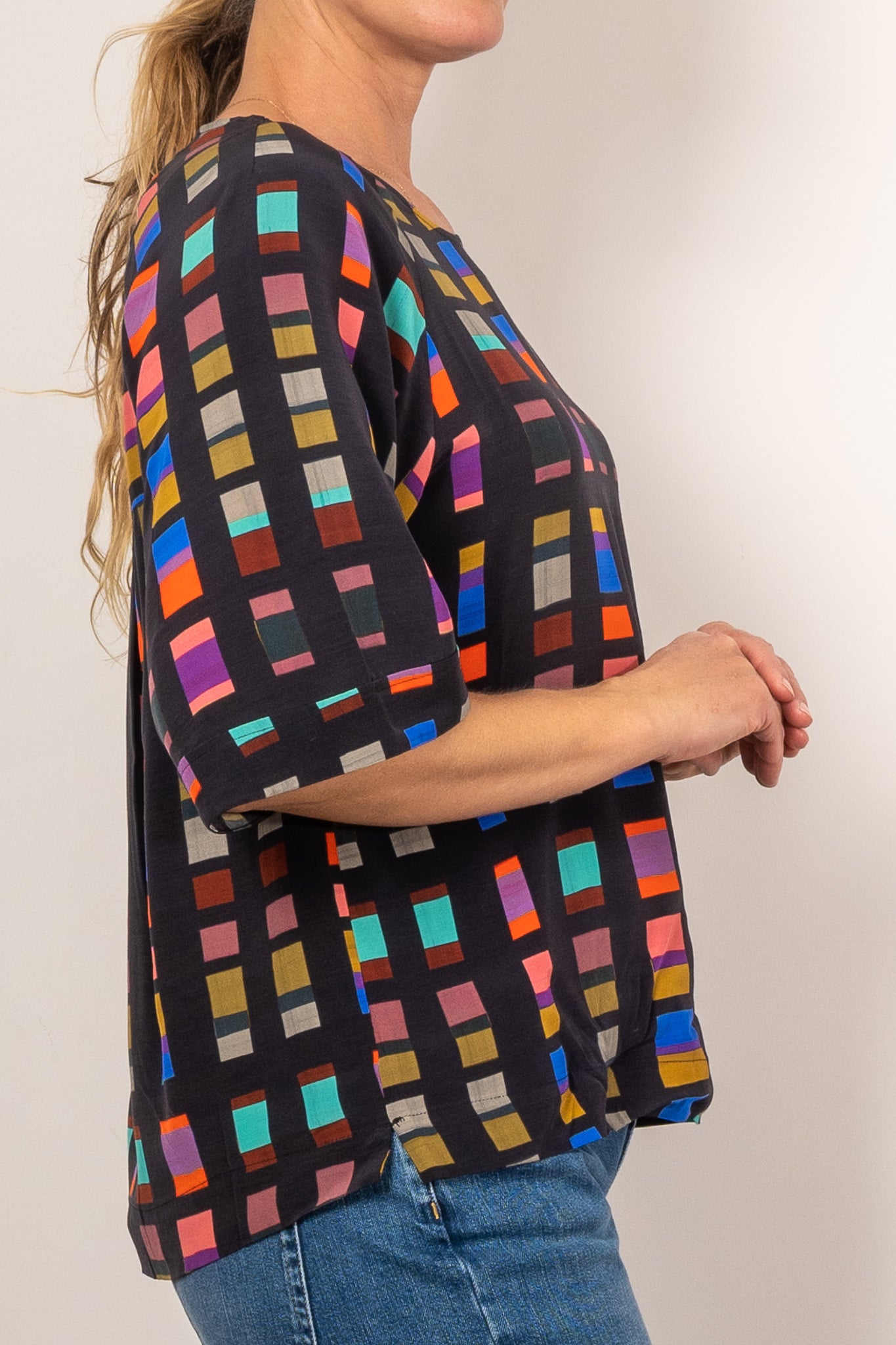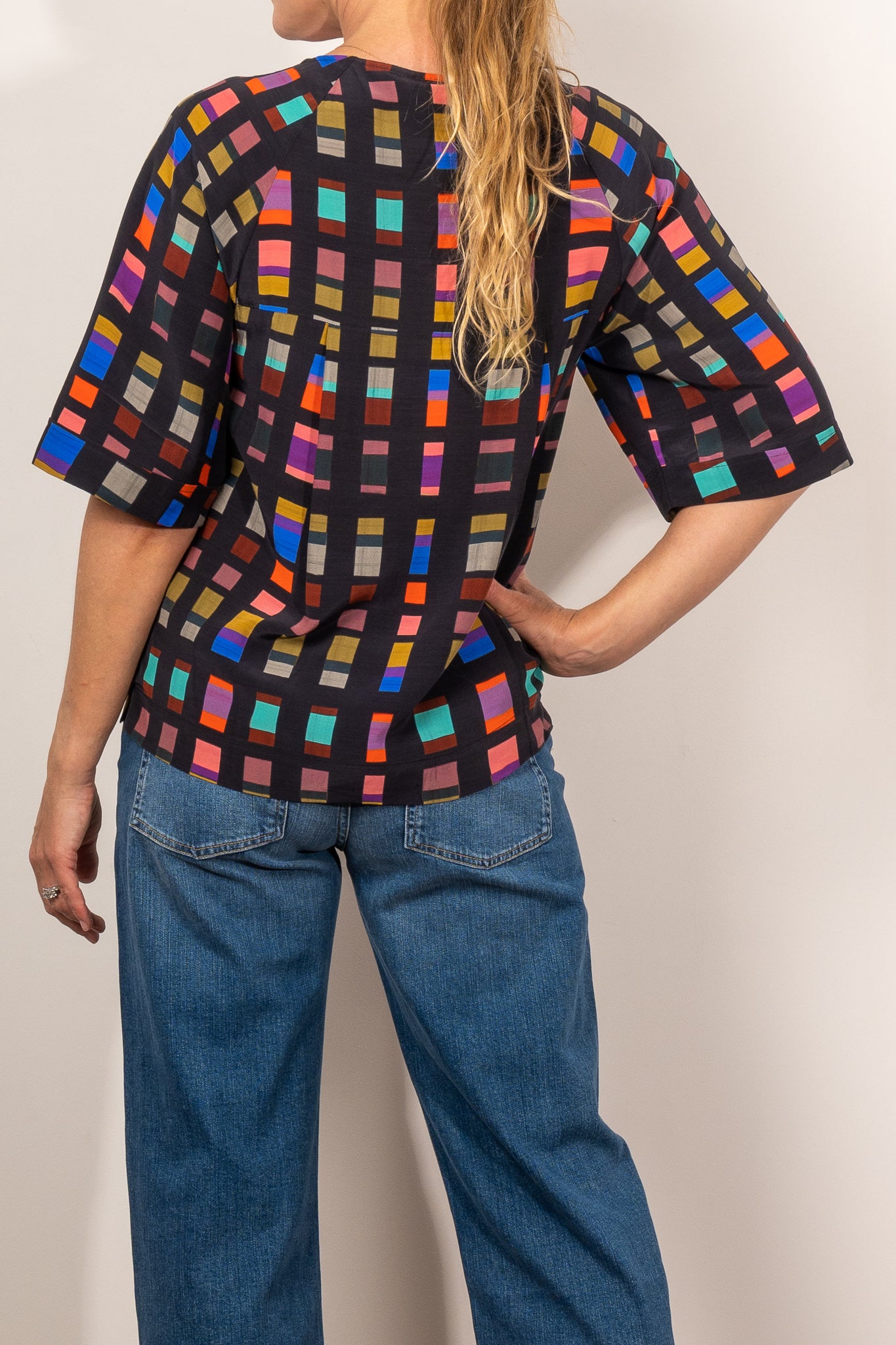 The Malo Top is a regular fit throughout the bust, flowing into a relaxed hem opening. The sleeves fall to elbow length.