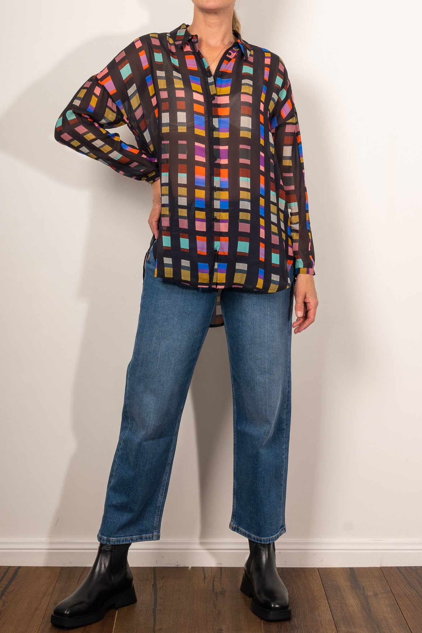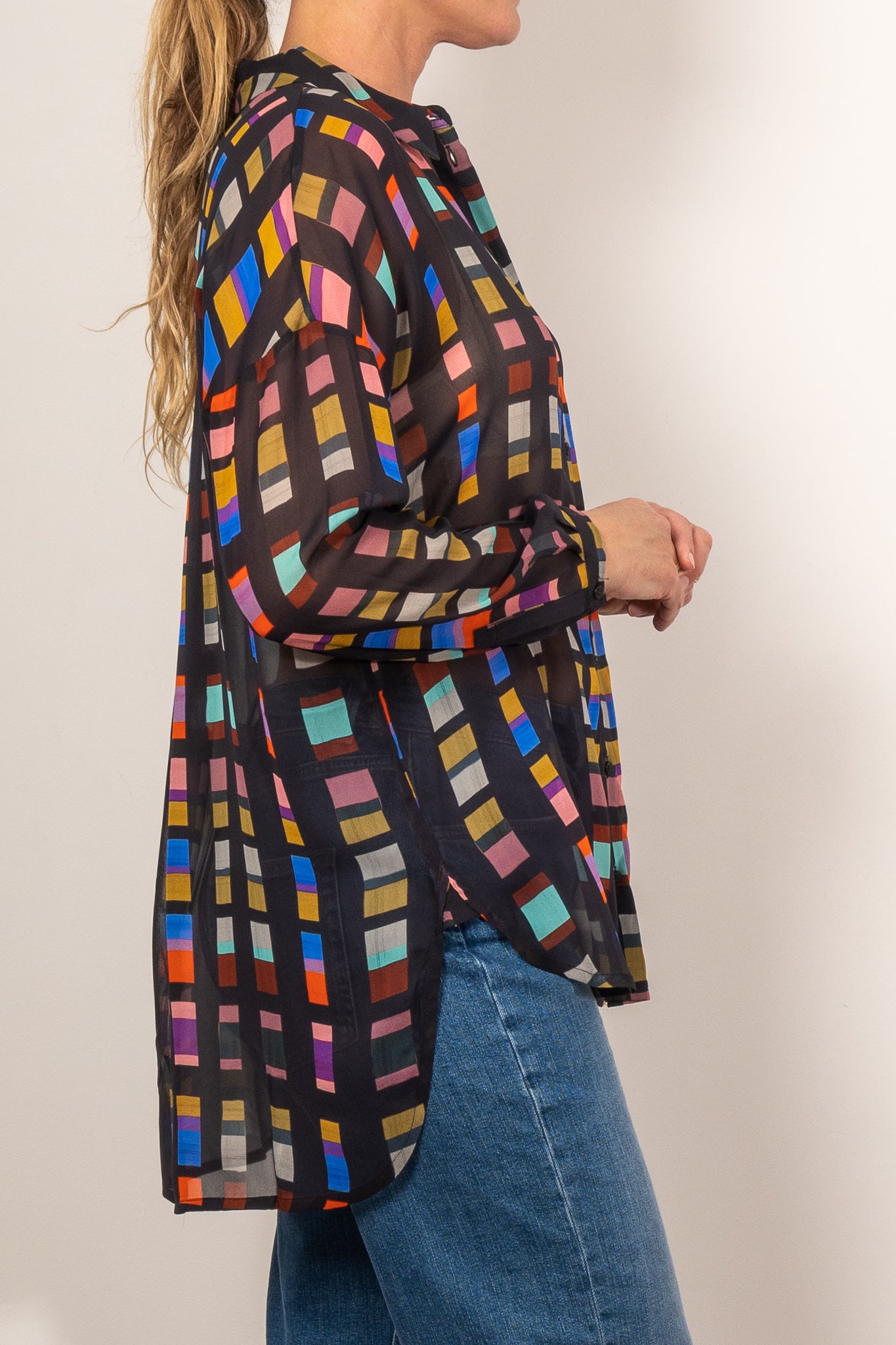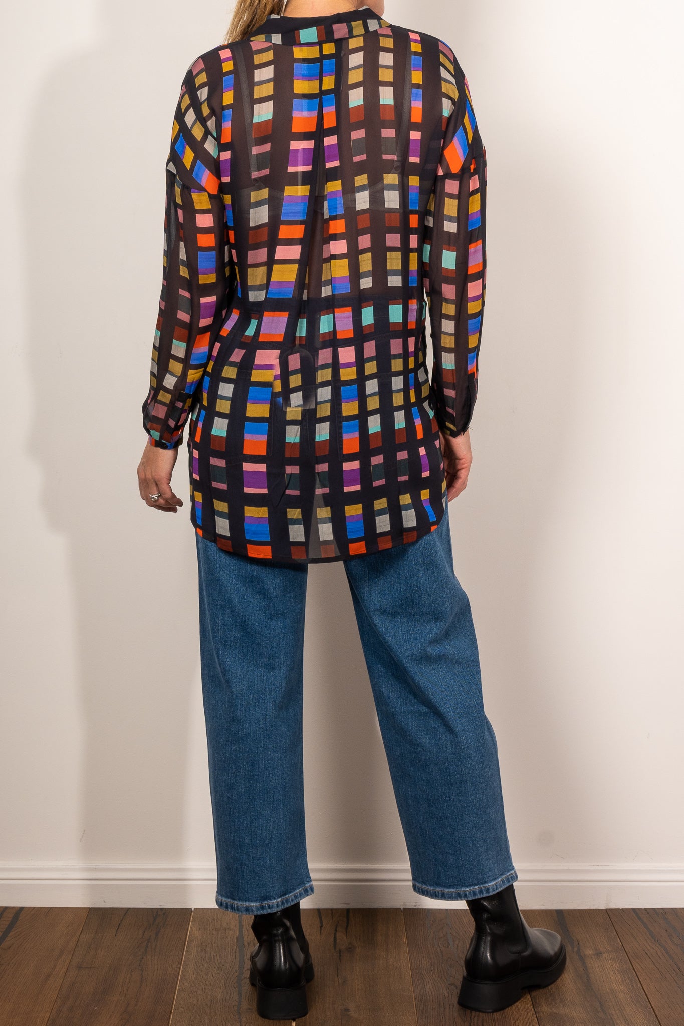 A range of bright hues combined with a bold geometric print define this blouse, which is crafted from lightweight, responsibly-sourced viscose. An ELK classic, The Eir Sheer Shirt is a relaxed long-sleeved sheer shirt featuring a defined collar, dropped shoulder, and back tuck detailed. Finished with a high-low hem that tucks seamlessly into high waisted separates. The colours of the bold Tessella print are designed to pair back with styles across the range for easy outfit building.