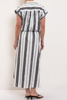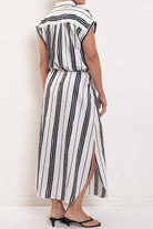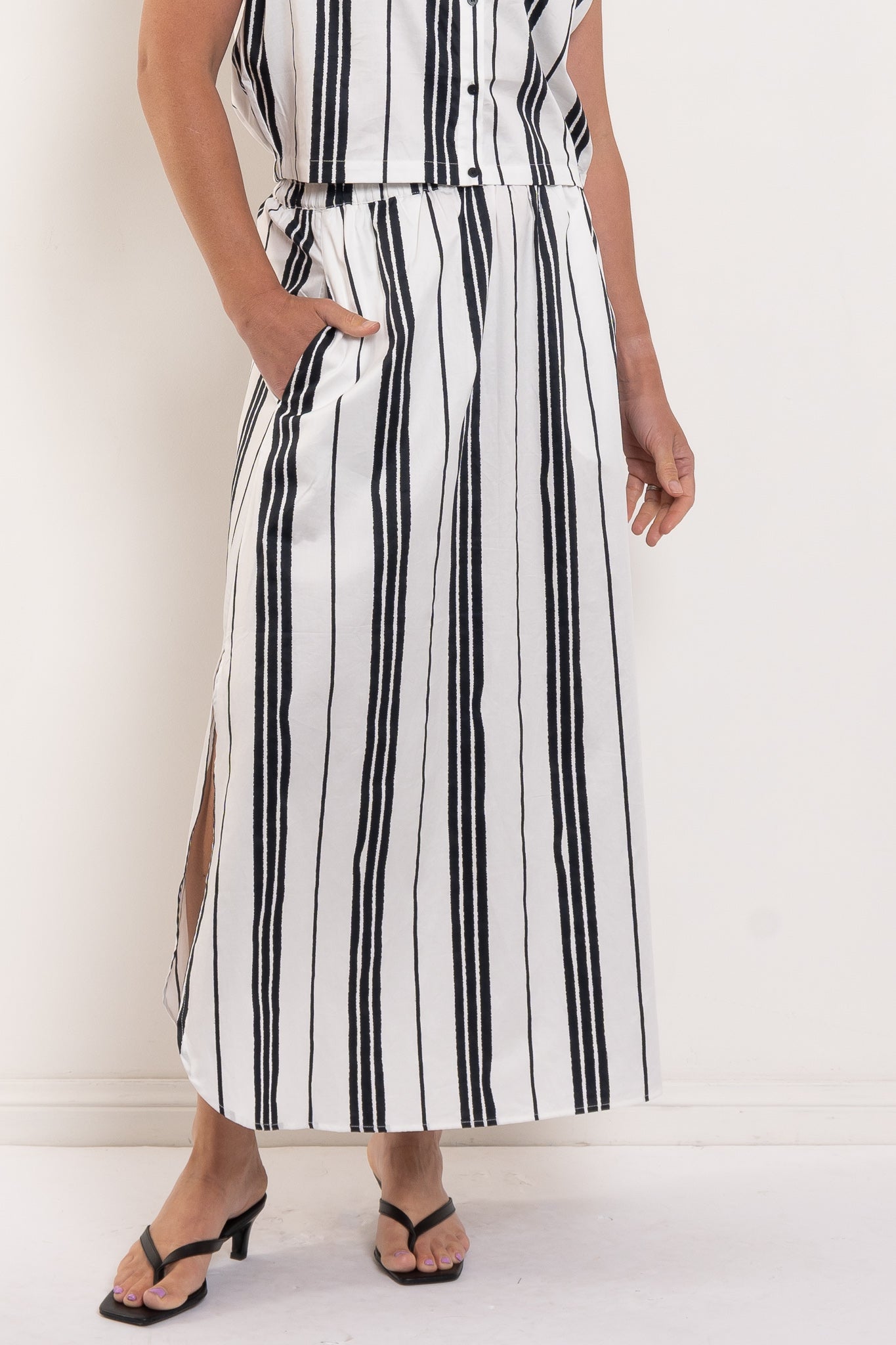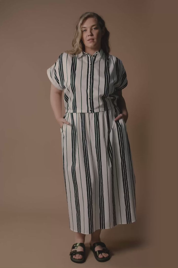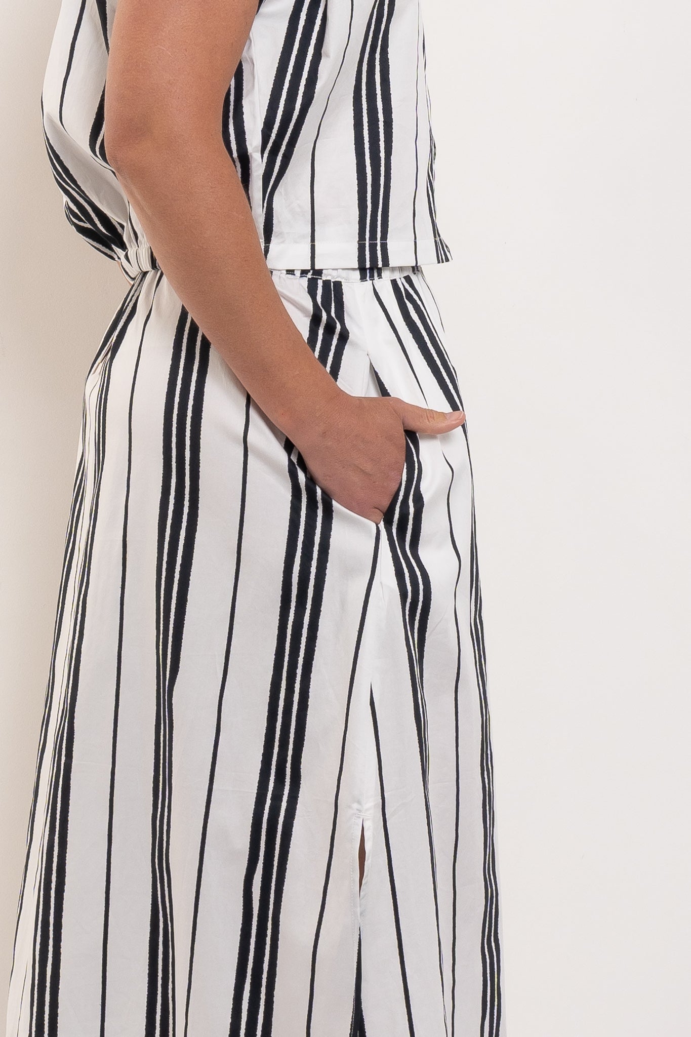 The Fez Skirt is an easy, striking design with thoughtful detail. This high waisted A-line midi skirt has a pull-on elasticated waist and is crafted from smooth crisp 100% organic cotton. Featuring a regular fit at the waist, flowing into an A-line shape with a rounded hem and side splits for ease. Style with the coordinating Reza Shirt for a full printed look.