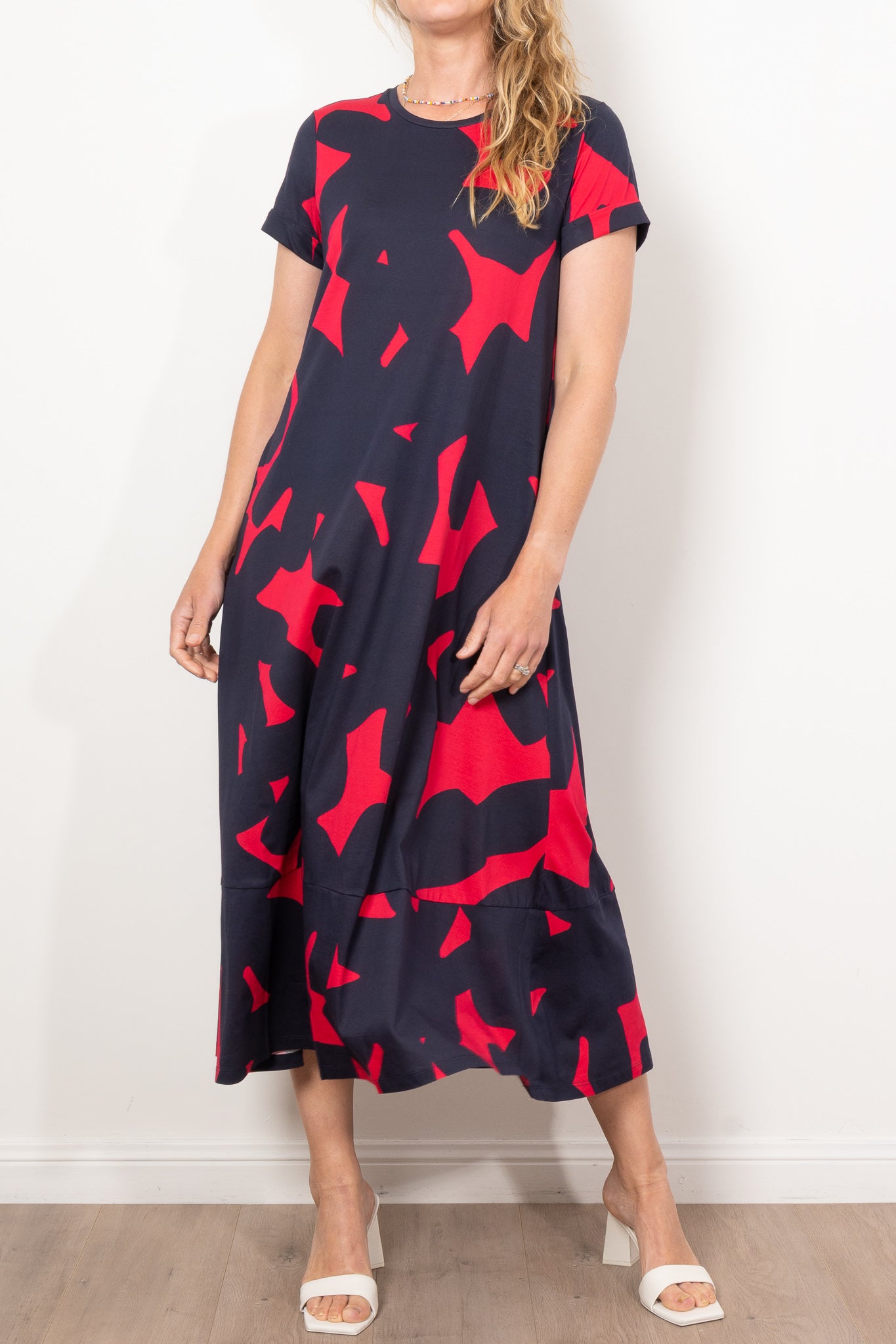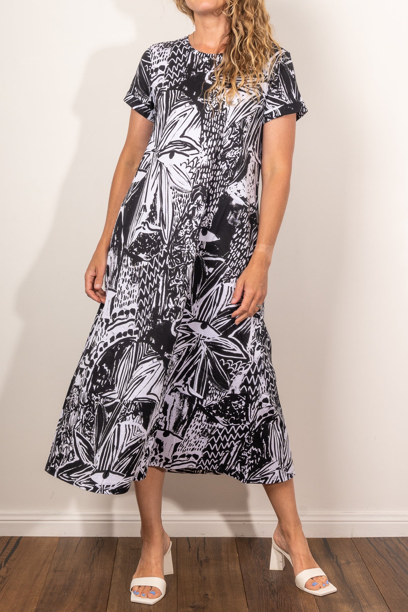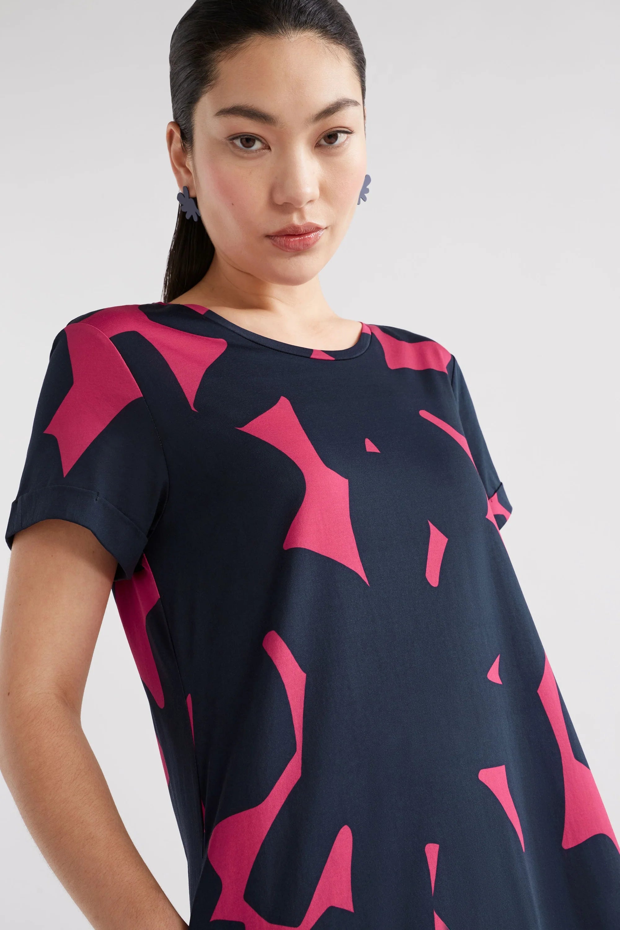 The ELK Haki Dress combines the ease and comfort of a t-shirt with the bold style of a seasonal print. Crafted from buttery organic cotton, this A-line dress features a swing shape, fixed rolled cuffs, and an inverted box pleat at the back for added flair. Perfect for all-day wear and versatile enough to pair with denim jackets or summer tailoring. Each dress features a unique print placement, making it a one-of-a-kind statement piece.