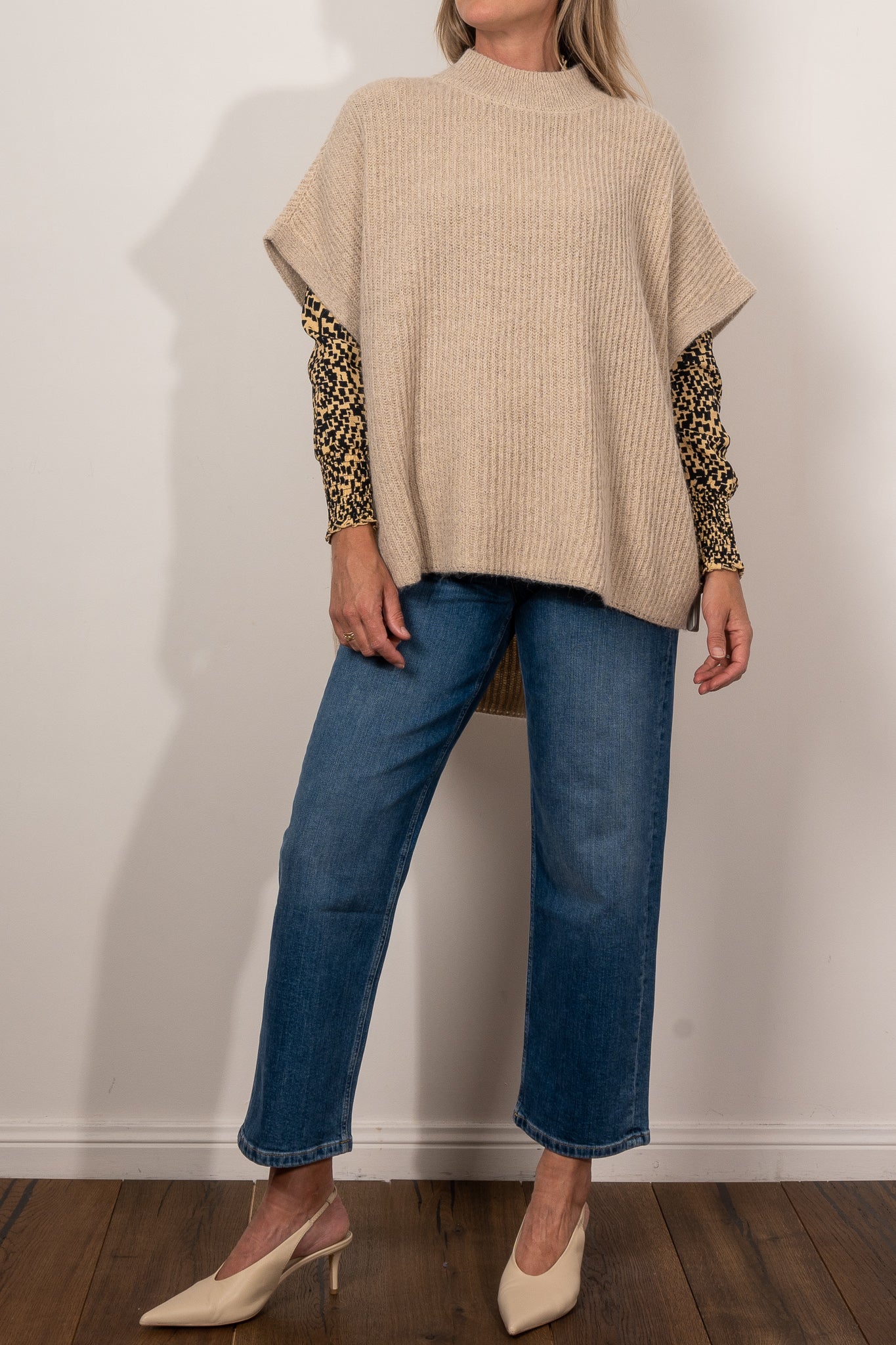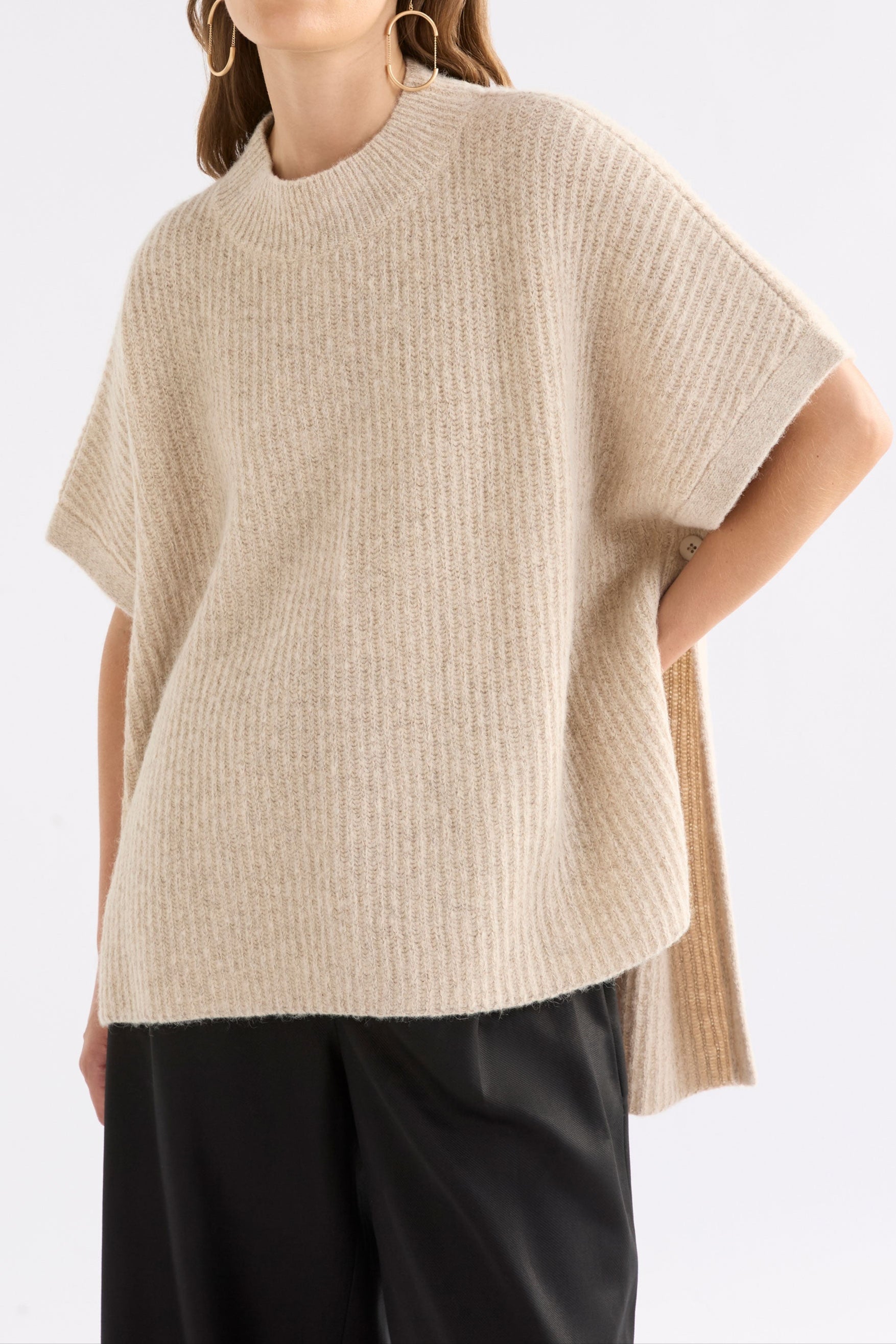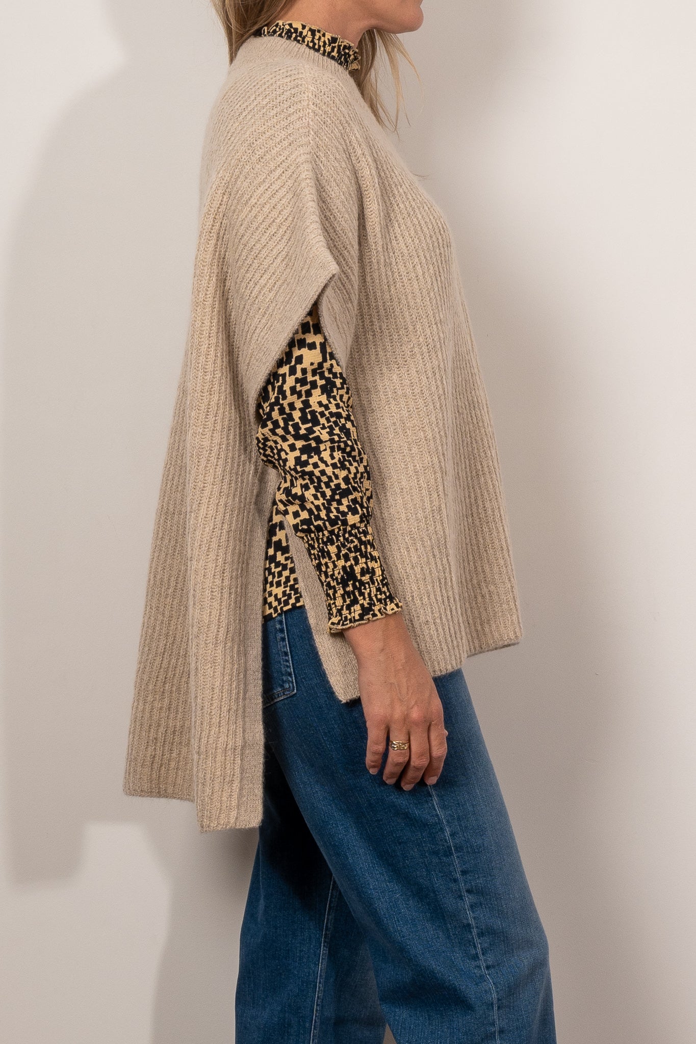 The classic poncho is reimagined in a luxurious alpaca and merino wool blend with touch of subtle shimmer from the lurex thread along with recycled nylon for added durability. The ribbed knit design with funnel neck, adds texture and warmth. Functional side buttons define the armholes, allowing for an adjustable fit. A cosy essential designed for effortless winter styling. Offered in a rich Latte hue with subtle lurex shimmer.