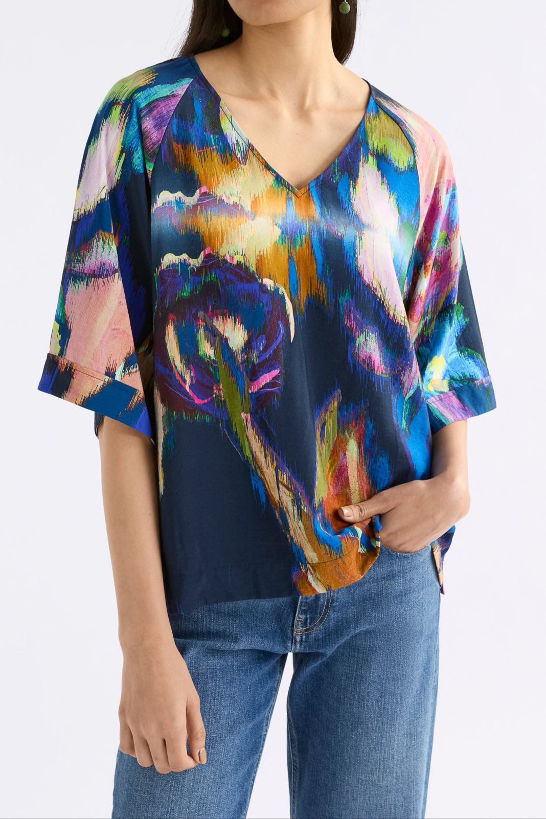 A bold brushstroke of colour for your everyday wardrobe, the Moda V Neck Top in Elk’s exclusive Vaara Print is a wearable work of art. Cut from a silky-feel fabric with a beautiful drape, this relaxed-fit style features a flattering V neckline, soft raglan sleeves, and a curved hemline that falls with ease.