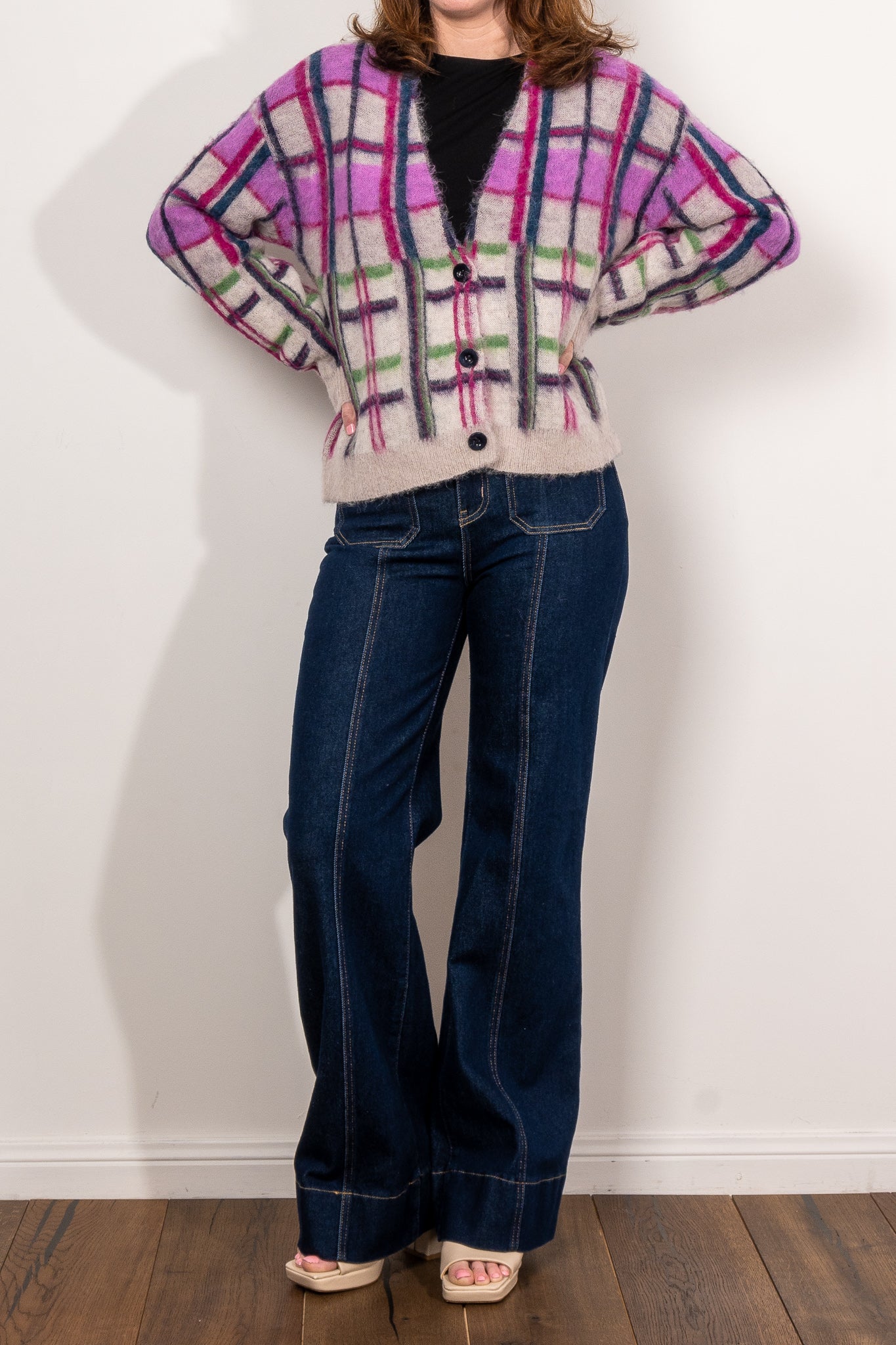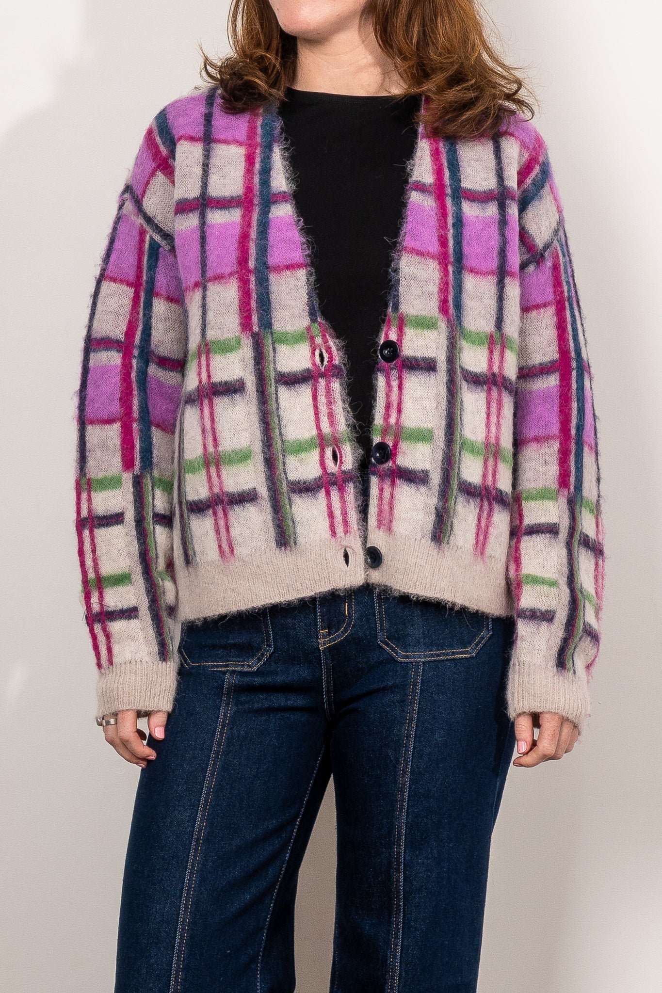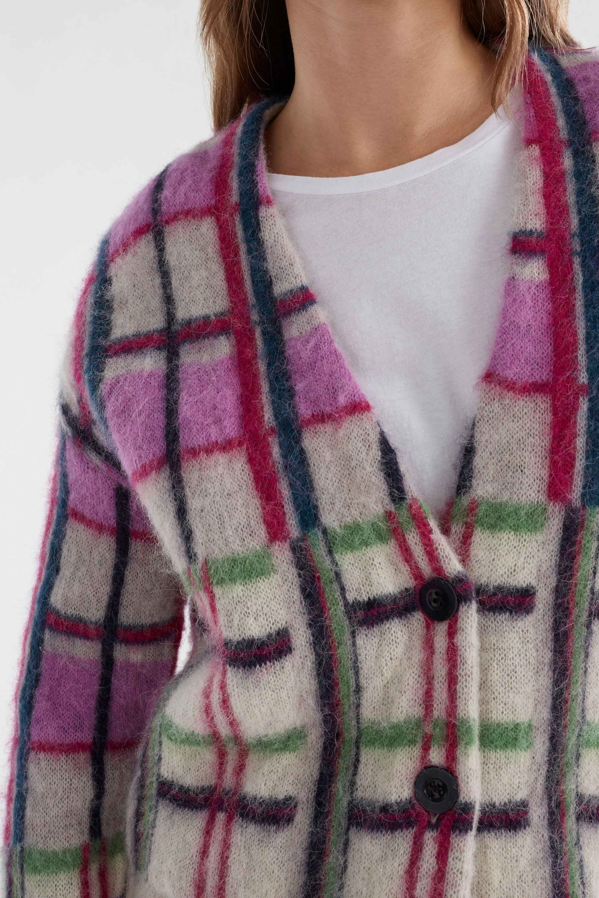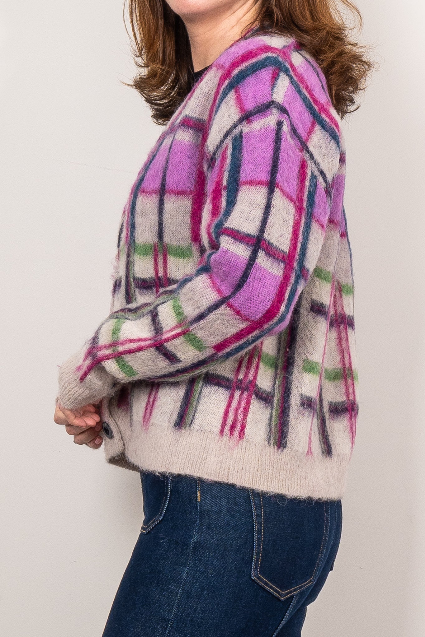Spice up your wardrobe essentials with this daring cardigan, adding a pop of excitement with its eye-catching plaid design. Featuring shades of pink, green, and blue, it effortlessly complements any seasonal outfit. Made from alpaca, merino wool, and recycled nylon, it delivers warmth, breathability, and long-lasting wearability.