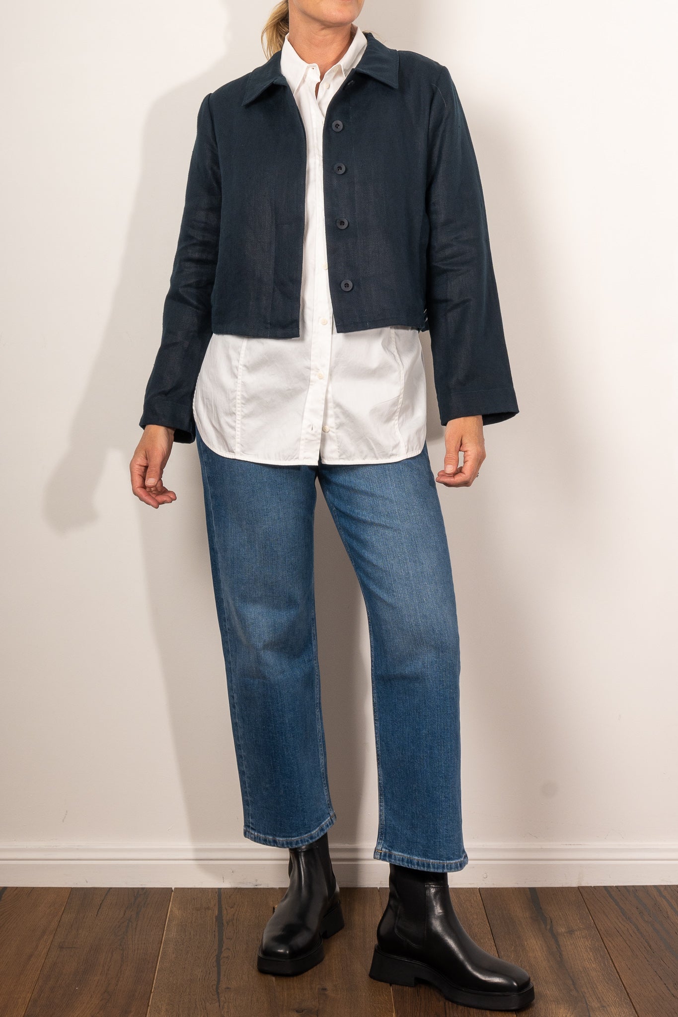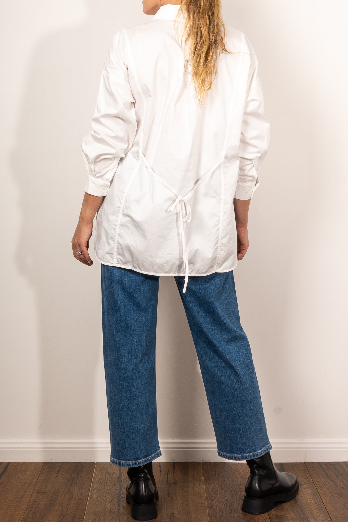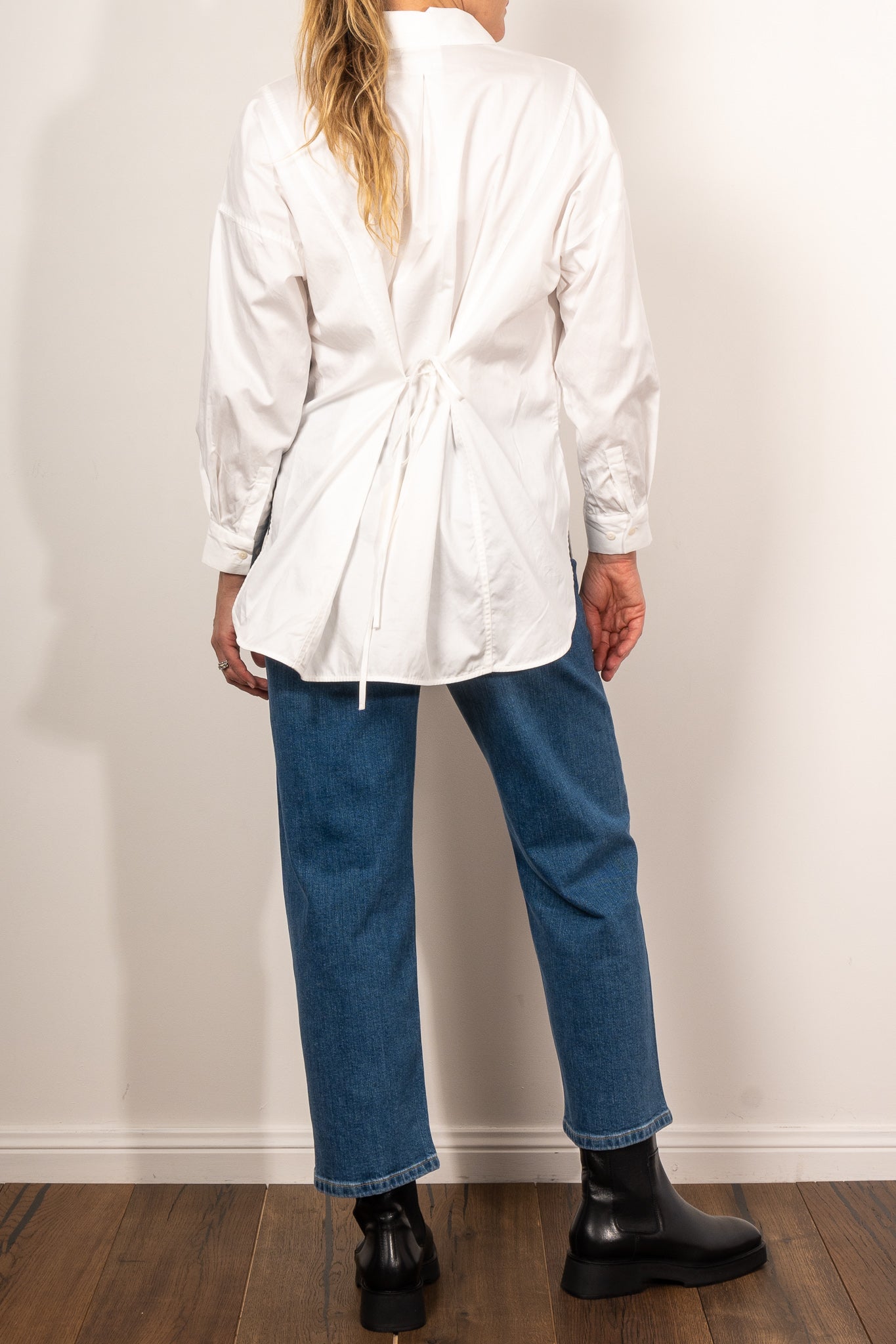A foolproof wardrobe staple with a contemporary cinch back- the 100% organic cotton Tiga Shirt. Featuring a classic shirt collar with a collar stand and dropped shoulders, this shirt offers the appeal of timeless tailoring. Tucks on the sleeves create soft volume, while the cuff with a shirt sleeve placket detail highlight careful craftsmanship. The unexpected back tie cinches the waist, adding subtle structure to this relaxed yet polished silhouette.