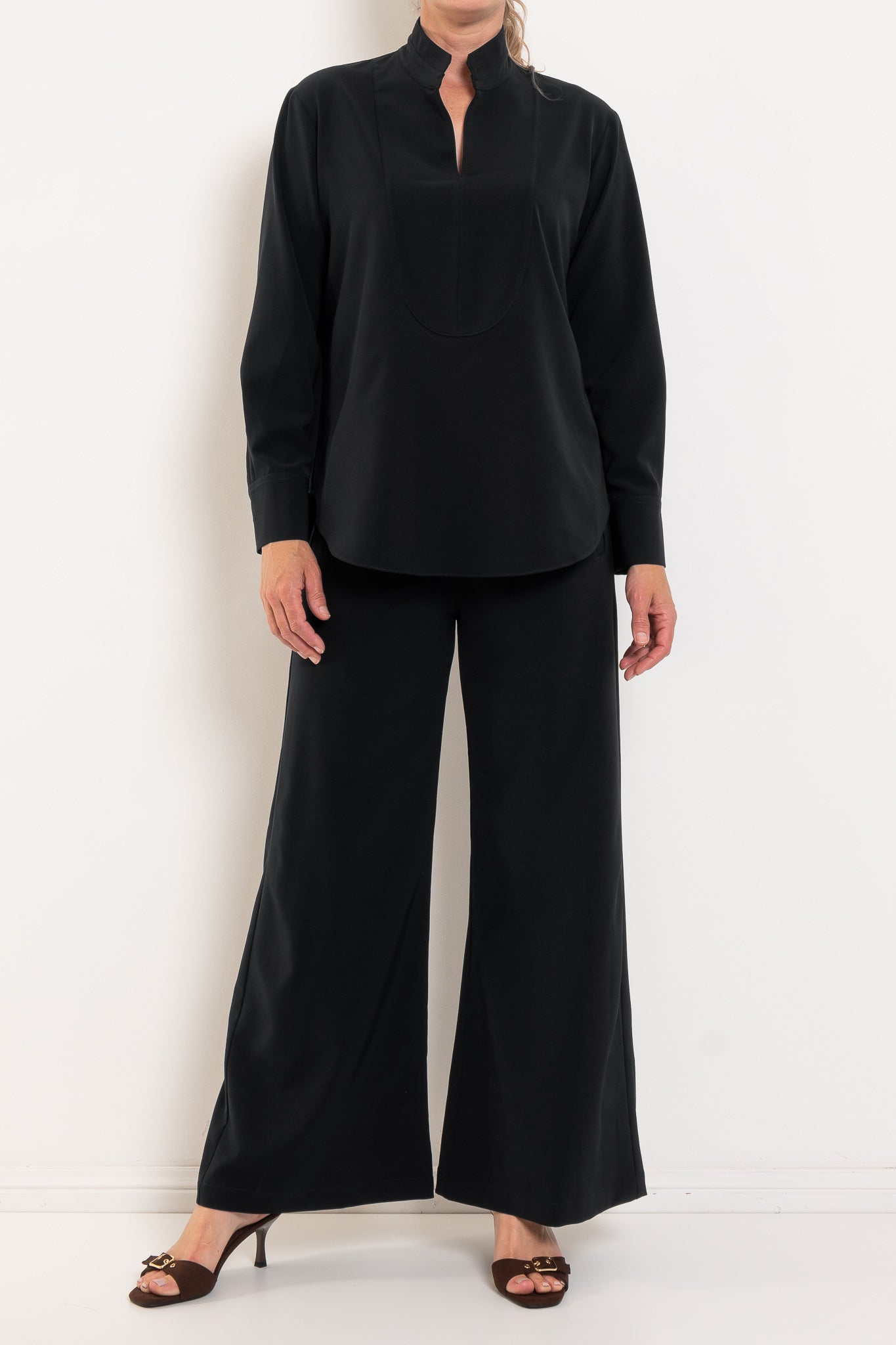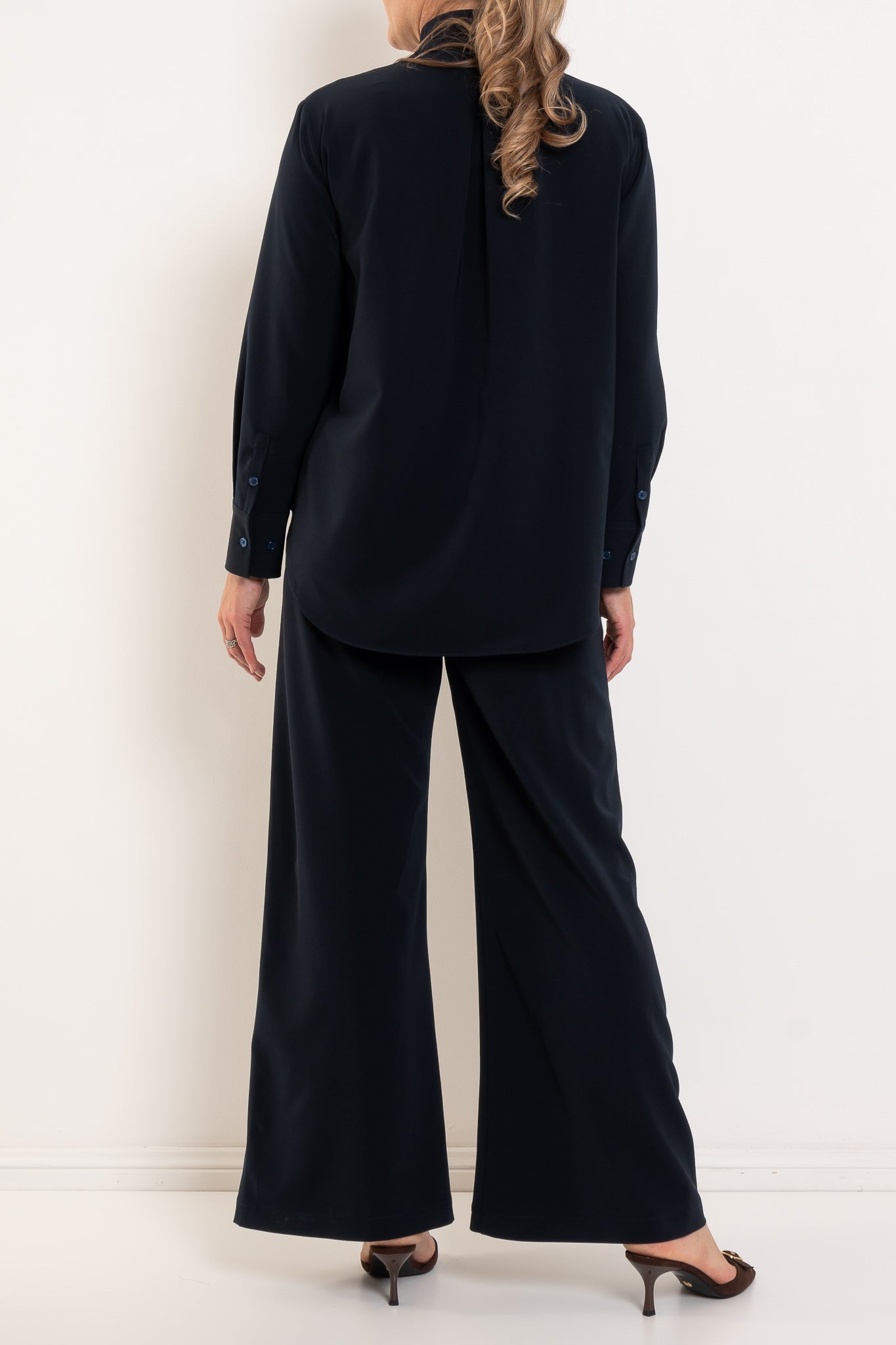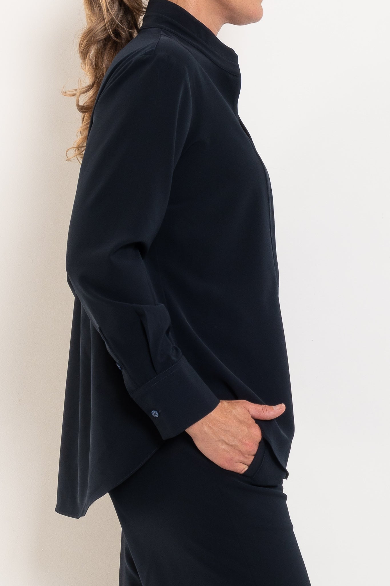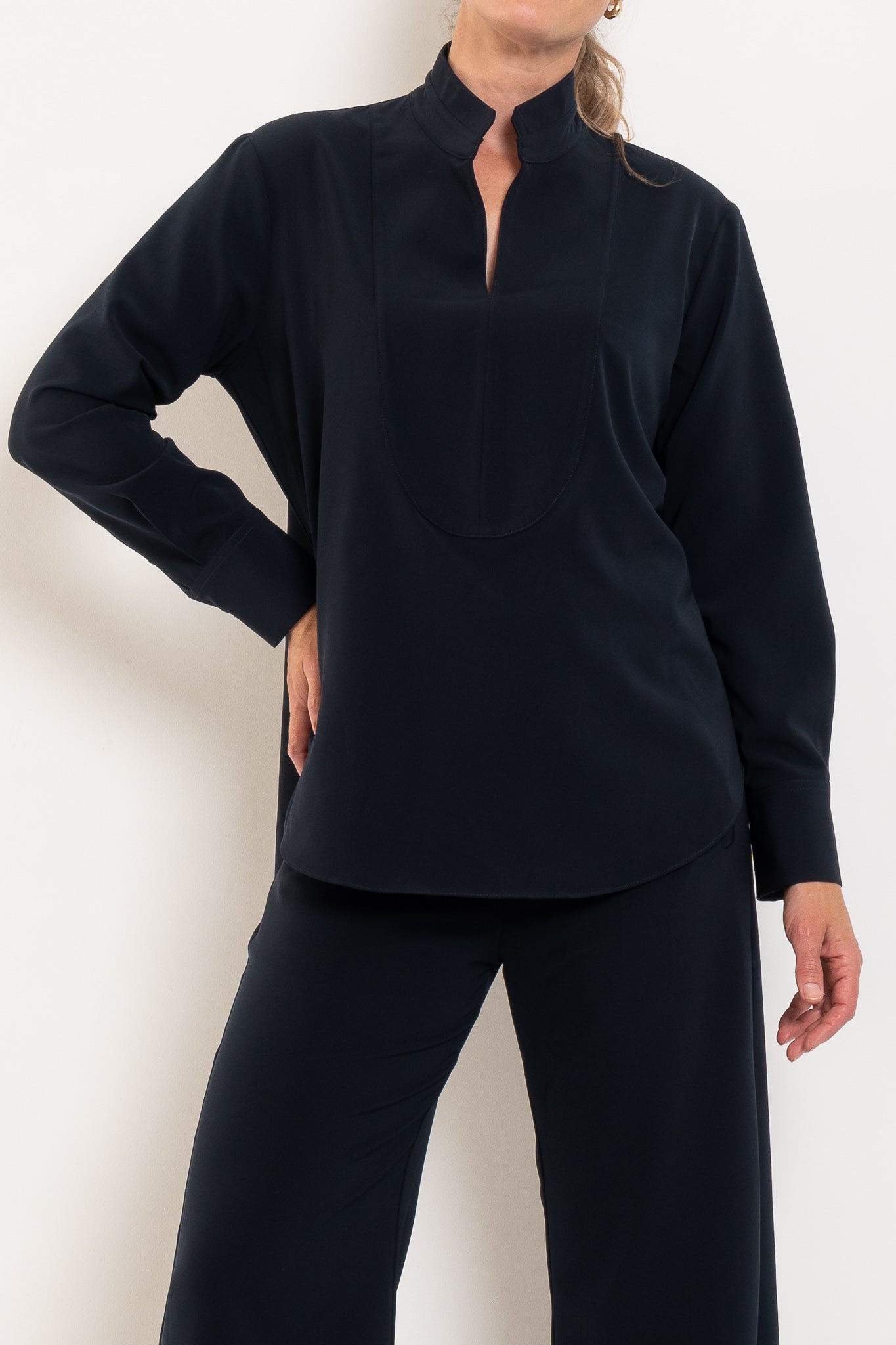 Crafted from Mela Purdie’s innovative Flex Weave, this refined shirt offers the perfect balance of structure and stretch. The minimalist twill weave has a smooth matte finish that feels modern and sophisticated, while the four-way stretch ensures all-day comfort. Clean lines, a softly curved hem and subtle front yoke detailing elevate the silhouette, making it an easy piece to style from workdays to weekends. Designed to sit beautifully over tailored pants or relaxed separates, it’s the kind of elevated essential that quickly becomes a wardrobe favourite.
