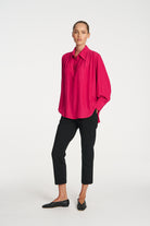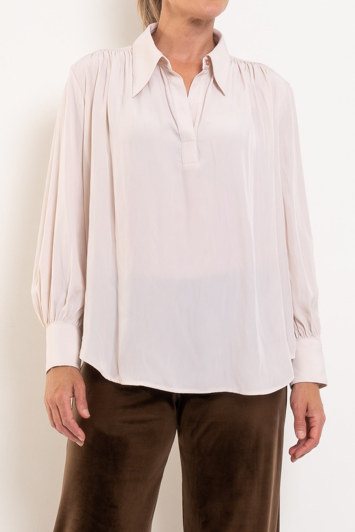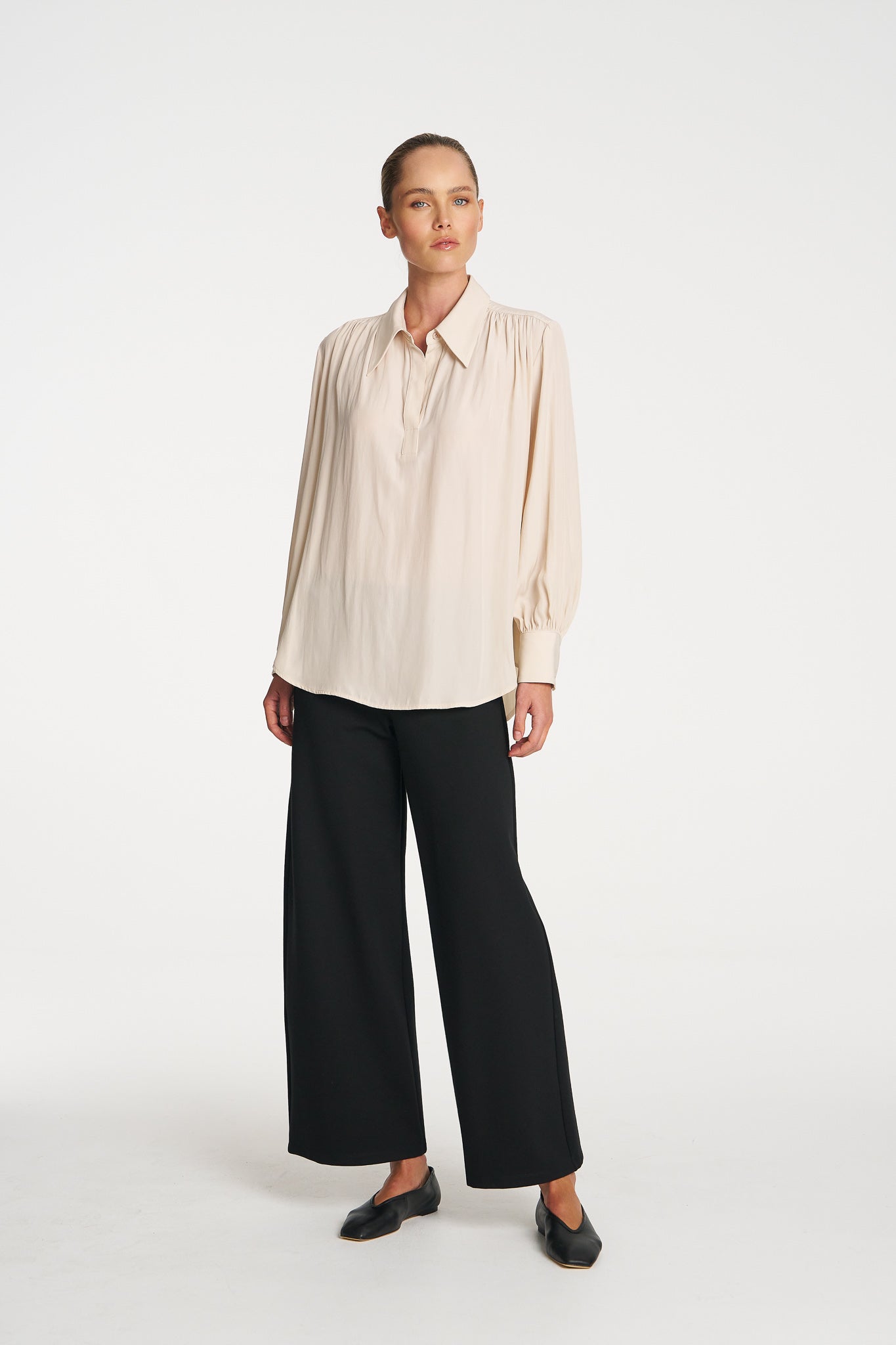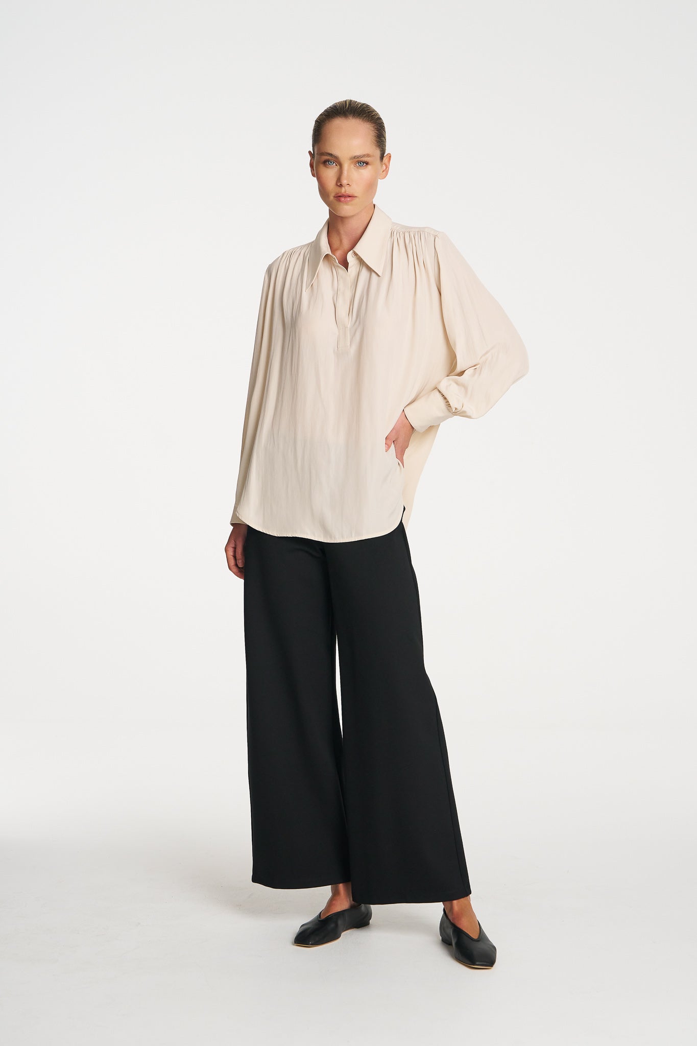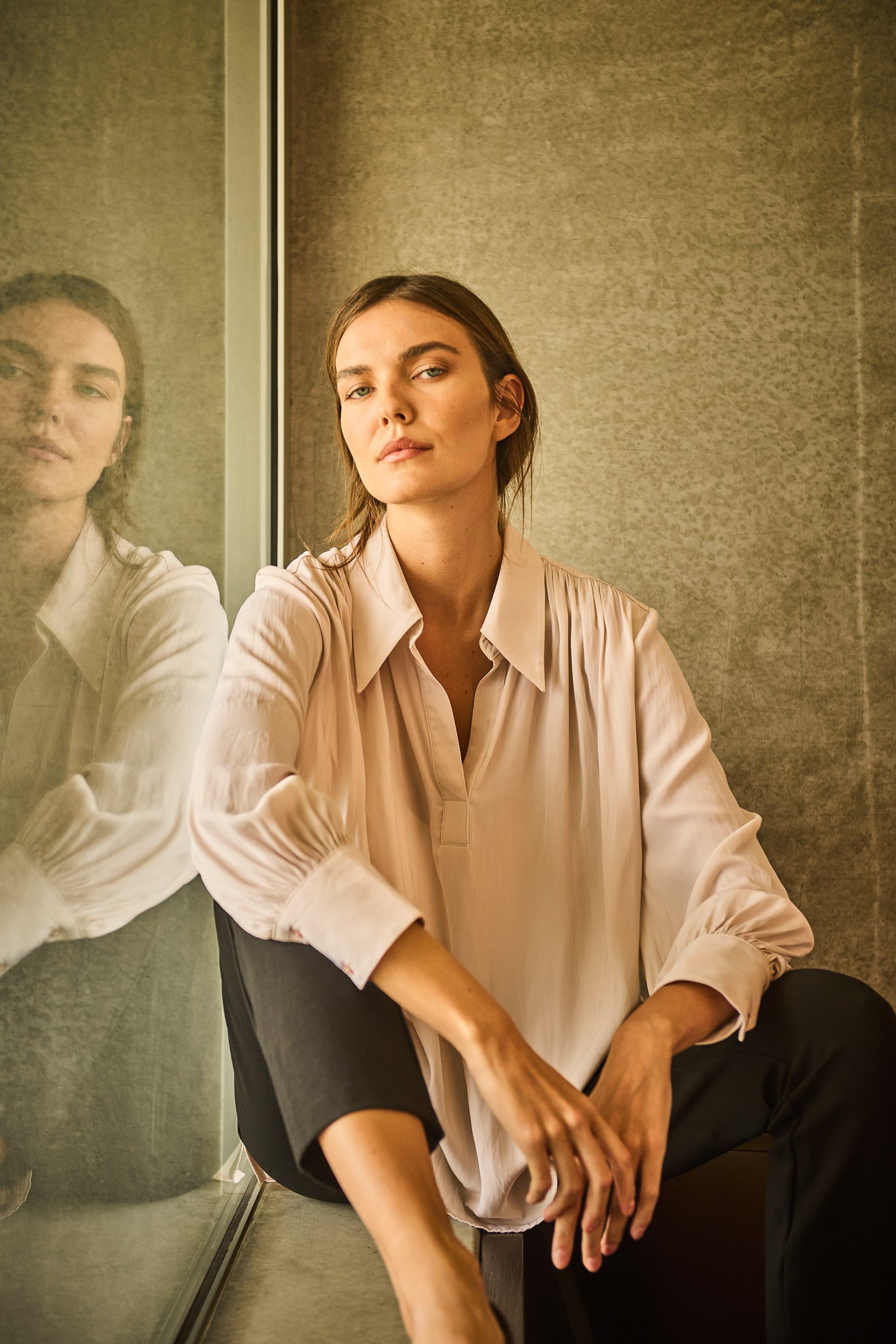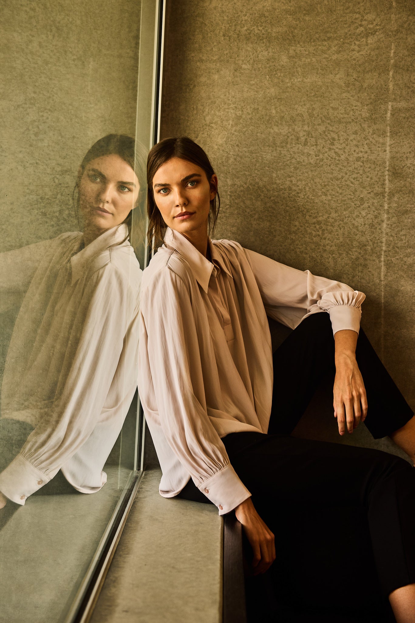 Crafted from Mela Purdie’s signature Mache, a fine denier technical weave known for its lightweight feel, fluid drape and subtle lustre. The Gathered Blouse reimagines a classic shirt silhouette with softly gathered shoulder seams and full sleeves that fall into classic cuffs, creating gentle volume and movement. A crisp collar and partial placket keep the look polished, while the relaxed shape allows the fabric’s beautiful fluidity to shine. An elegant piece that transitions seamlessly from refined workwear to relaxed weekend styling.