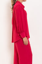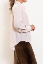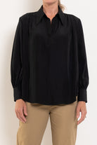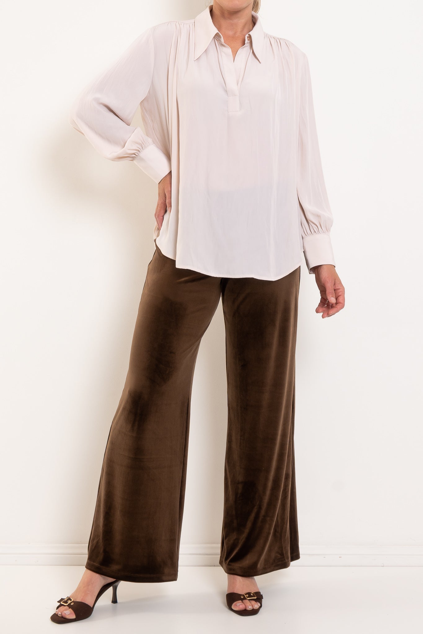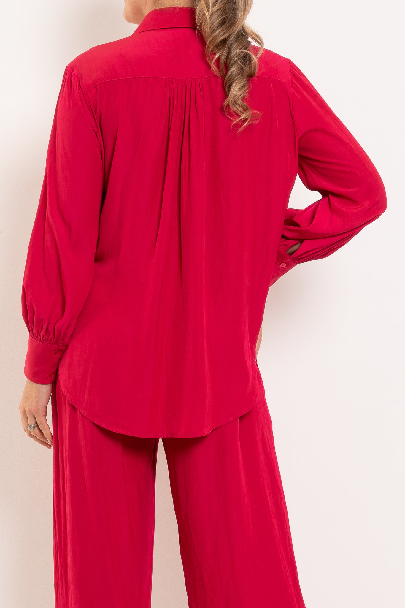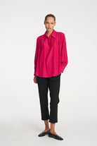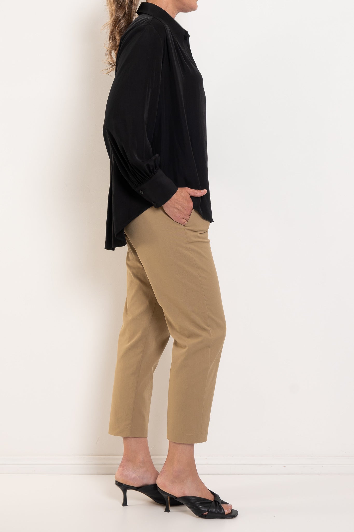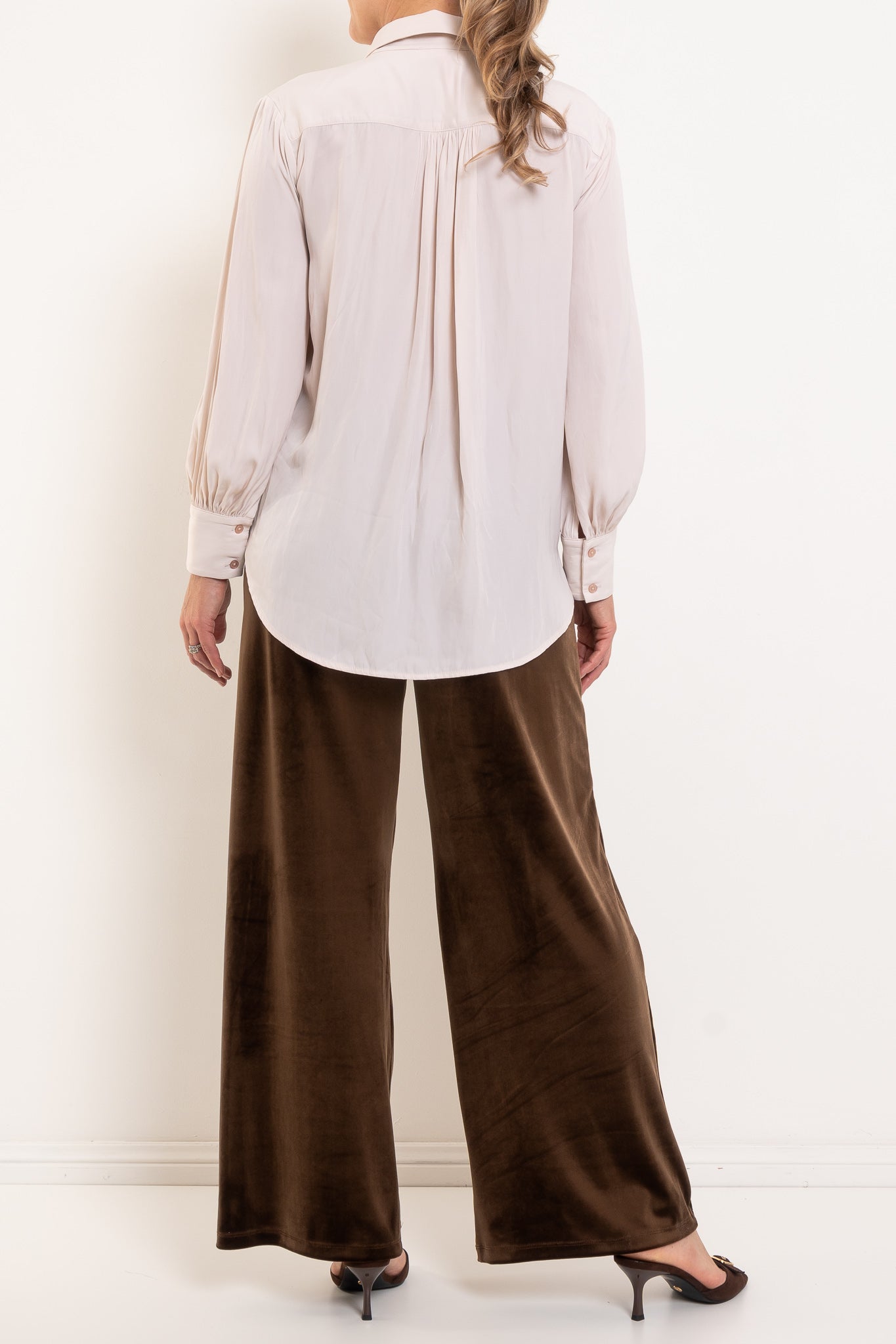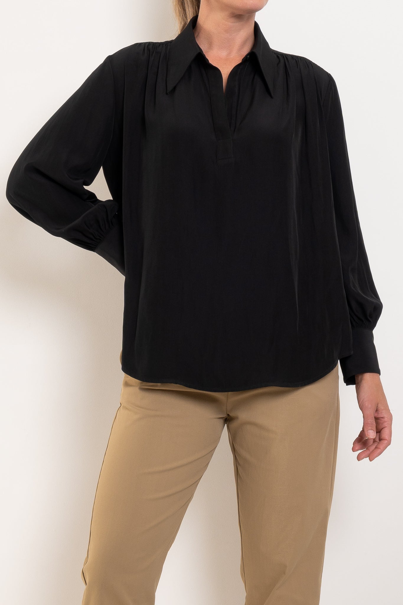 Crafted from Mela Purdie’s signature Mache, a fine denier technical weave known for its lightweight feel, fluid drape and subtle lustre. The Gathered Blouse reimagines a classic shirt silhouette with softly gathered shoulder seams and full sleeves that fall into classic cuffs, creating gentle volume and movement. A crisp collar and partial placket keep the look polished, while the relaxed shape allows the fabric’s beautiful fluidity to shine. An elegant piece that transitions seamlessly from refined workwear to relaxed weekend styling.