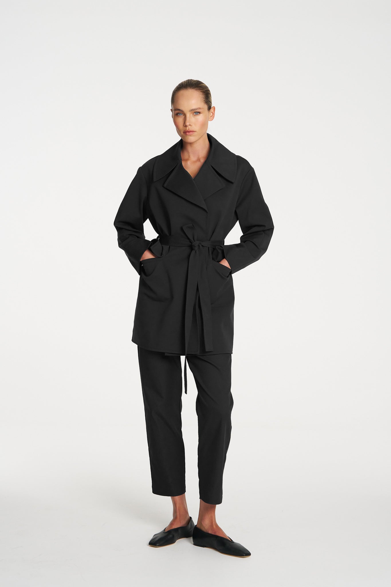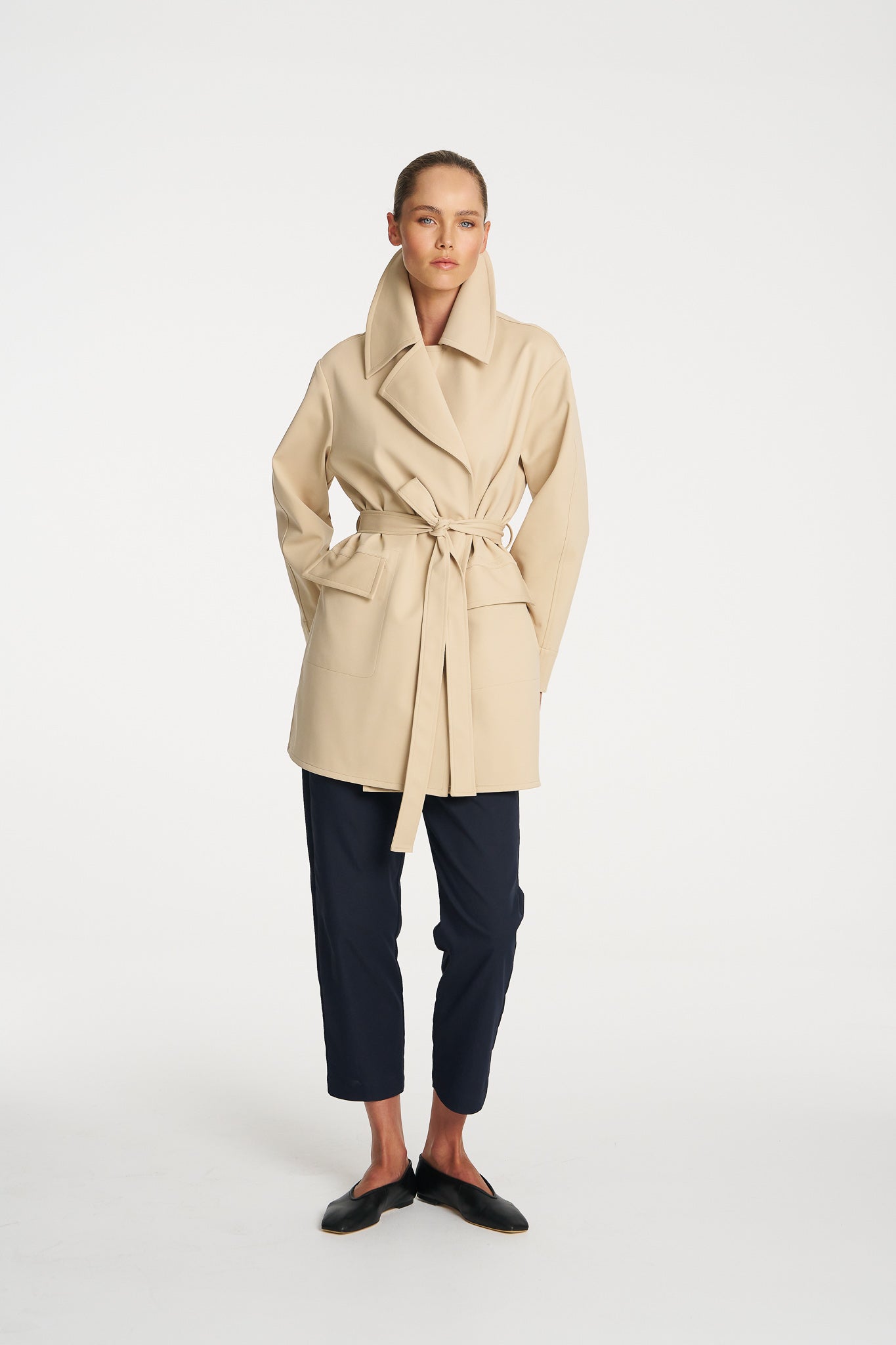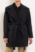 Crafted from Mela Purdie’s new Ultra Knit, this structured double knit offers durability, warmth and exceptional comfort while maintaining a clean, sophisticated silhouette. Designed with a dramatic lapel collar and wrap front closure, the style cinches at the waist with a self-tie belt to create shape while still allowing easy layering over winter wardrobes. Finished with practical welt pockets and a polished mid-length cut, the Wrap Trench is a versatile outer layer that moves seamlessly from weekday tailoring to weekend dressing.