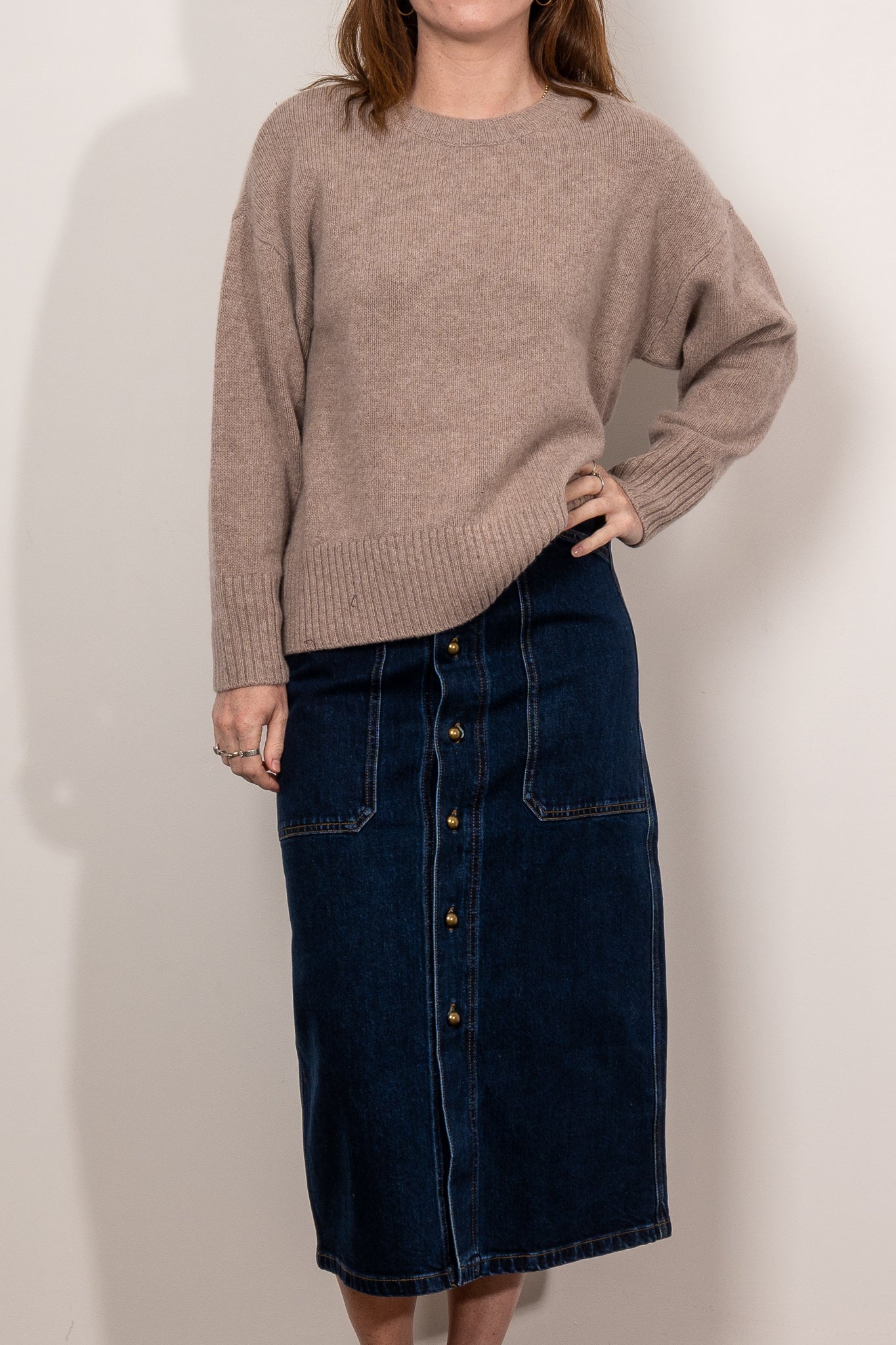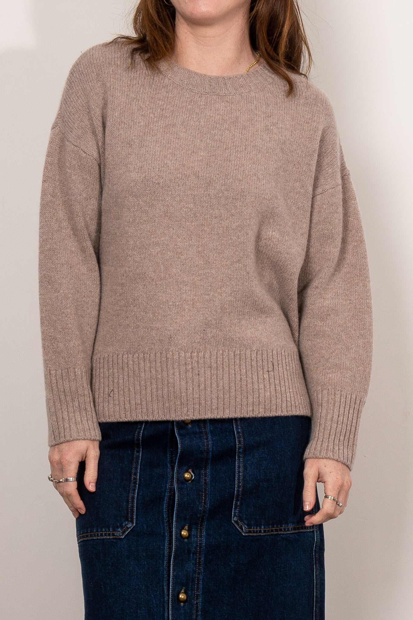 Stay warm and stylish with the Mia Fratino Fleur Crew. Made from a luxurious cashmere merino blend, this sweater features a high crew neck and a relaxed fit for ultimate comfort. The earthy and versatile pebble colour adds a touch of natural beauty to any outfit. Stay cosy and chic in this must-have piece.