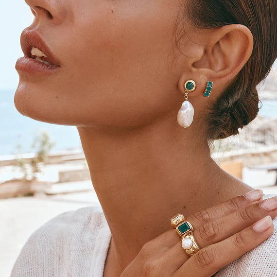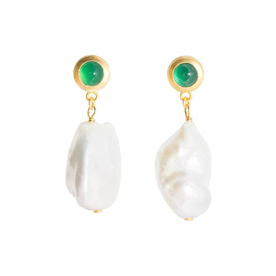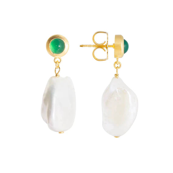 These modern earrings feature an illuminating aventurine stone perched above a  keshi pearl. These earrings are versatile, lightweight and add a sense of nostalgia and luxury to your outfit.